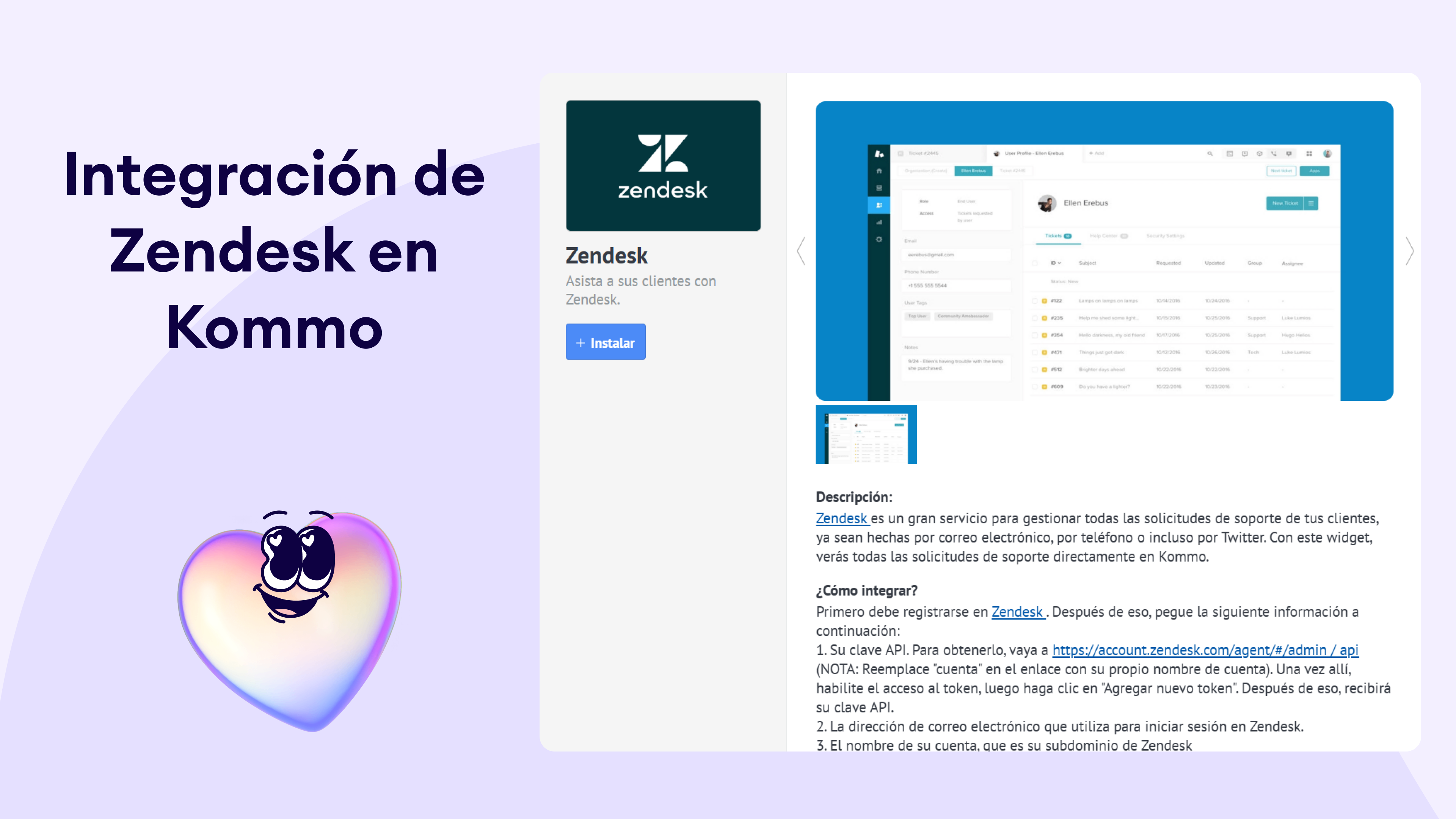 Para conectar Zendesk a Kommo, inicia sesión en tu cuenta de Zendesk y instala la app de Kommo desde el Zendesk Marketplace. A continuación, sigue estos pasos: