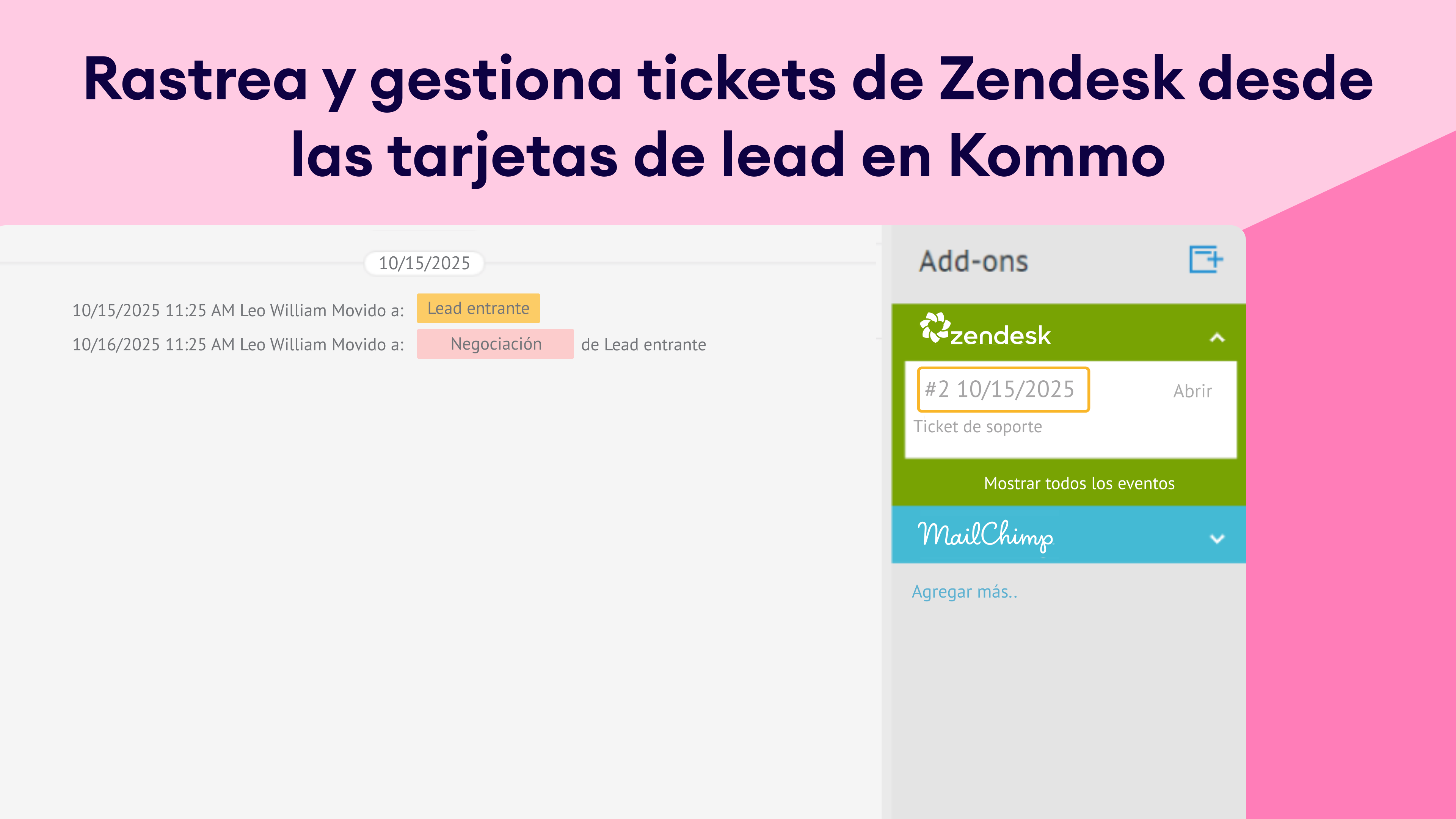 La integración de Zendesk en Kommo centraliza la comunicación de soporte al cliente y ventas. Crea y sigue tickets directamente desde tu CRM, responde de manera eficiente y mantiene un flujo de trabajo continuo entre tus equipos de soporte y ventas.