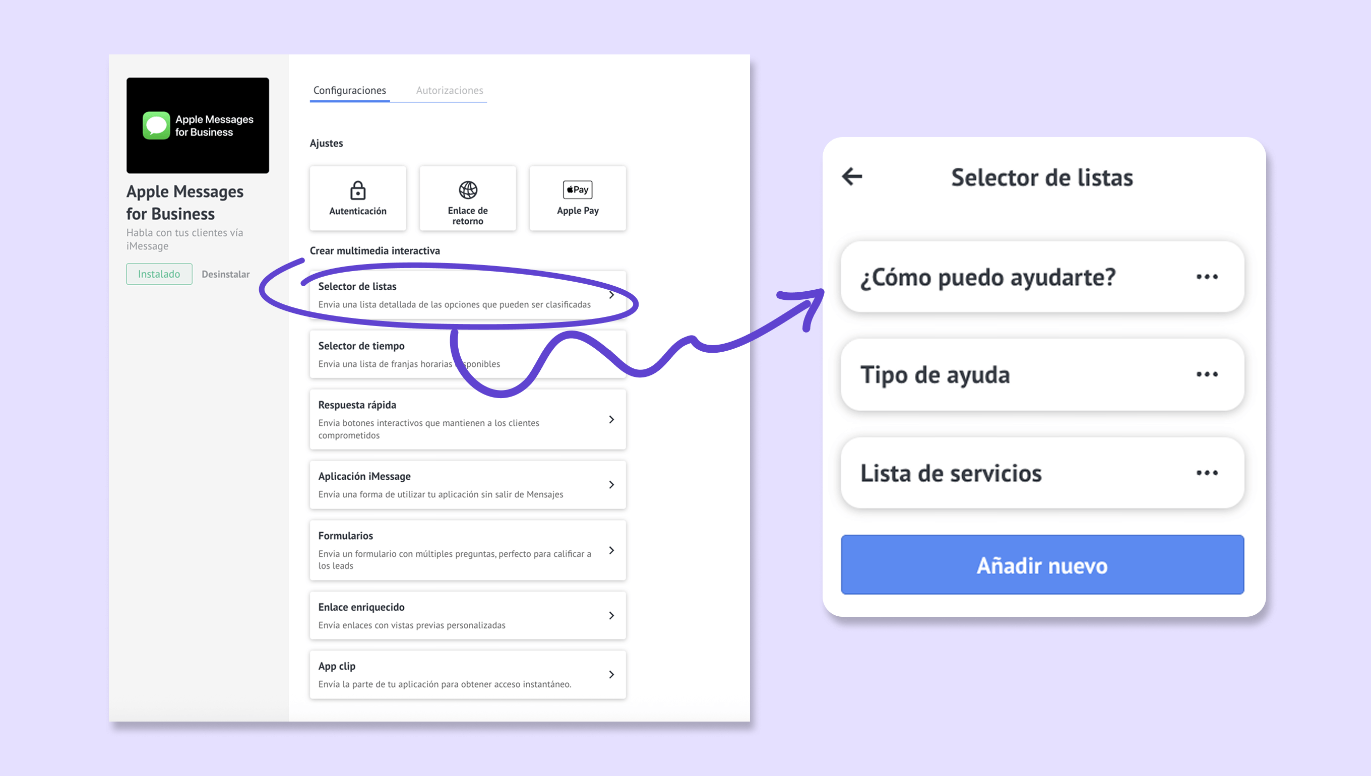 Para crear un selector de listas, ve a Ajustes > Integraciones > Apple Messages for Business y haz clic en Selector de listas > Añadir nuevo: