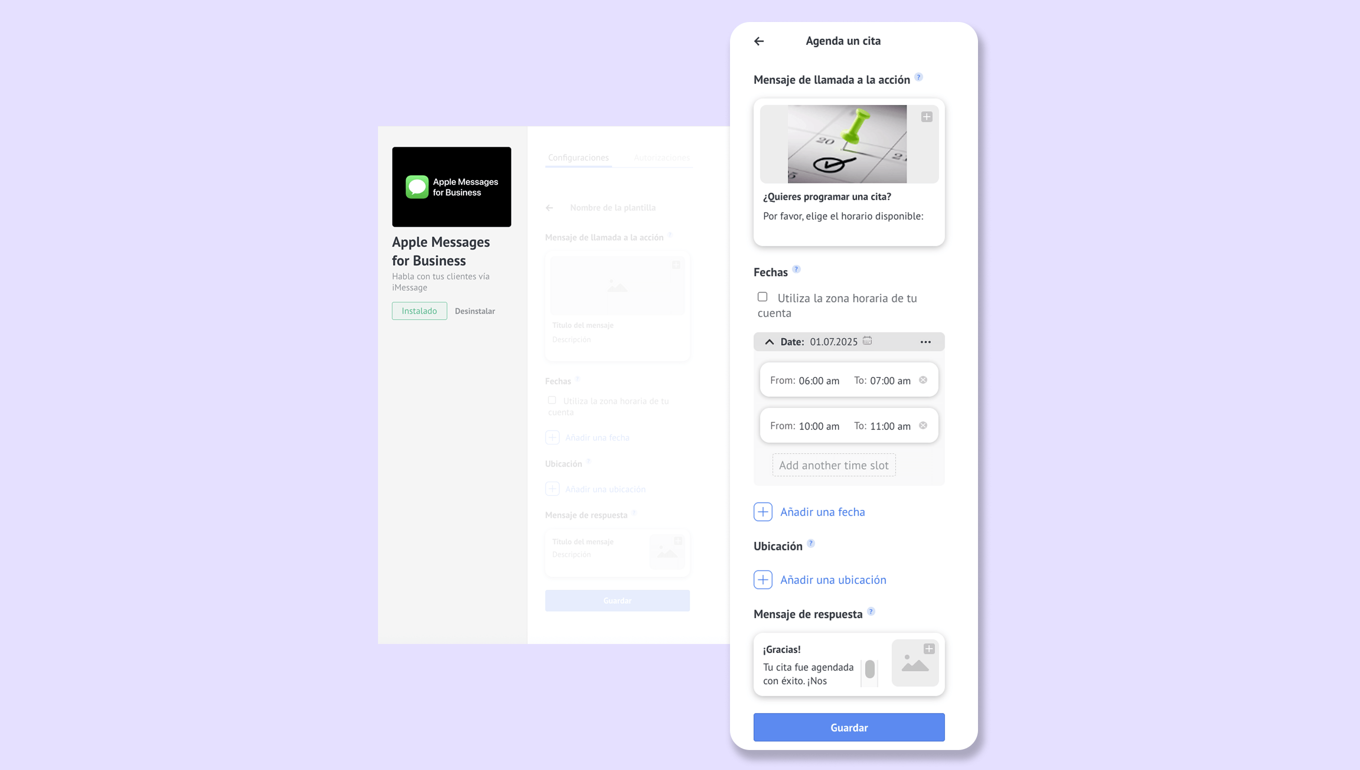 Para crear un selector de tiempo, ve al widget en Ajustes > Integraciones > Apple Messages for Business y selecciona Selector de tiempo > Añadir nuevo: