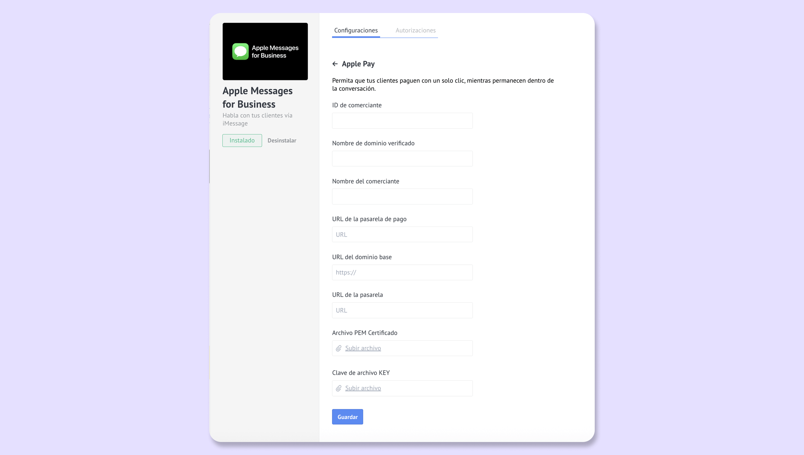 Para habilitar esta opción para tus clientes, ve a Ajustes > Integraciones > Apple Messages for Business, haz clic en Apple Pay: