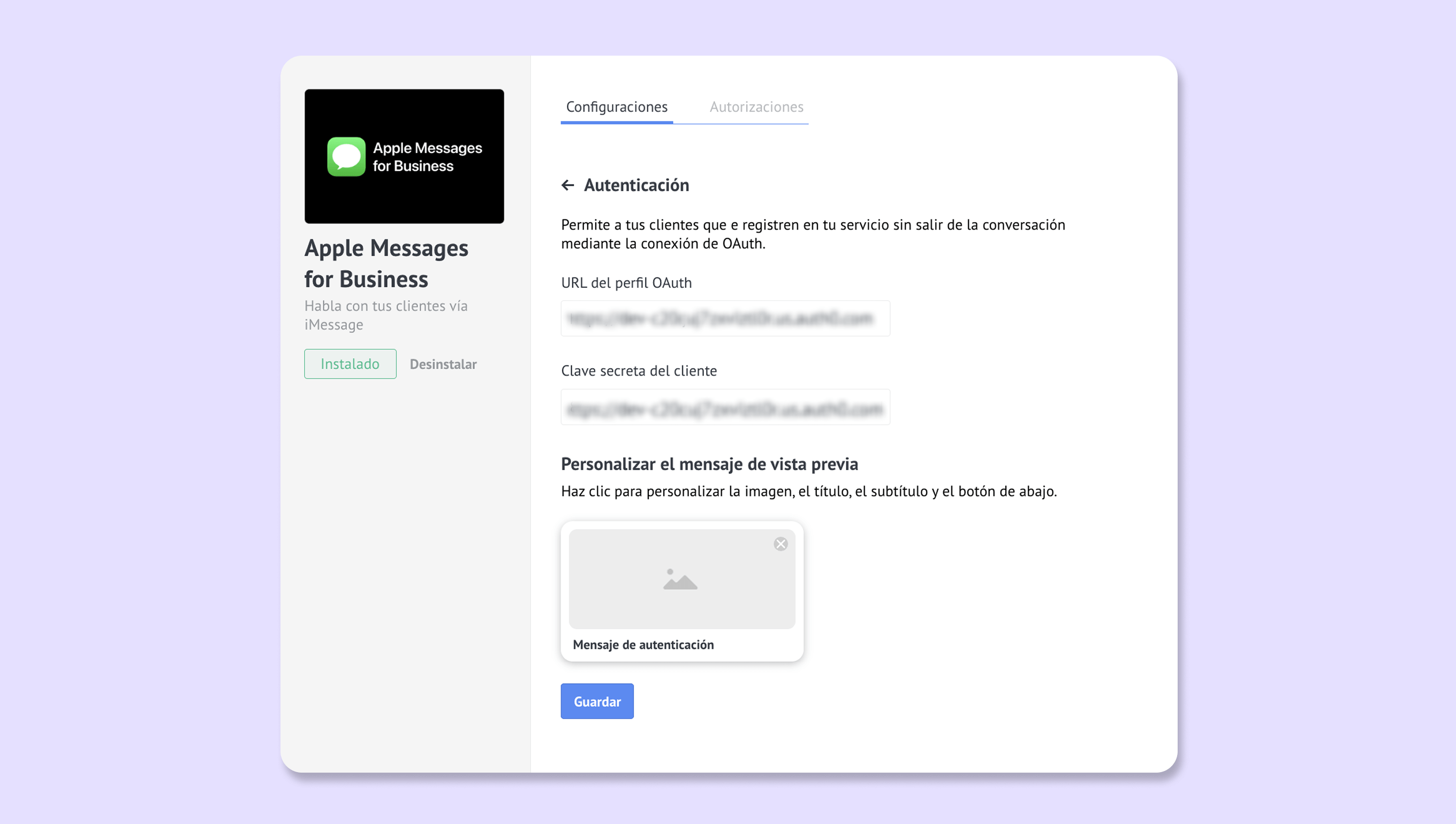 Para configurar OAuth, ve a Ajustes > Integraciones > Apple Messages for Business y haz clic en Autenticación: