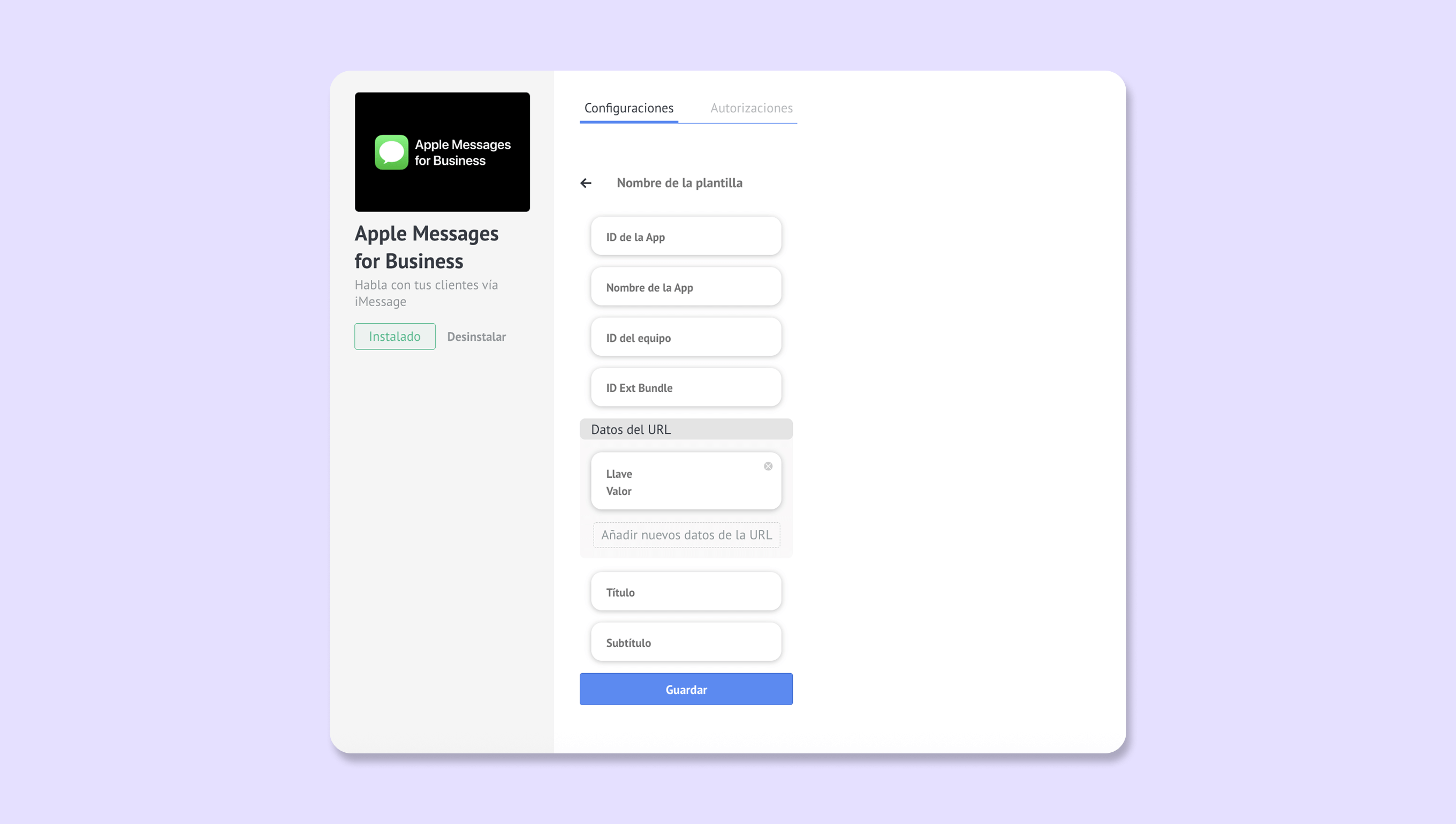 Para añadir tu aplicación, ve a Ajustes > Integración > Apple Messages for Business y haz clic en la aplicación iMessage > Añadir nuevo: