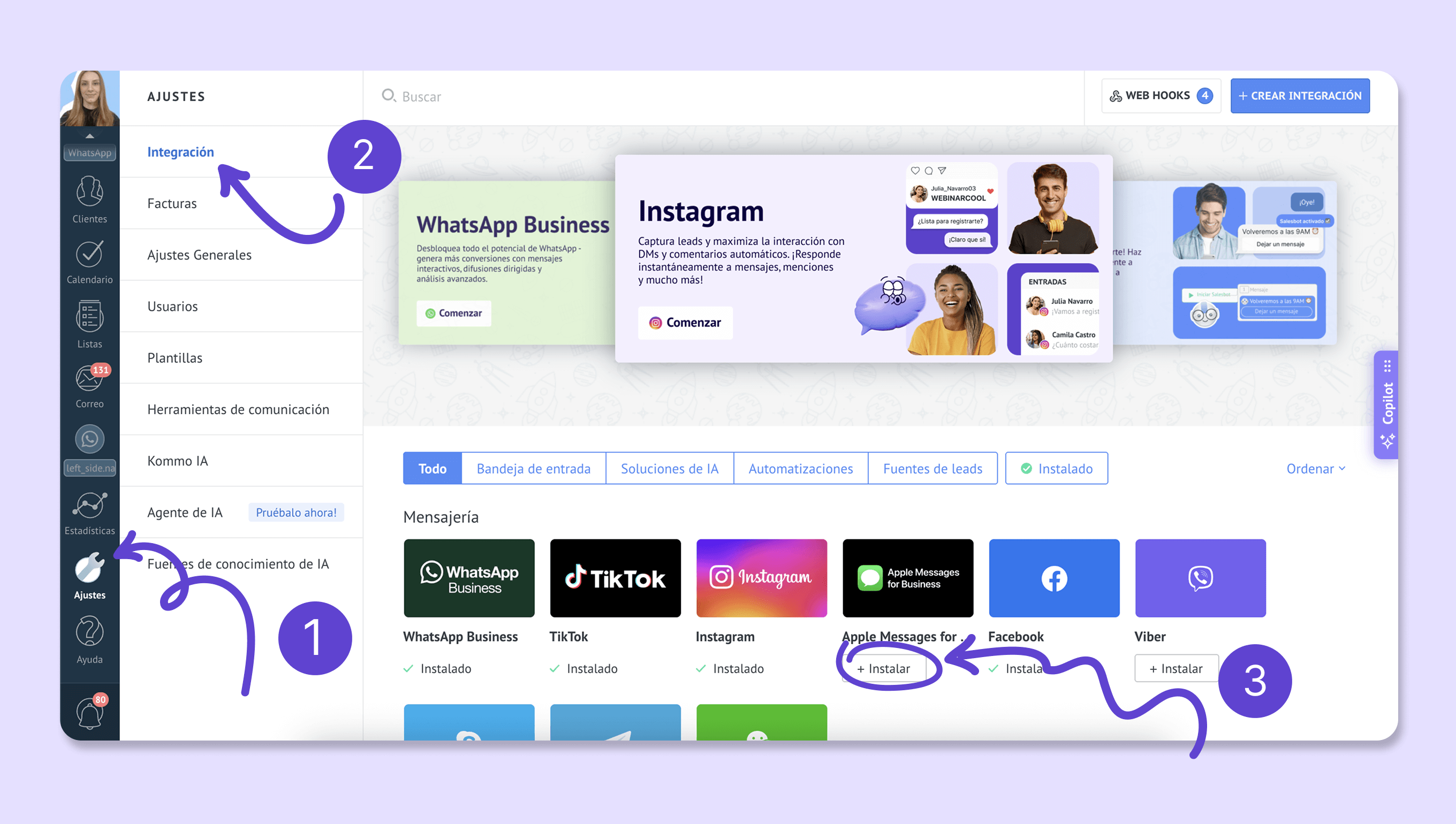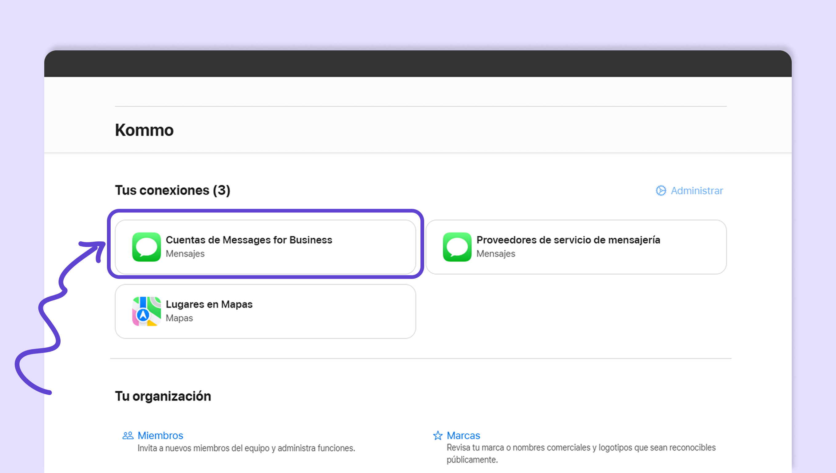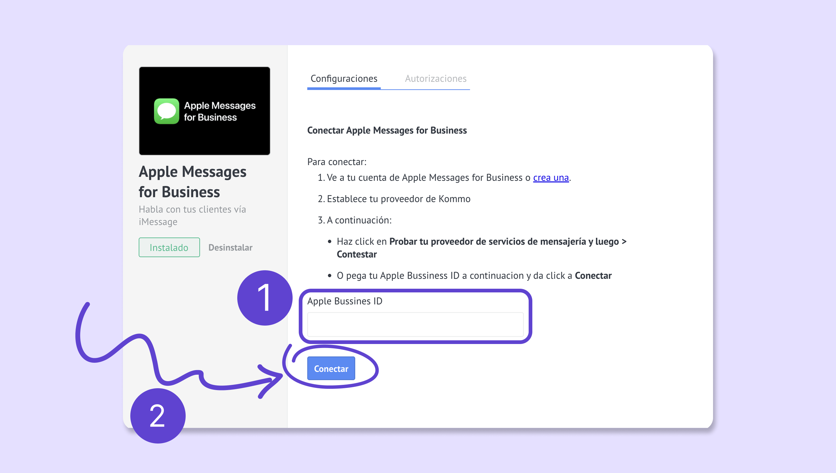 En Kommo, ve a Ajustes → Integración → Apple Messages for Business.