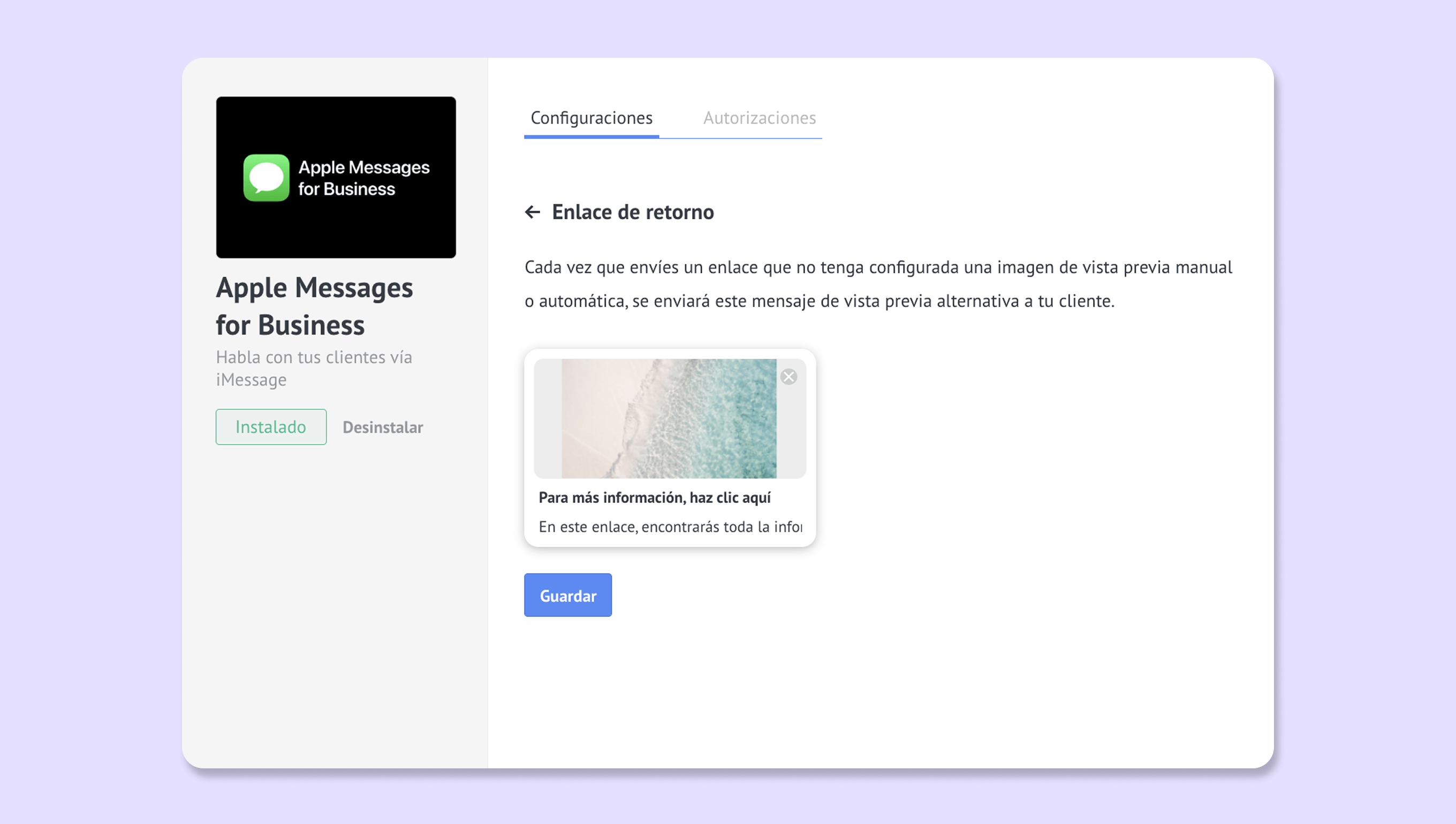 Con el enlace de retorno, puedes establecer una imagen de vista previa para un enlace que no tenga una imagen de vista previa manual o automática. De esta forma, evitas enviar una URL simple al cliente, dándole contexto e identidad de marca.