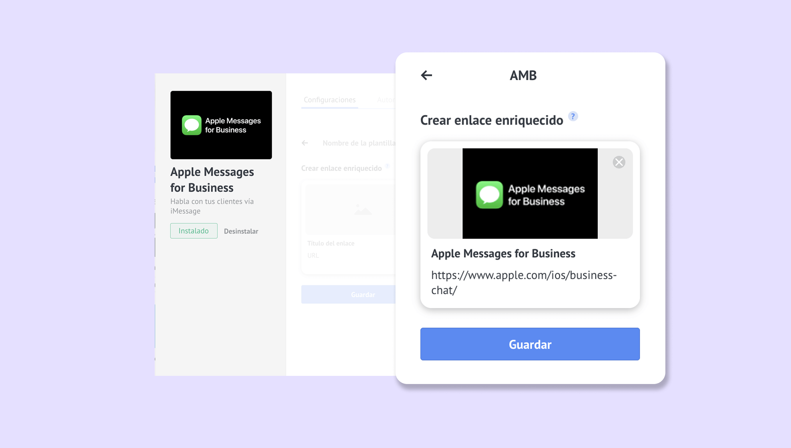 Para configurar un enlace enriquecido, ve a Ajustes > Integración > Apple Messages for Business y haz clic en Enlace enriquecido > Añadir nuevo: