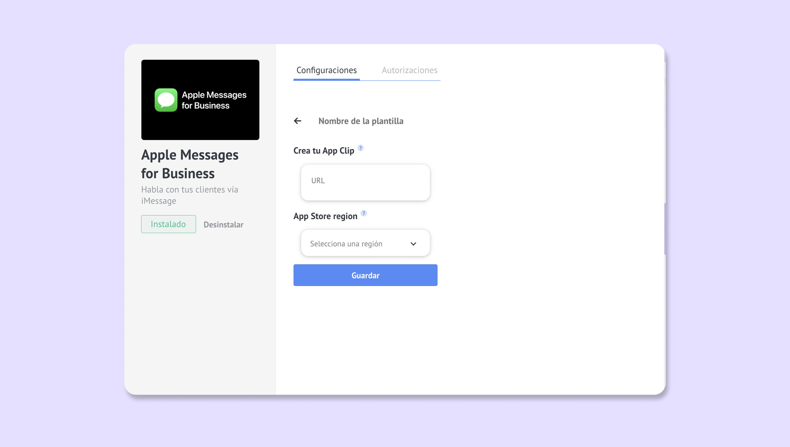Para crear una pequeña parte de tu app, ve a Ajustes > Integración > Apple Messages for Business y haz clic en App clip > Añadir nuevo: