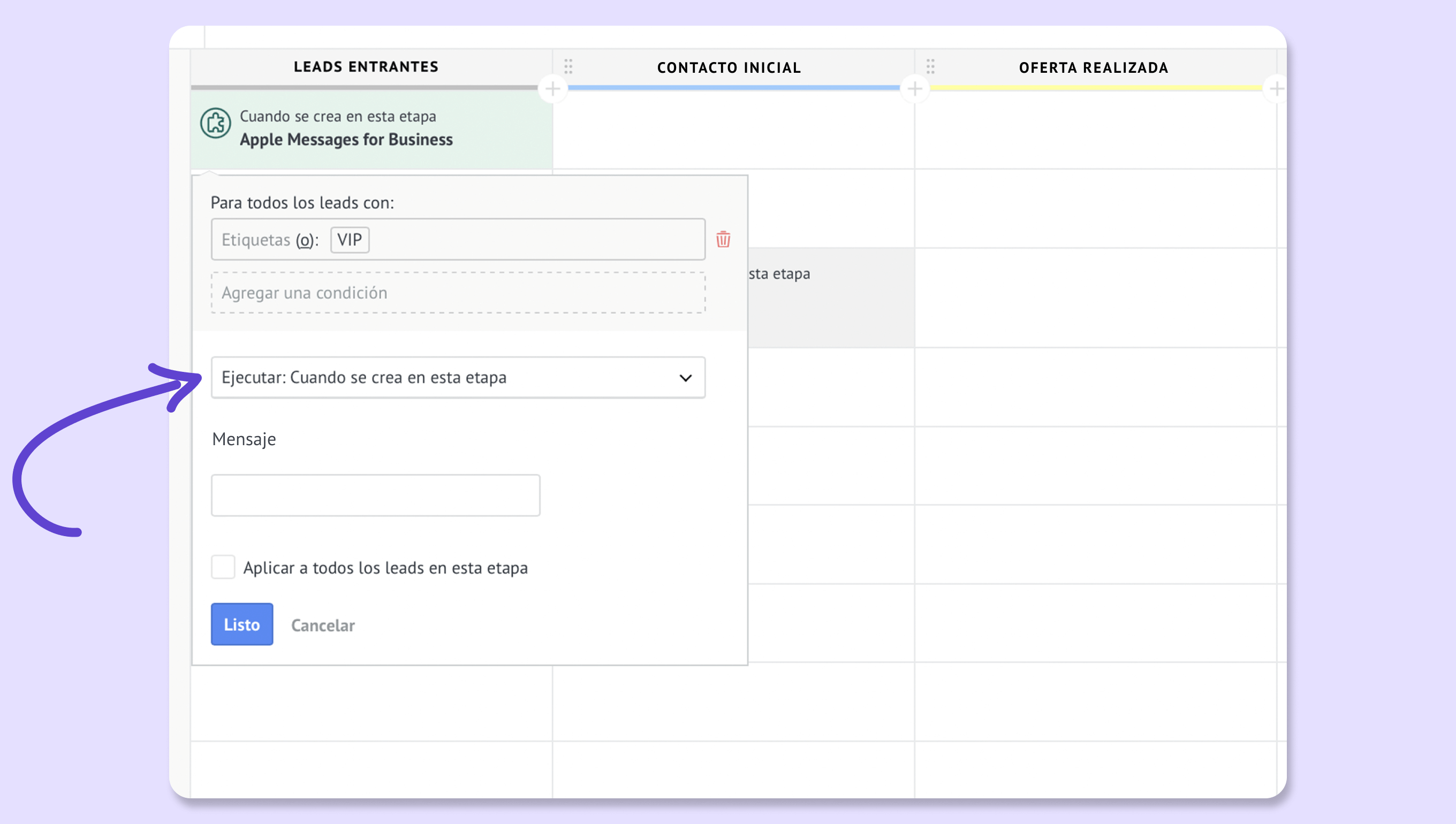 - Haz clic en la etapa del pipeline donde quieras enviar el mensaje.