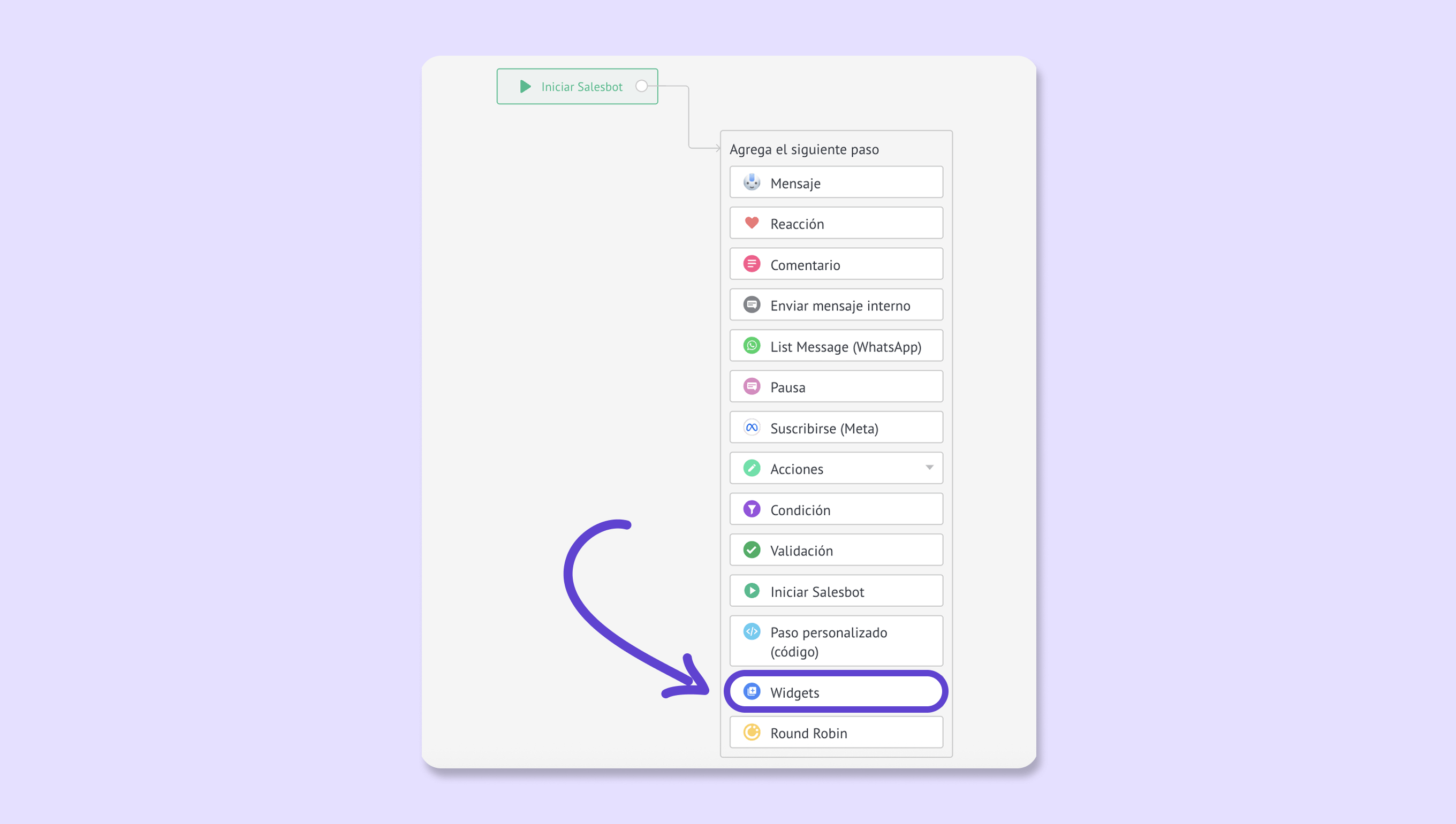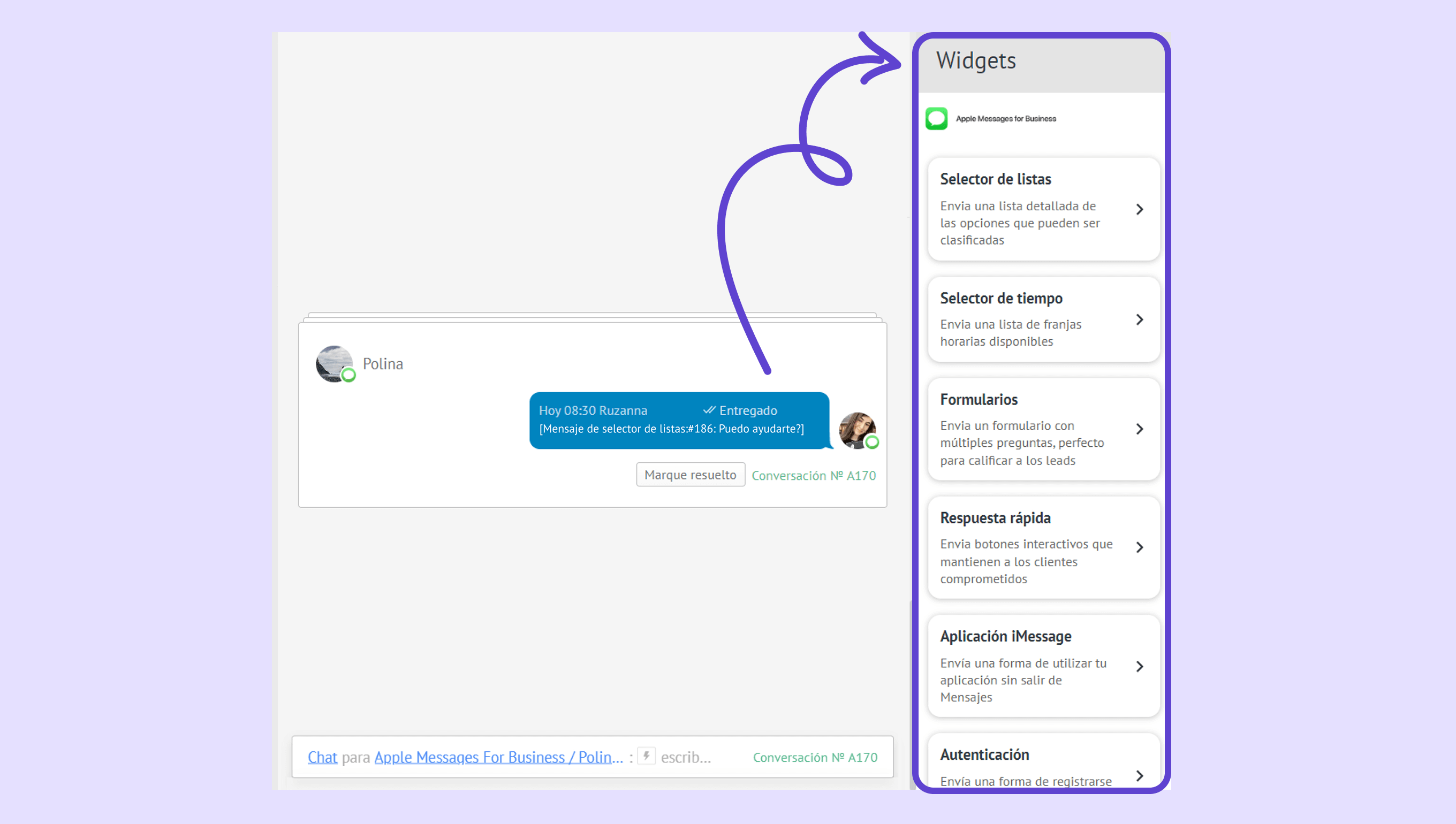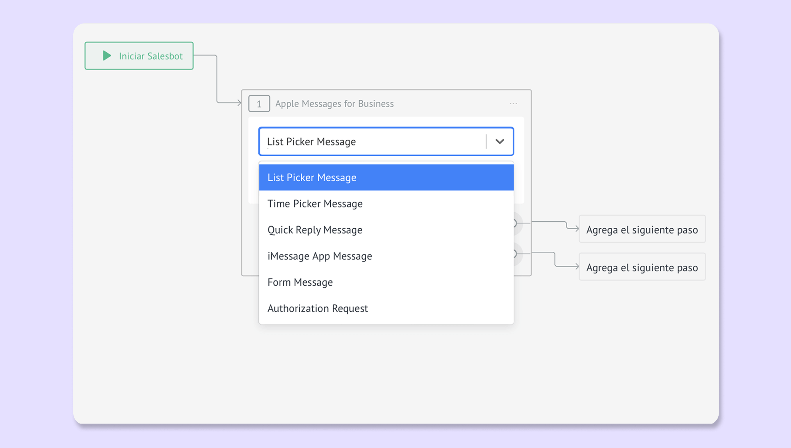 Añade el paso Widget y selecciona Apple Message for Business.