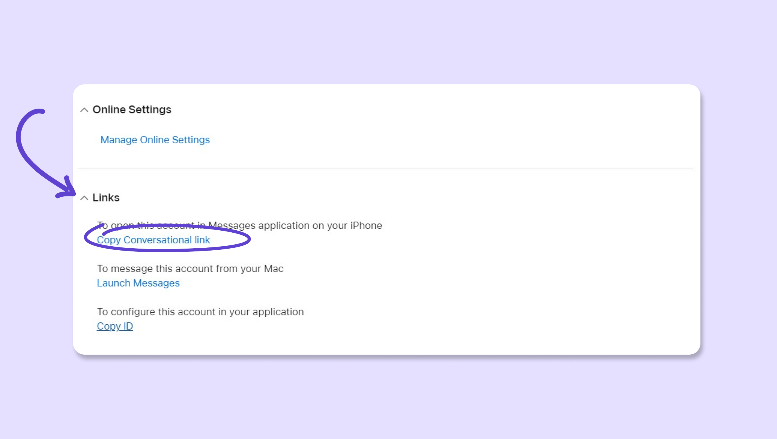 Para obtener el enlace de entrada a tu chat de Apple Messages for Business: