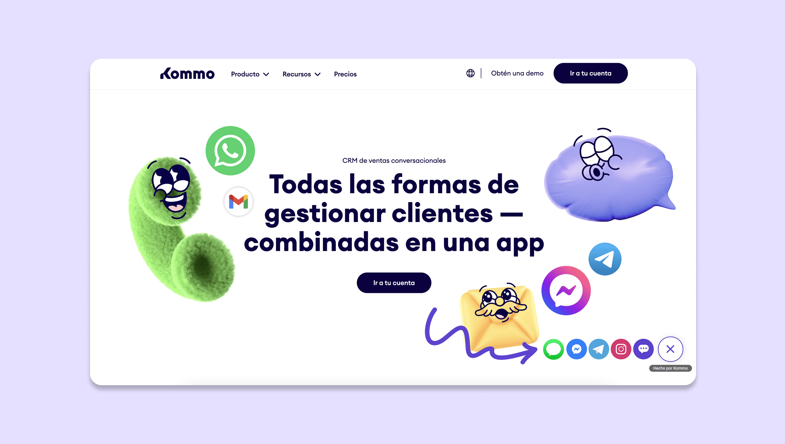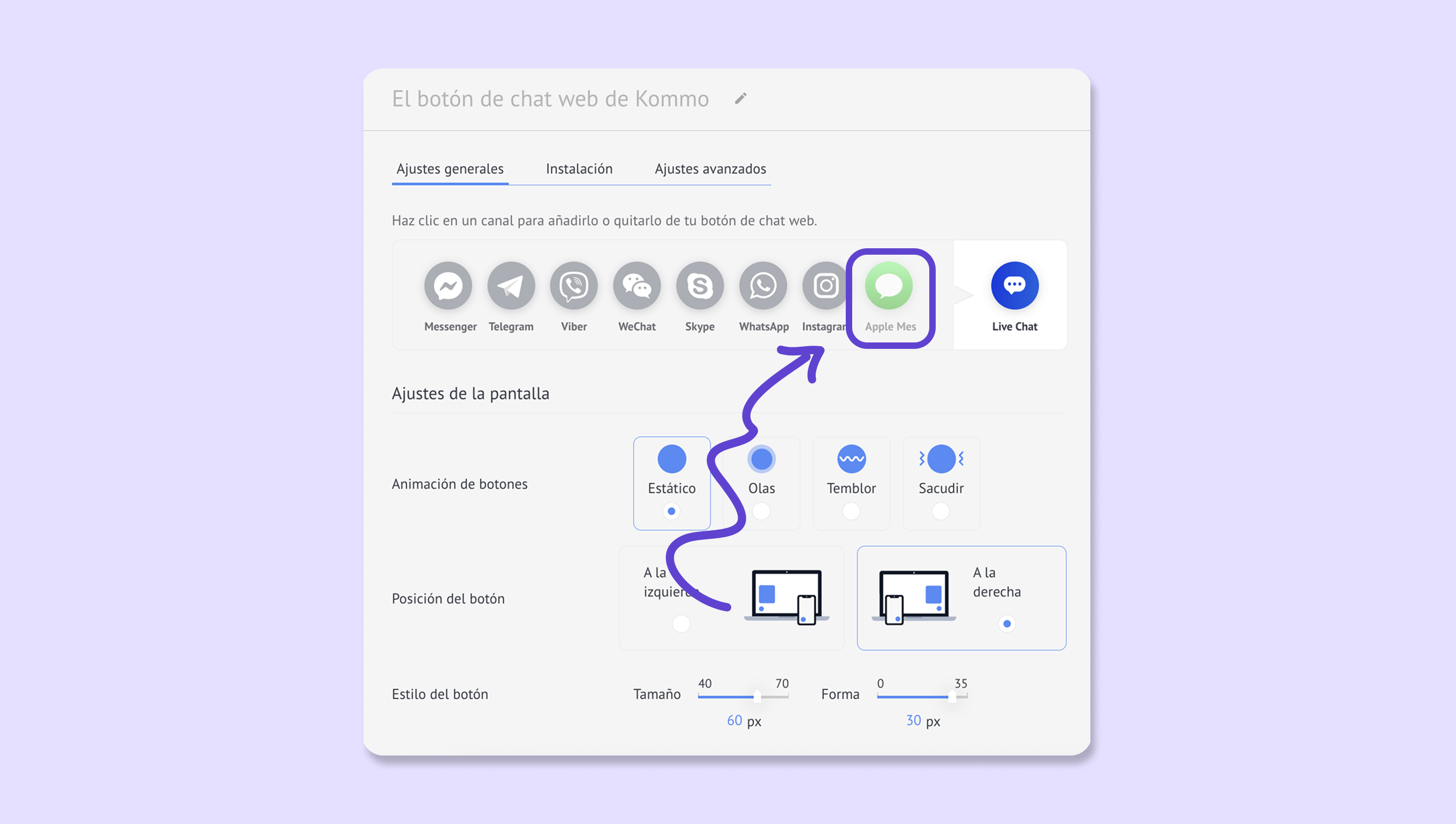 Puedes aumentar la visibilidad de tu marca y hacer que sea más fácil para tus clientes contactarte al integrar tu Apple Messages for Business como una opción de chat en tu sitio web. Para implementar esta estrategia, puedes utilizar el botón de chat web de Kommo.