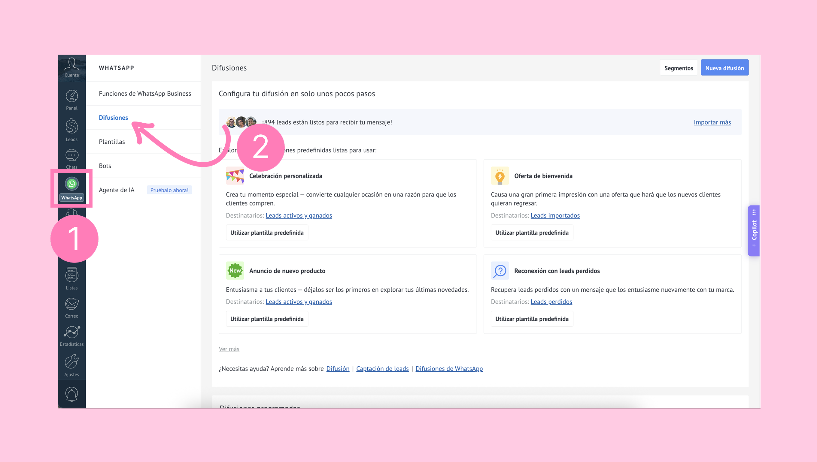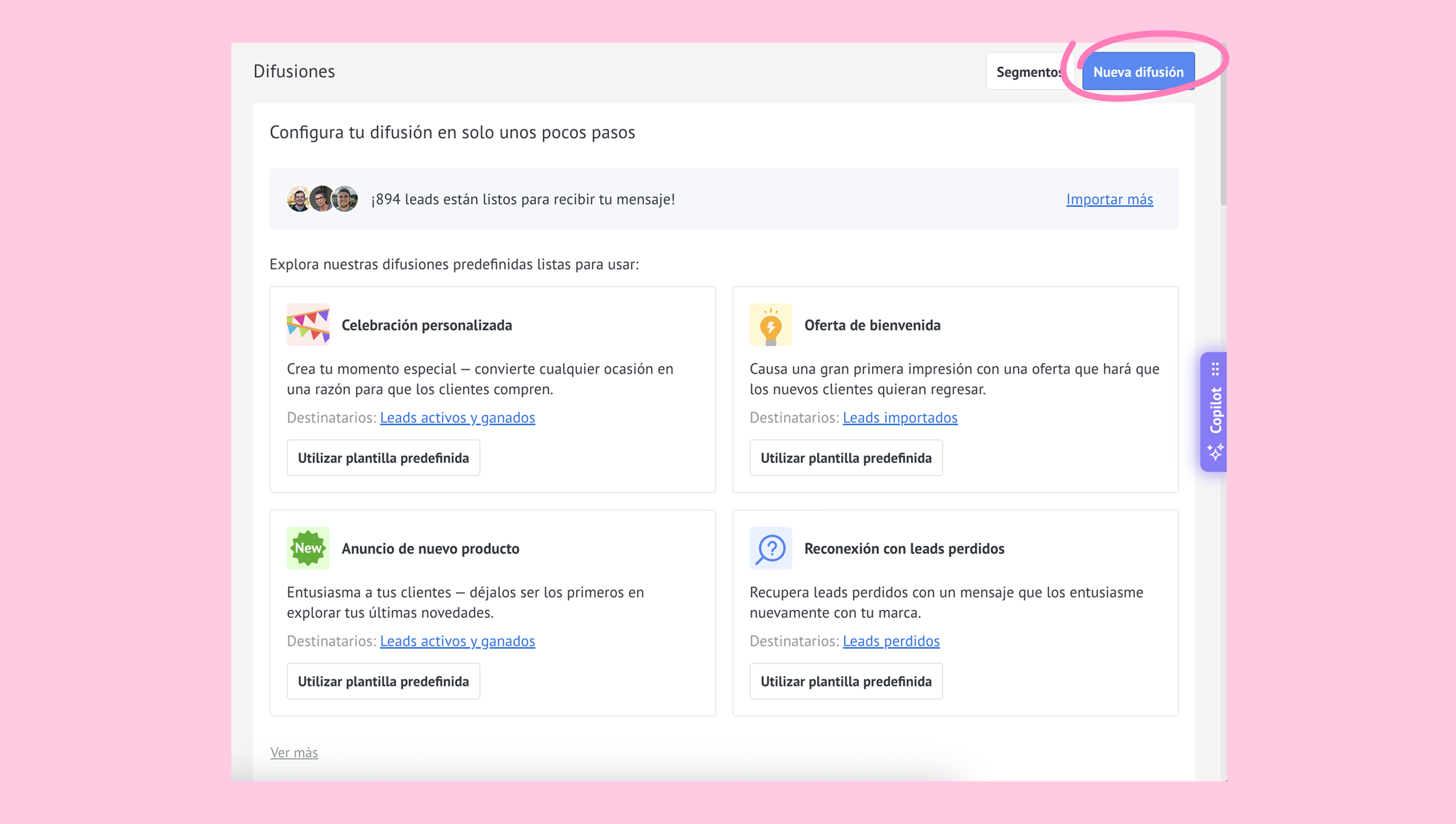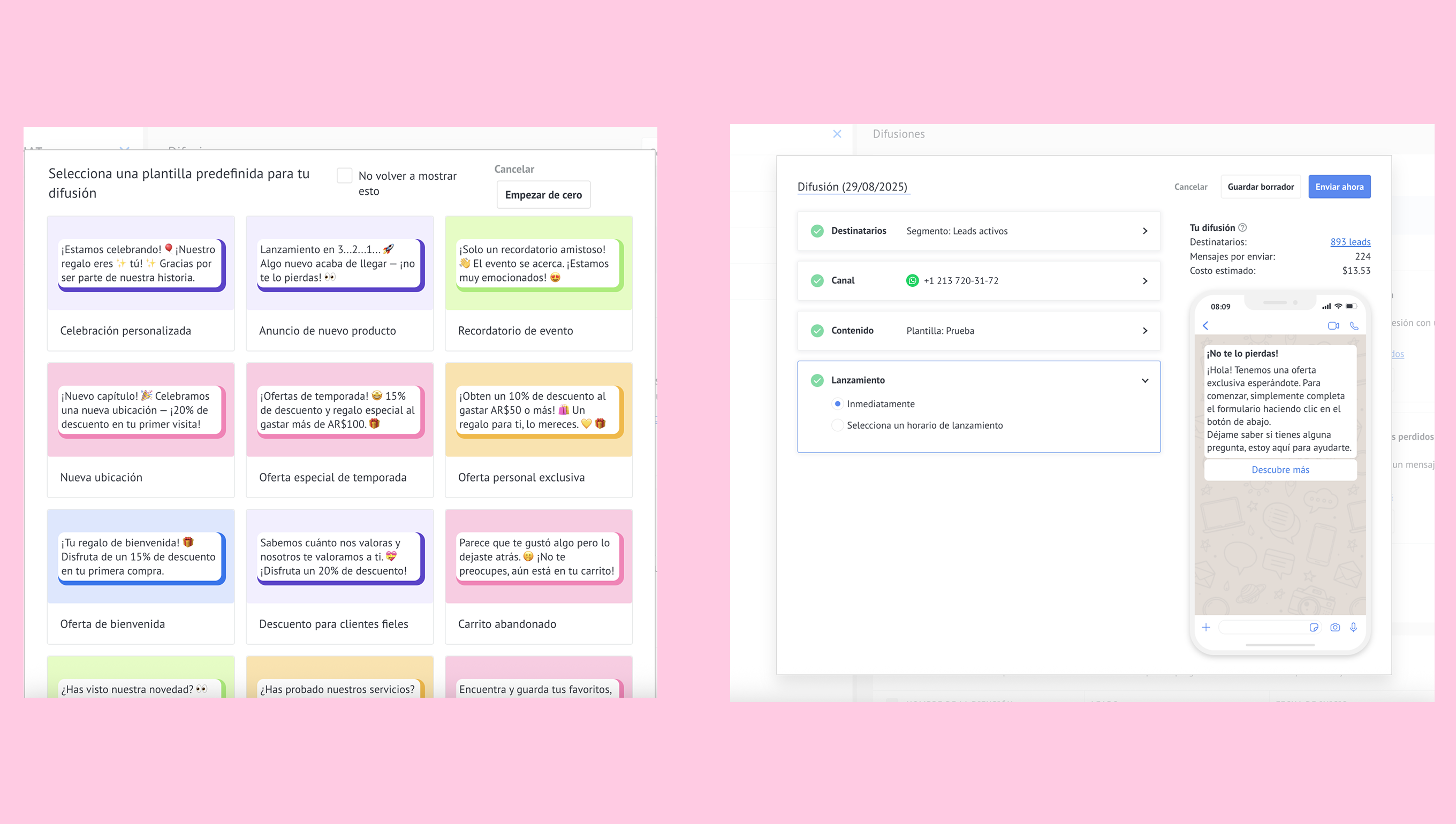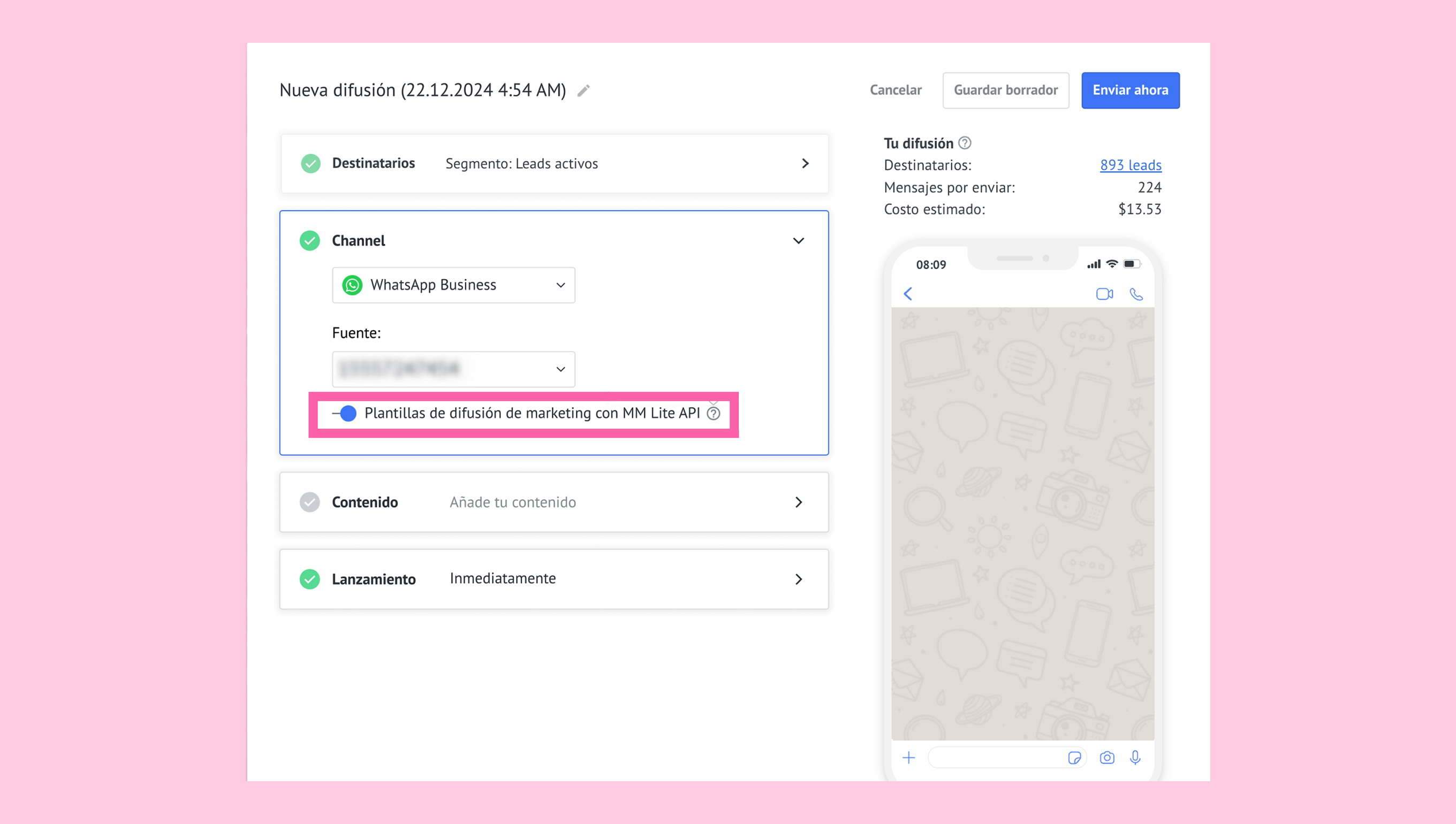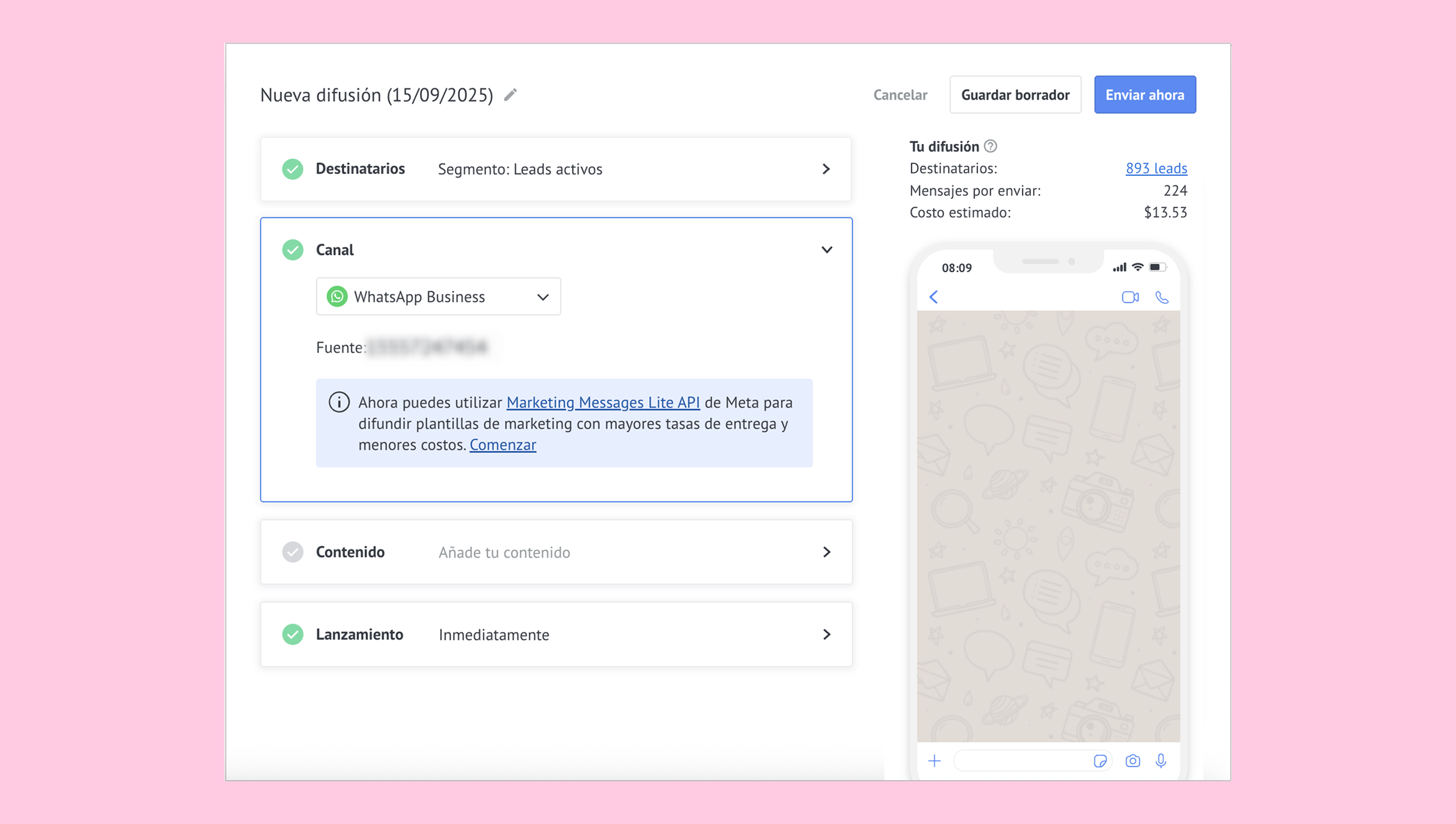 Actualmente, puedes acceder a esta función solo desde la sección Difusiones, y la configuración se realiza en solo unos clics. Para enviar una difusión, puedes reutilizar tus plantillas de marketing previamente aprobadas para Cloud API.
