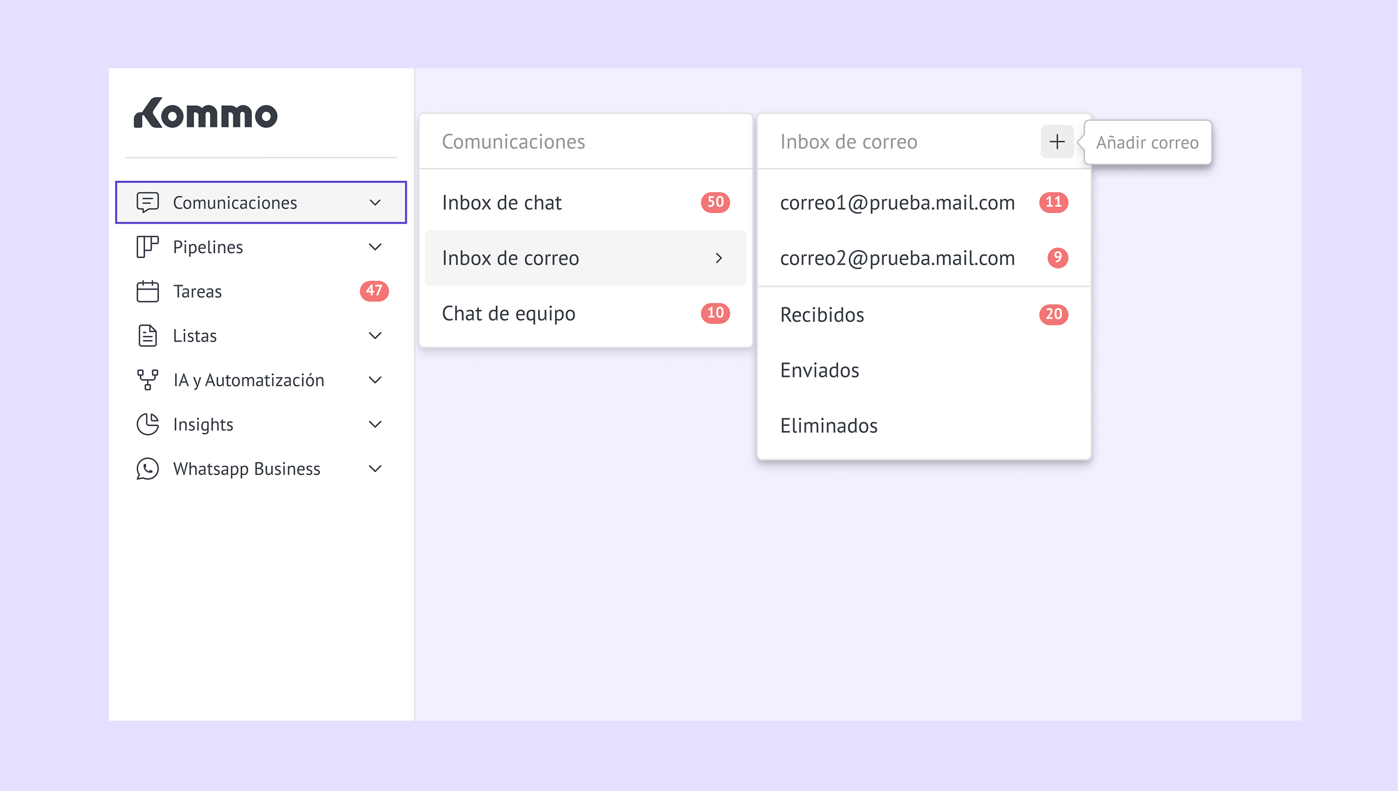 Inbox de correo – recibe, envía y organiza correos directamente en Kommo. -