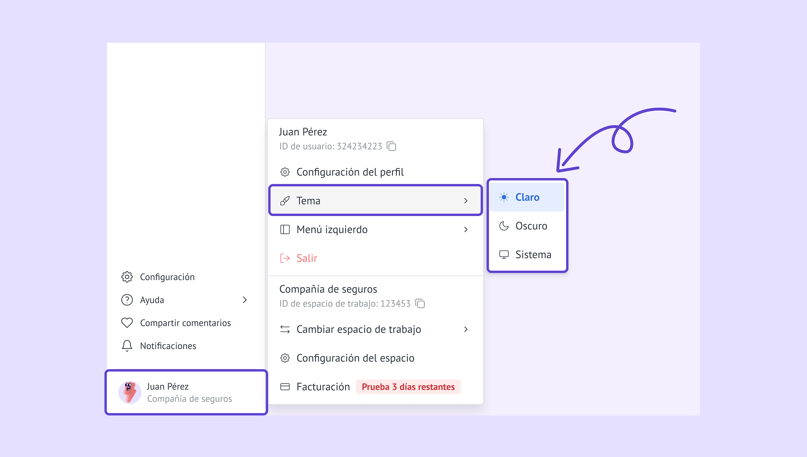 Cambiar entre los temas Claro, Oscuro o Sistema.