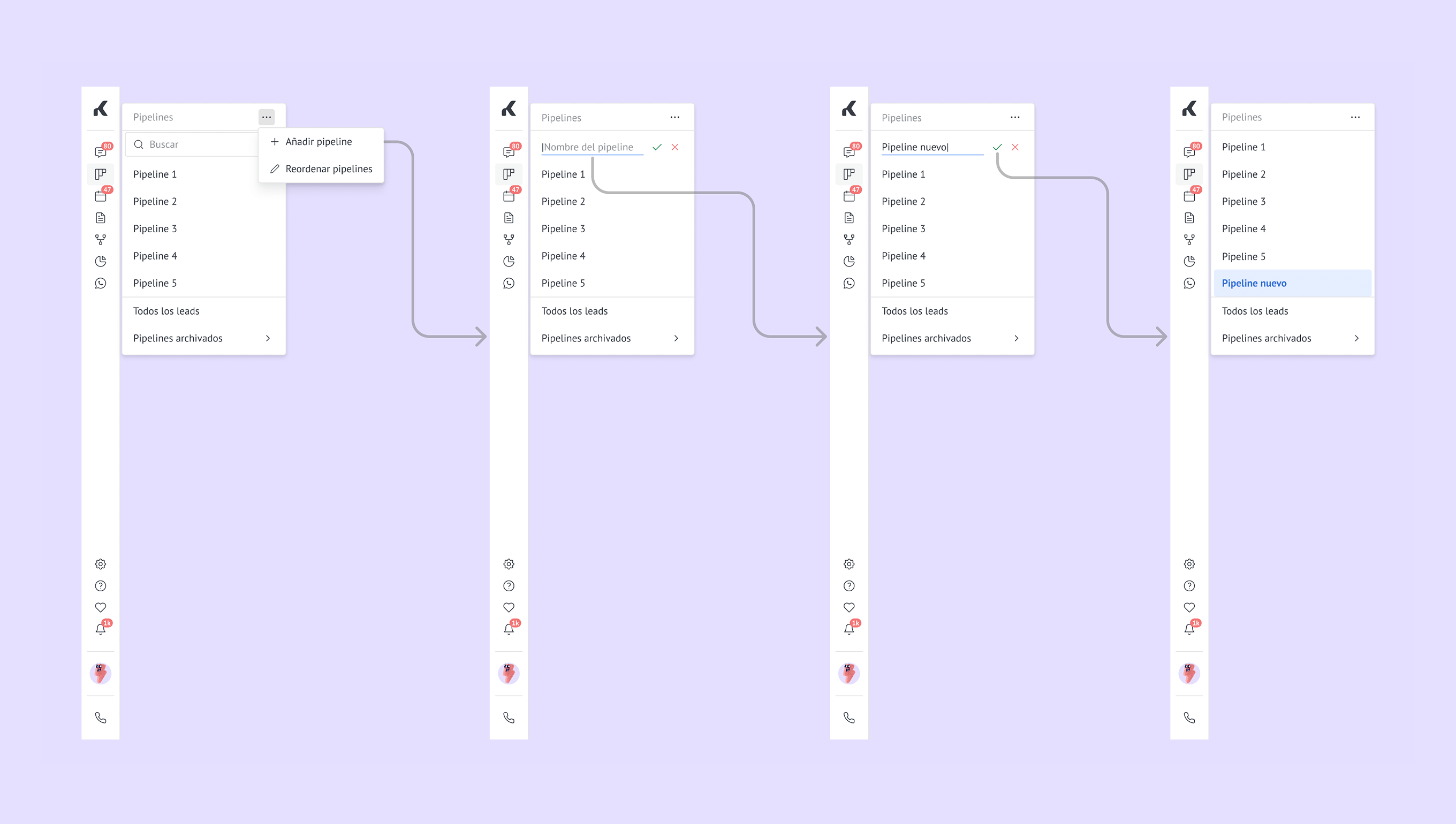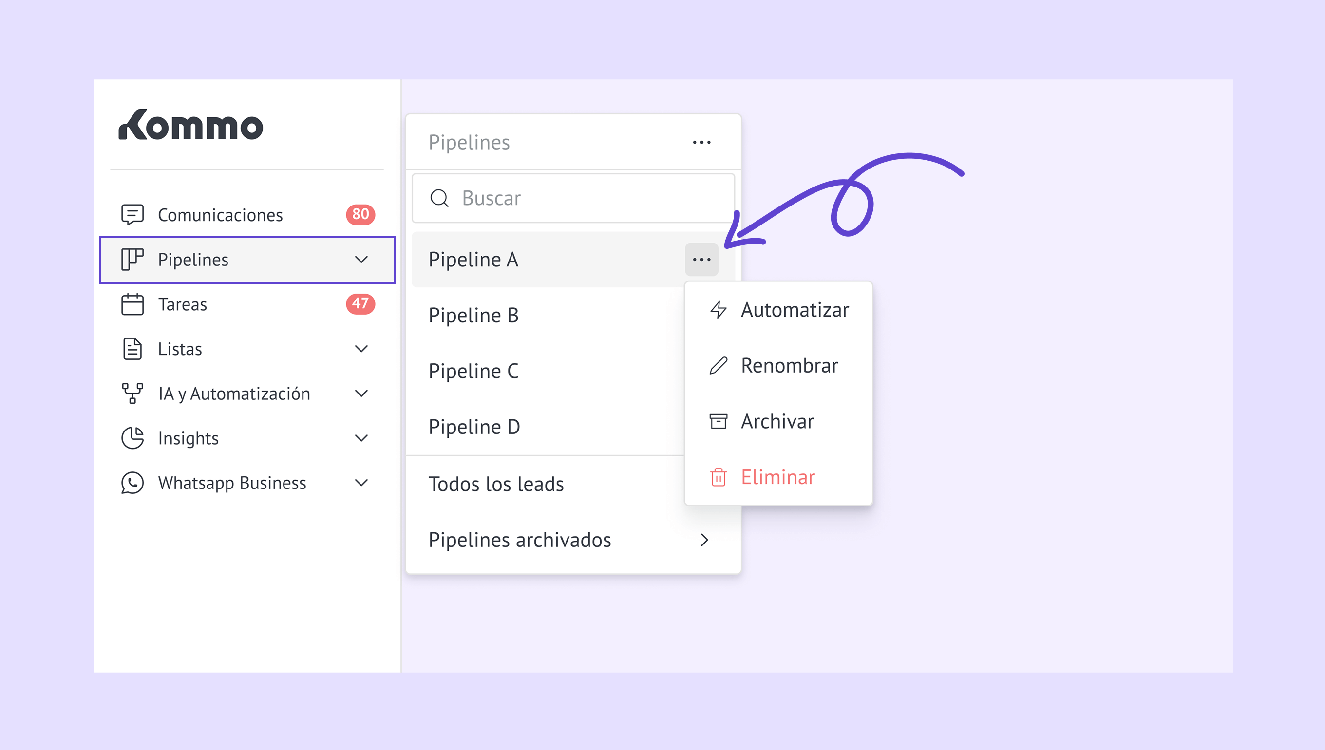 Gestiona pipelines – pasa el cursor sobre el nombre de un pipeline y abre el menú … para automatizarlo, renombrarlo, archivarlo o eliminarlo.