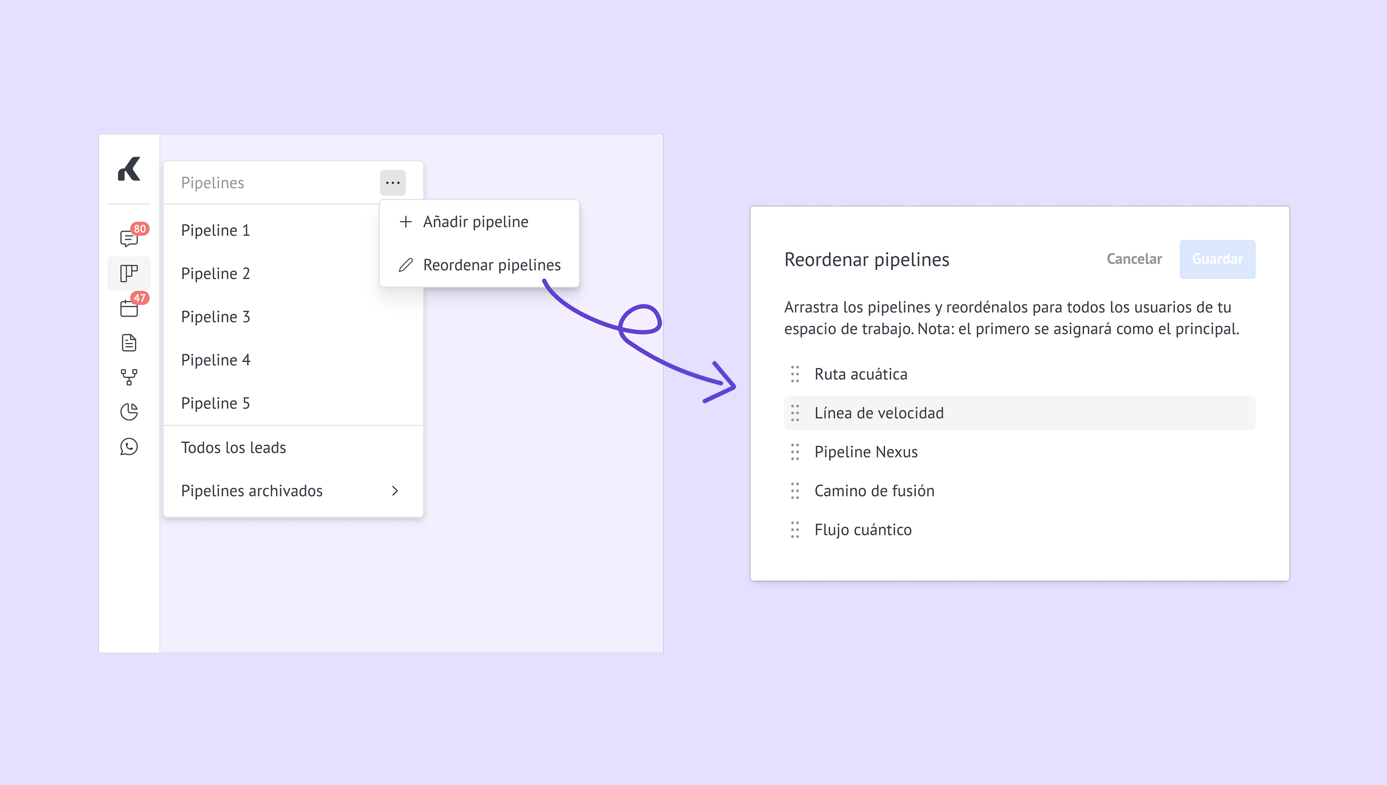 Reordena pipelines – selecciona Reordenar pipelines en el menú … y arrástralos en el orden que más te convenga.