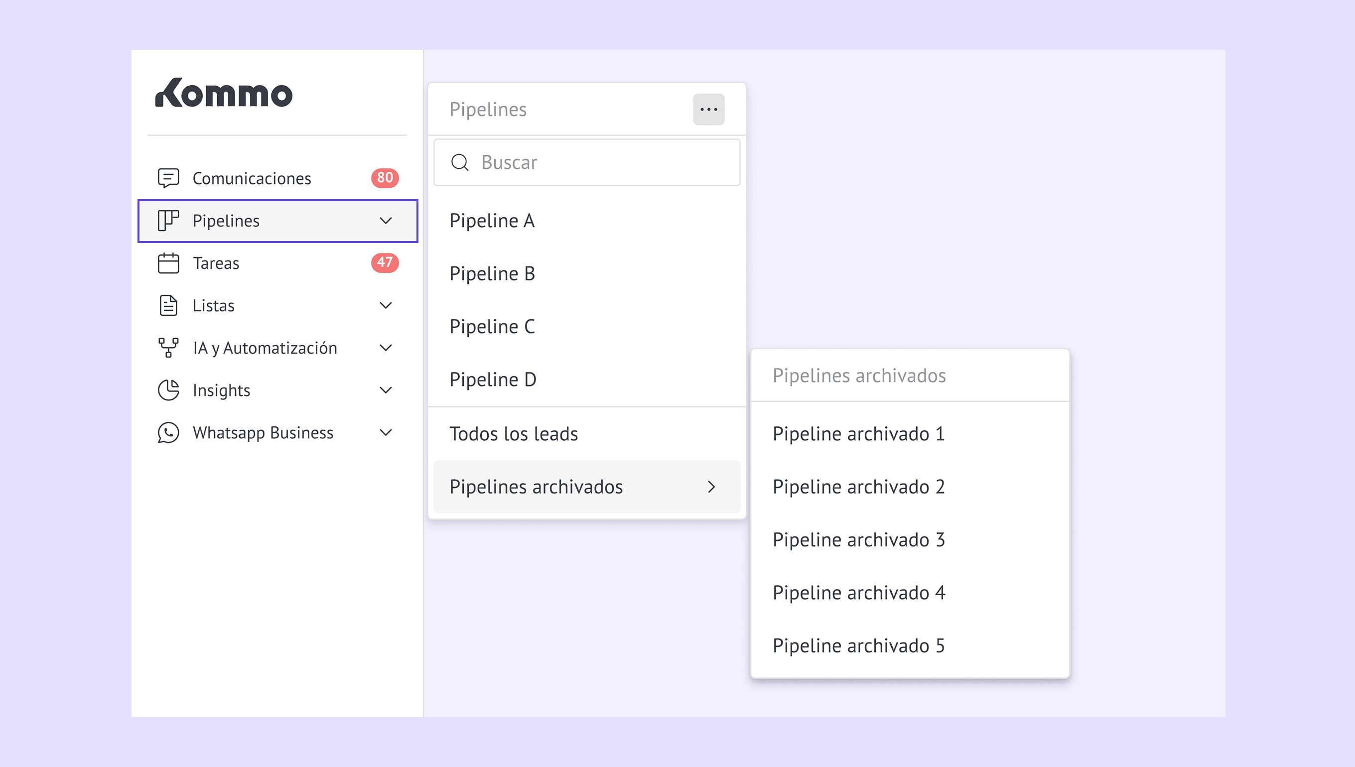 Todos los leads y pipelines archivados – visualiza cada lead de todos los pipelines en Todos los leads , o revisa tratos pasados en Pipelines archivados .