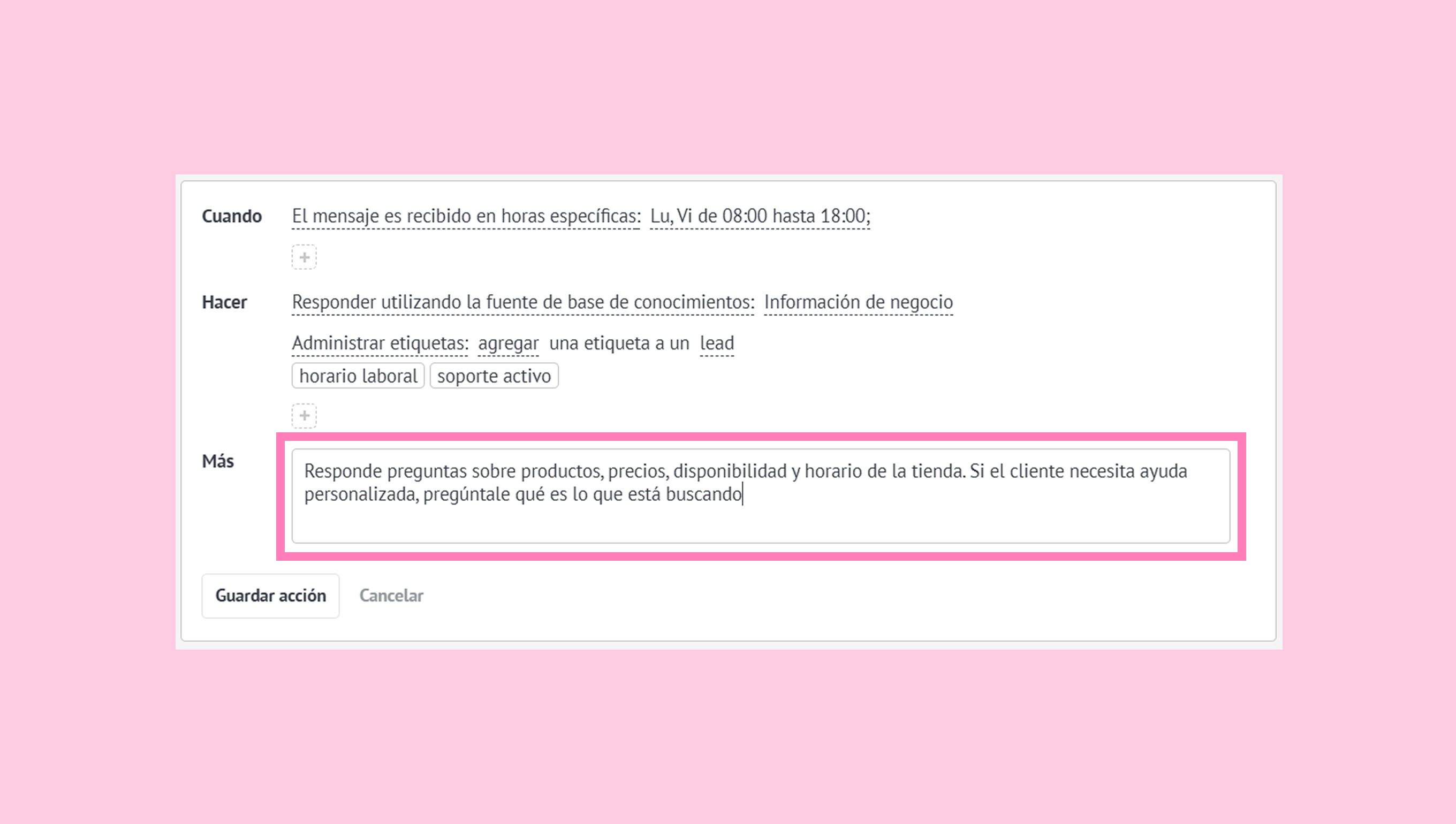 En el campo Más, agrega alguna instrucción como: “Responde preguntas sobre productos, precios, disponibilidad y horario de la tienda. Si el cliente necesita ayuda personalizada, pregúntale qué es lo que está buscando”.