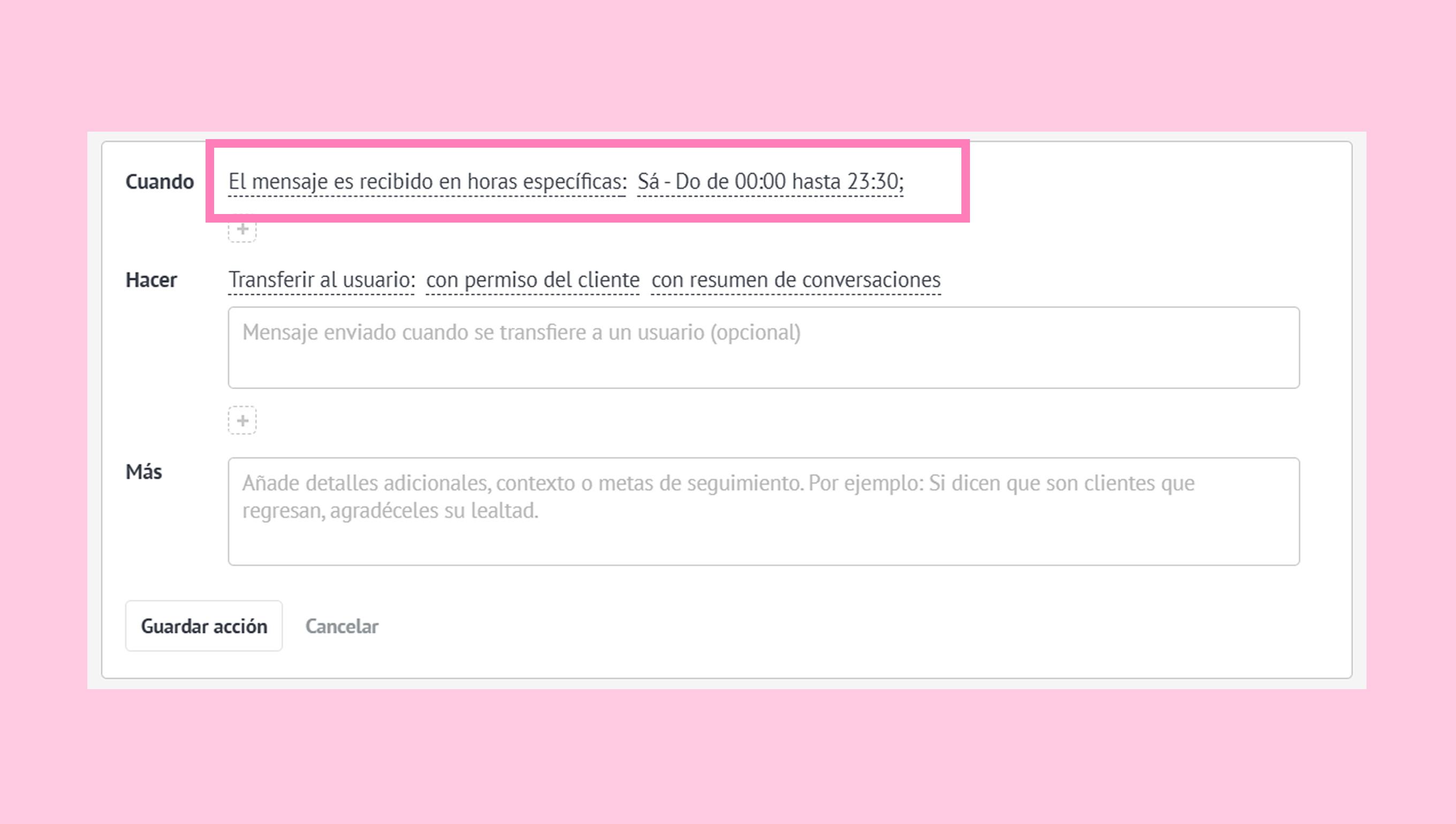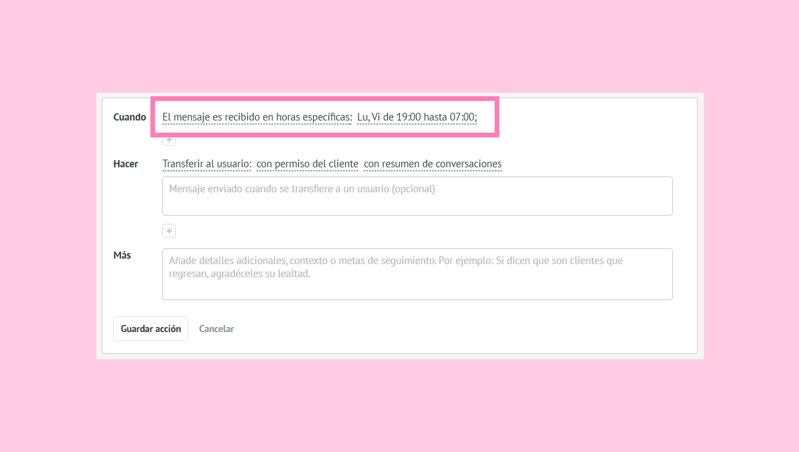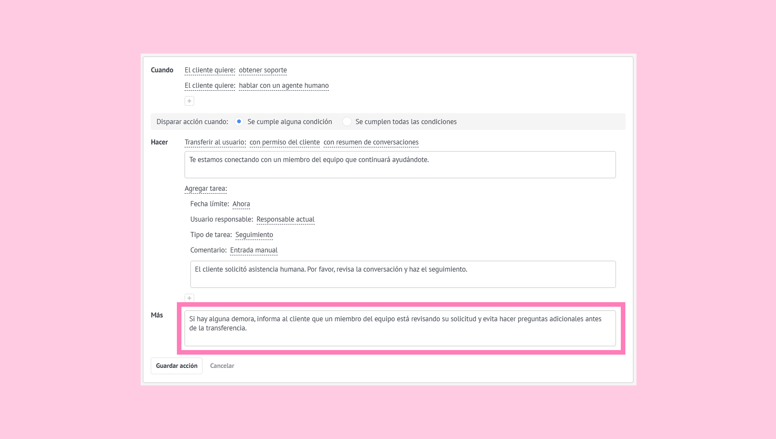En el campo Más, agrega la siguiente instrucción: “Si hay alguna demora, informa al cliente que un miembro del equipo está revisando su solicitud y evita hacer preguntas adicionales antes de la transferencia”.