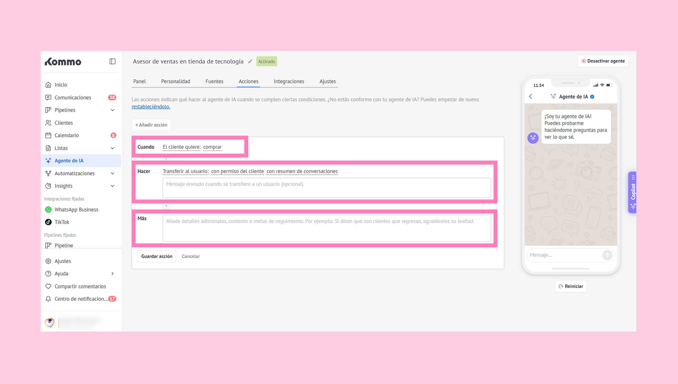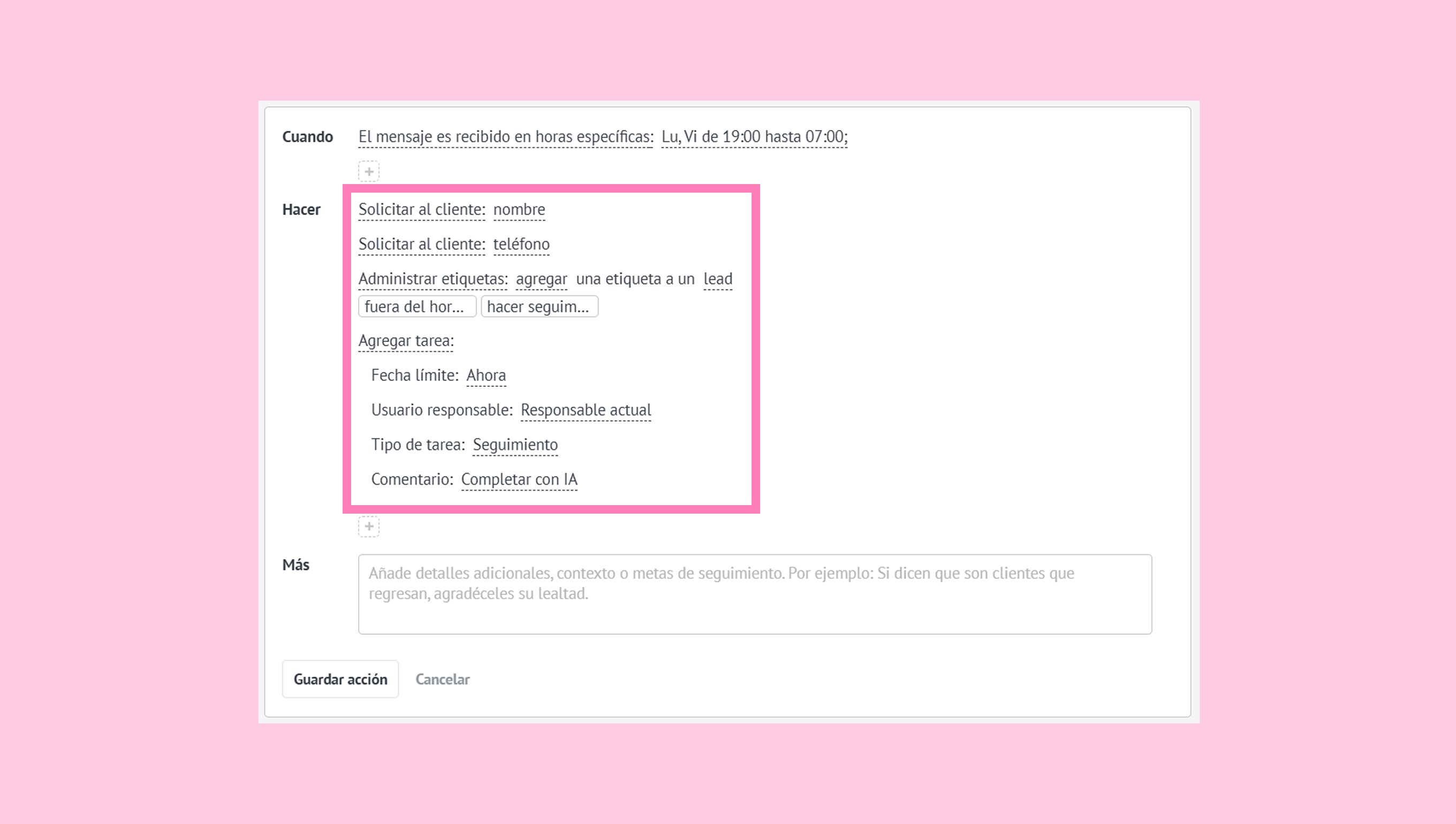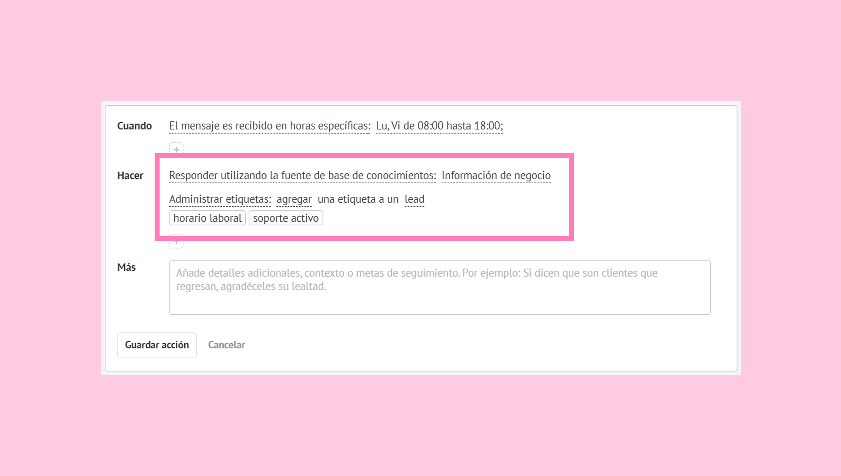 HACER - acciones que el agente de IA ejecutará cuando se cumplan las condiciones.