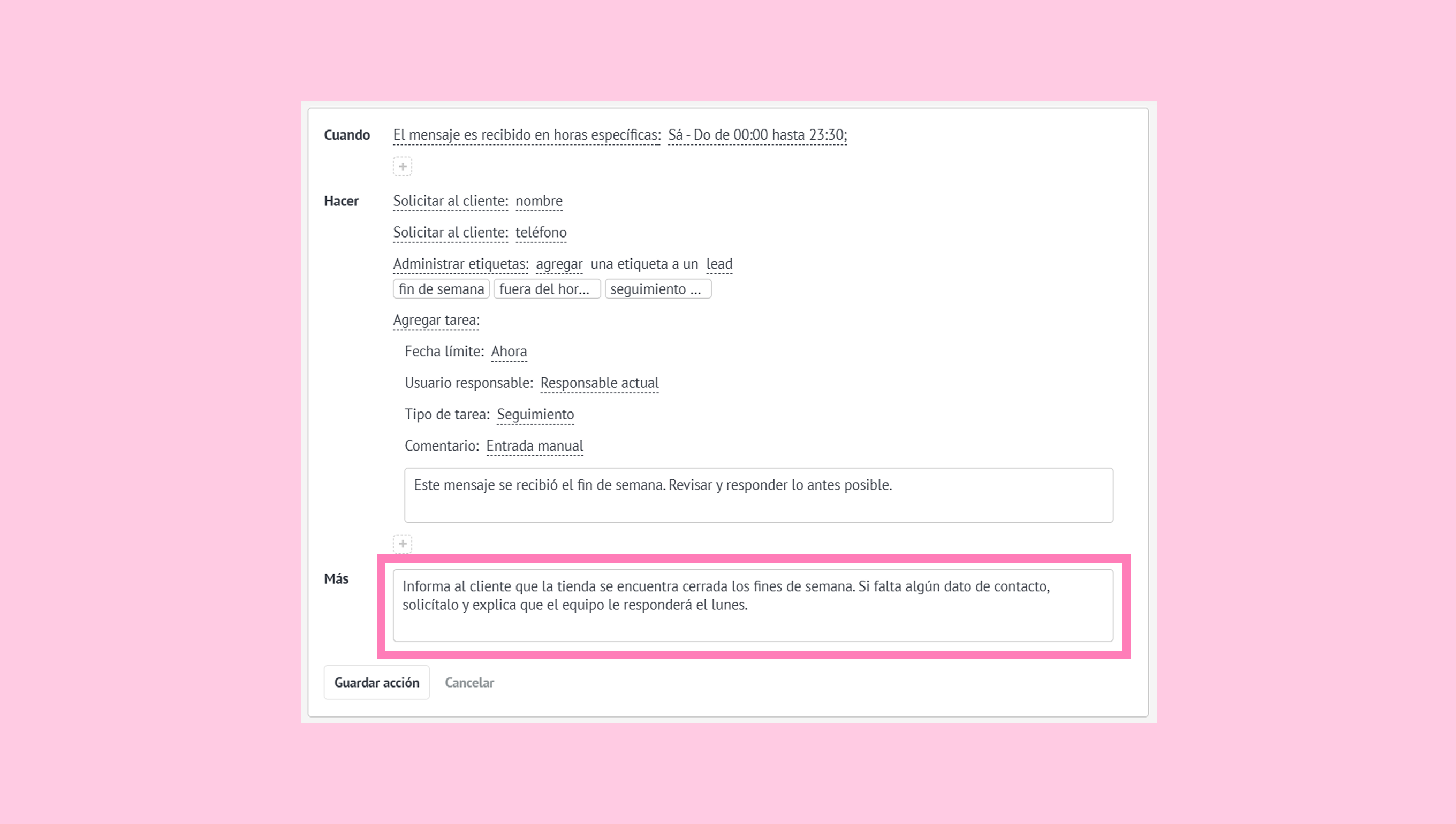 En el campo Más, agrega una instrucción como: “Informa al cliente que la tienda se encuentra cerrada los fines de semana. Si falta algún dato de contacto, solicítalo y explica que el equipo le responderá el lunes”.