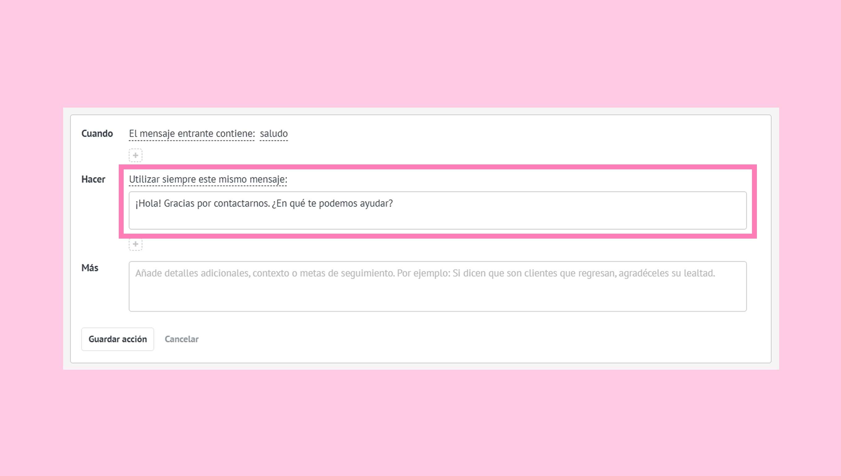 En el campo HACER, selecciona la acción Utilizar siempre este mismo mensaje y añade un mensaje de bienvenida. Por ejemplo: “¡Hola! Gracias por contactarnos. ¿En qué te podemos ayudar?”