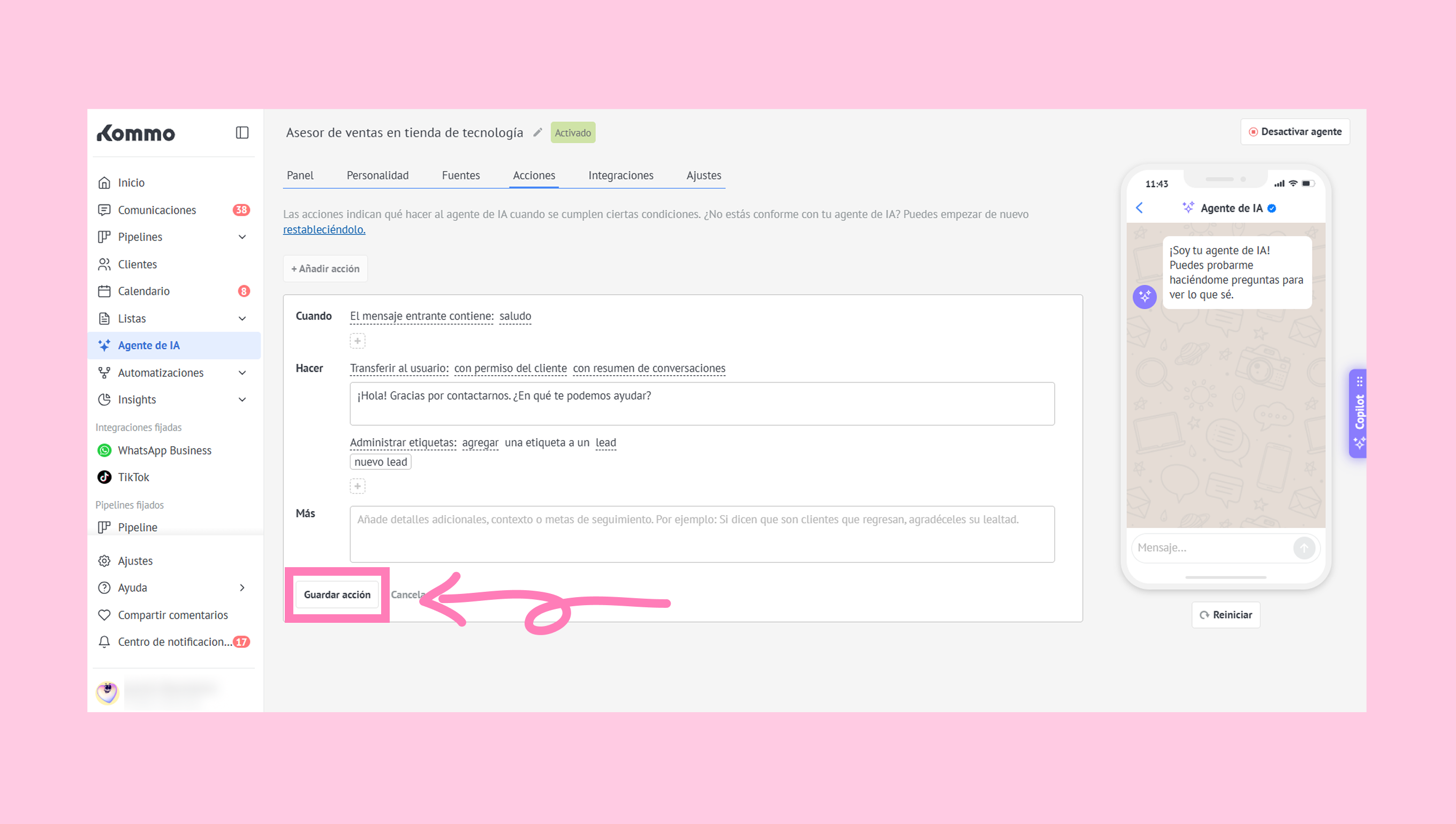 Con esta configuración, el agente de IA puede responder preguntas frecuentes, recopilar información clave, y transferir conversaciones complejas a tu equipo cuando sea necesario.