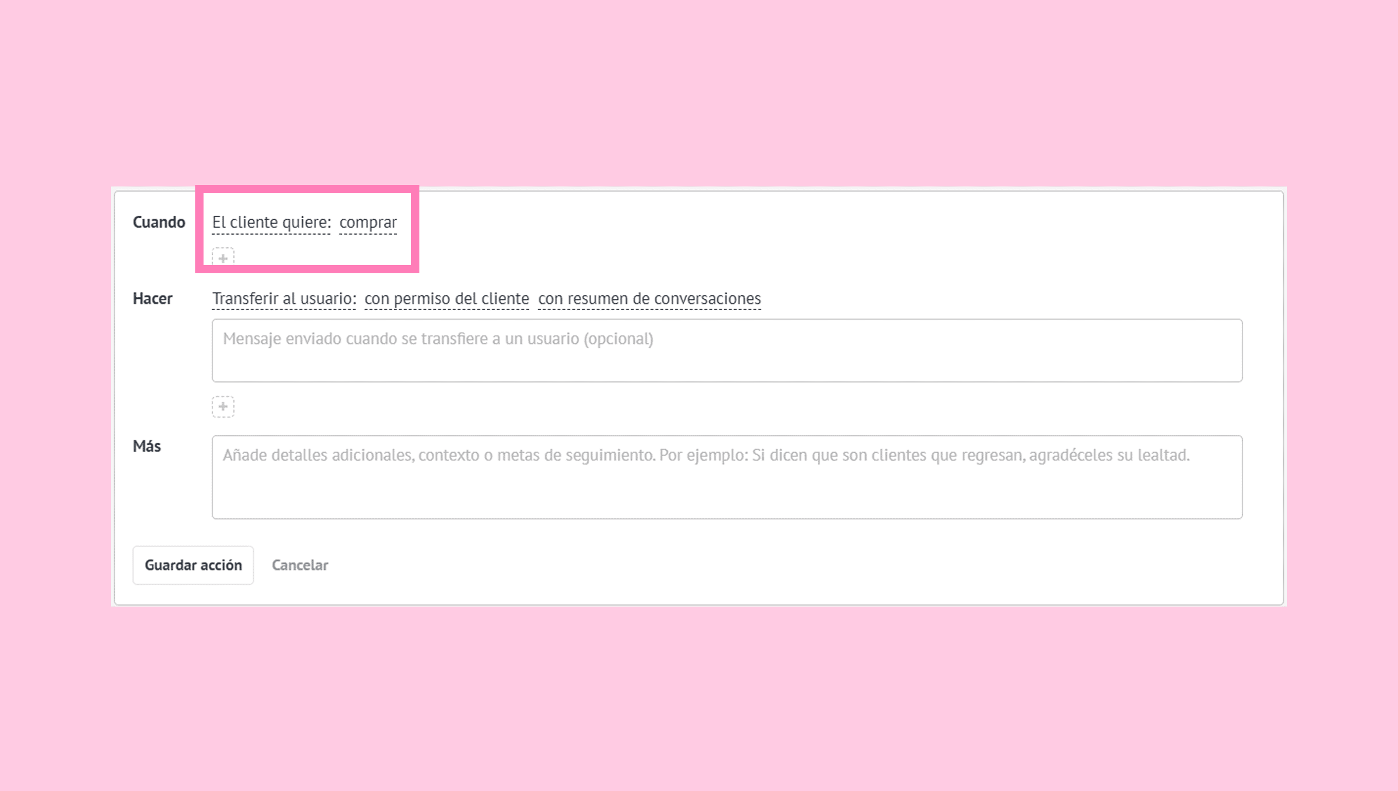 En el campo CUANDO, selecciona la condición Cliente quiere: comprar. Esto ayuda al agente de IA a identificar los clientes que podrían necesitar ayuda para elegir un producto o servicio.