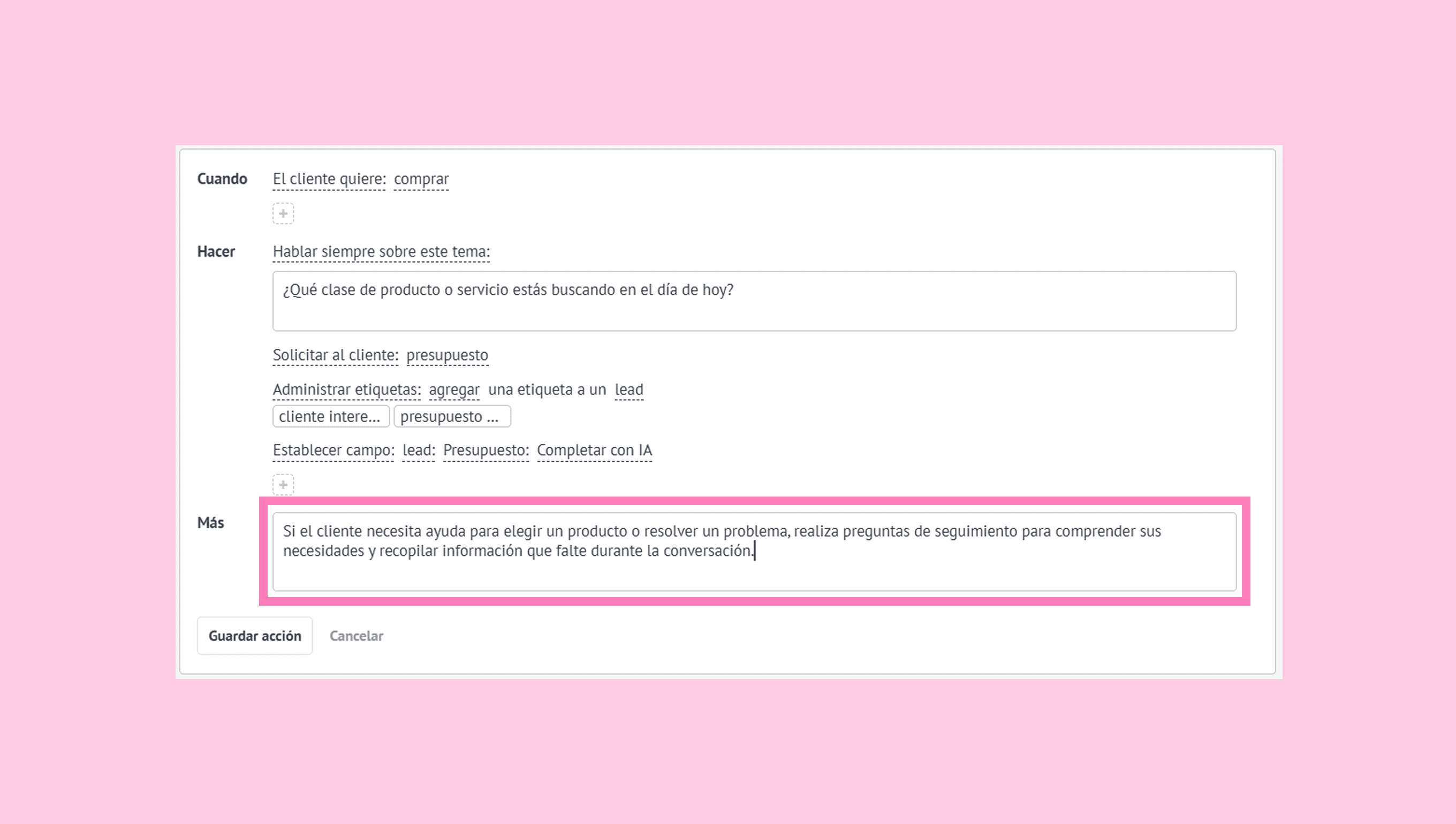 En el campo Más, agrega indicaciones adicionales sobre cómo debe continuar la conversación el agente de IA. Puedes agregar la siguiente instrucción: “Si el cliente necesita ayuda para elegir un producto o resolver un problema, realiza preguntas de seguimiento para comprender sus necesidades y recopilar información que falte durante la conversación”.