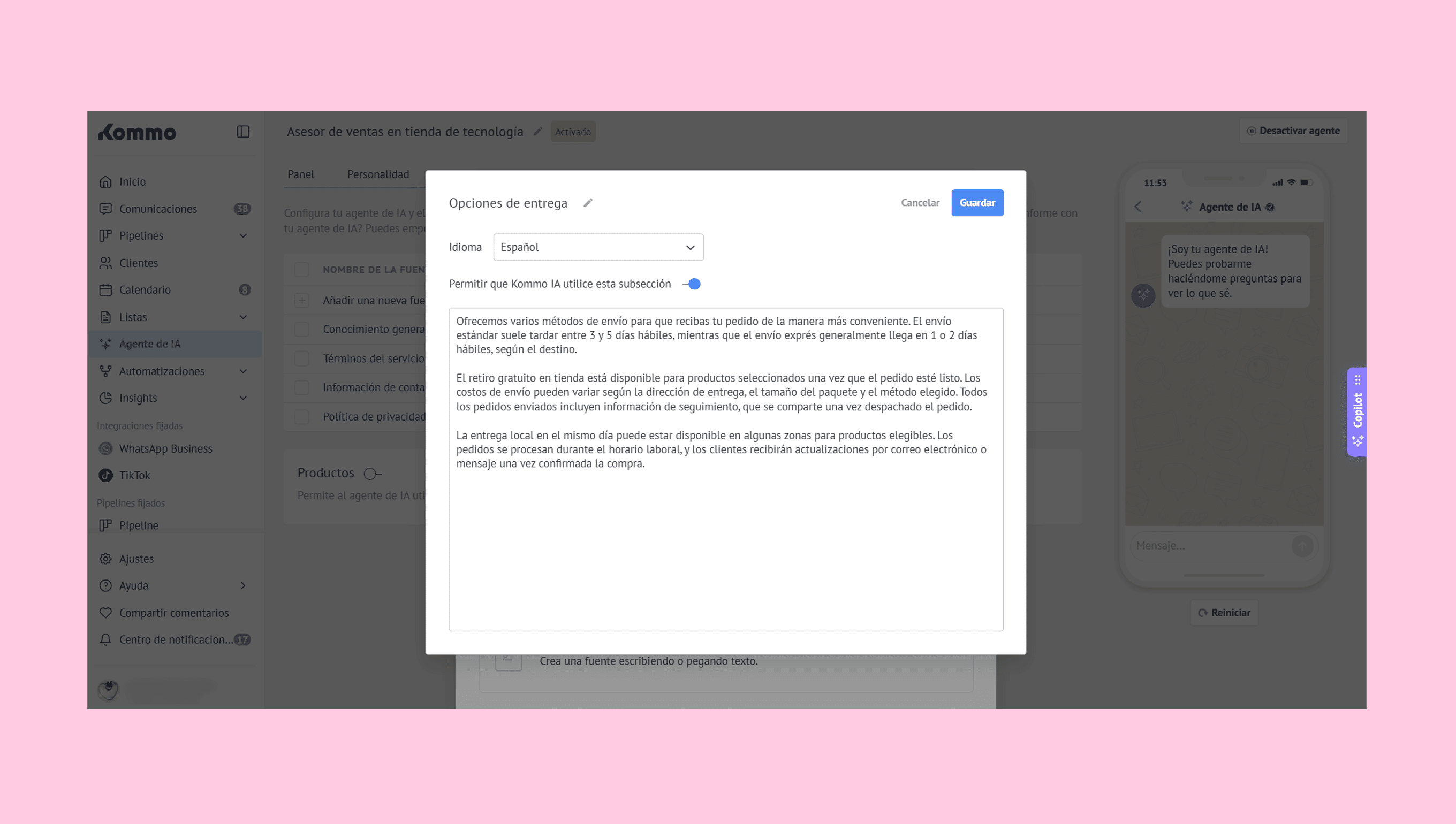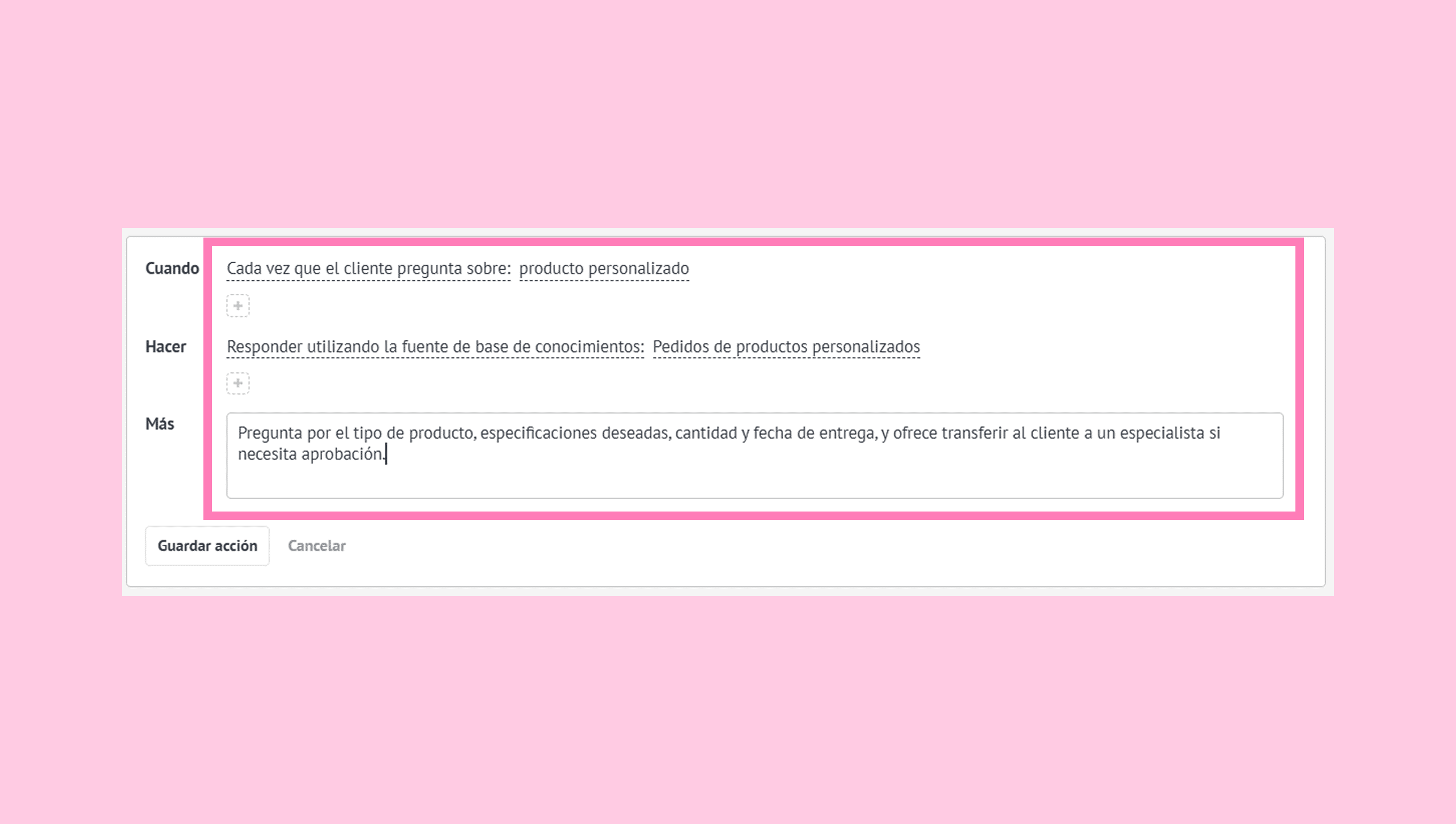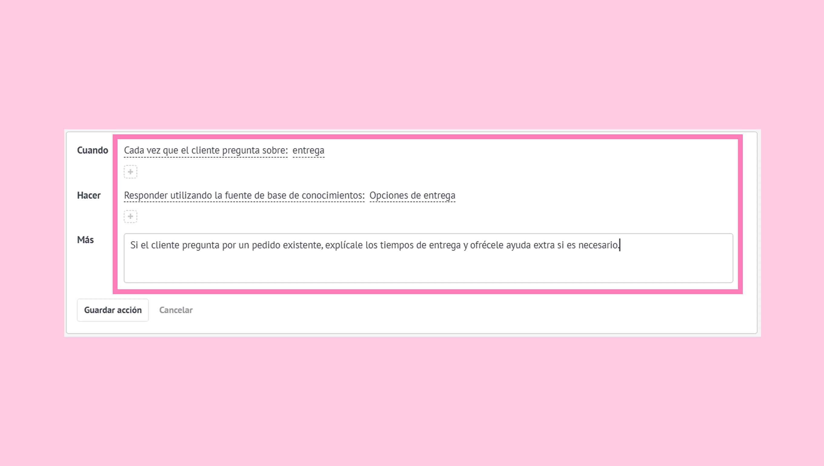 Puedes agregar lo siguiente en el campo Más: “Si el cliente pregunta por un pedido existente, explícale los tiempos de entrega y ofrécele ayuda extra si es necesario”.