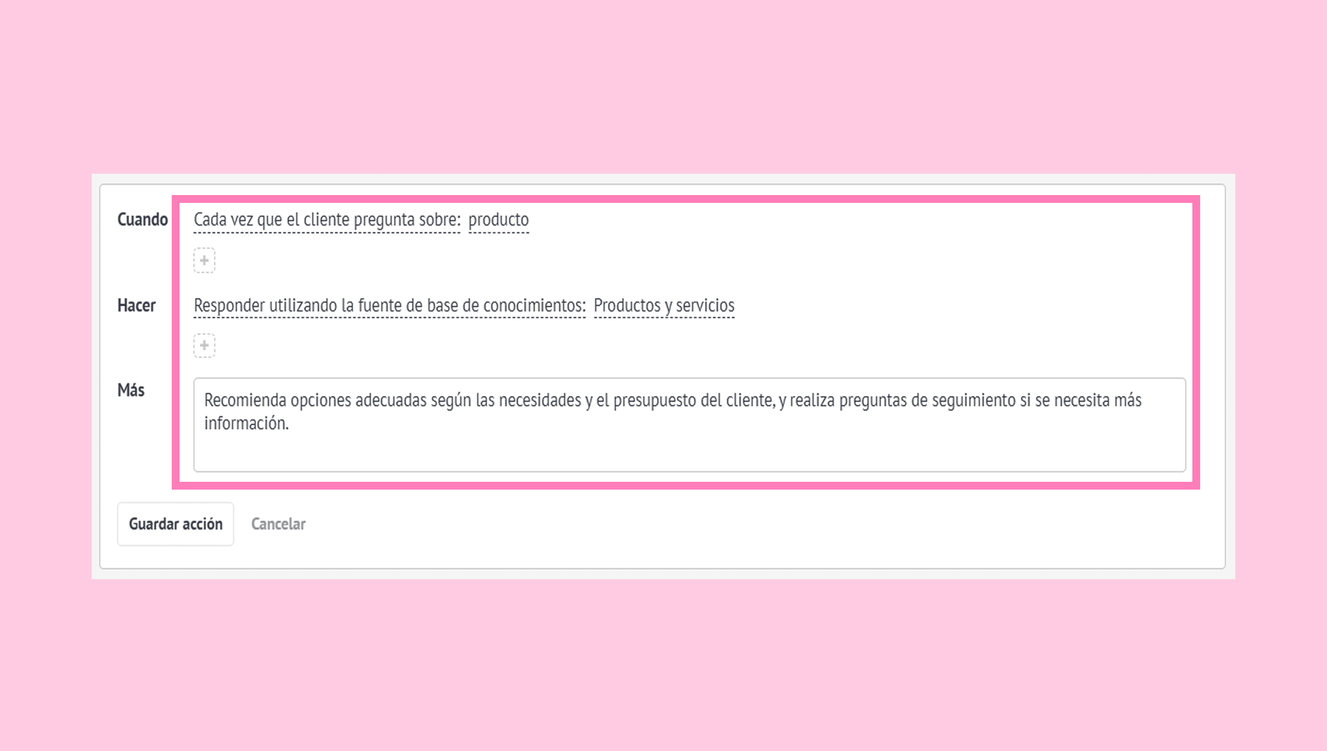 En el campo CUANDO, selecciona la condición Cada vez que el cliente pregunta sobre:, y agrega el valor producto.