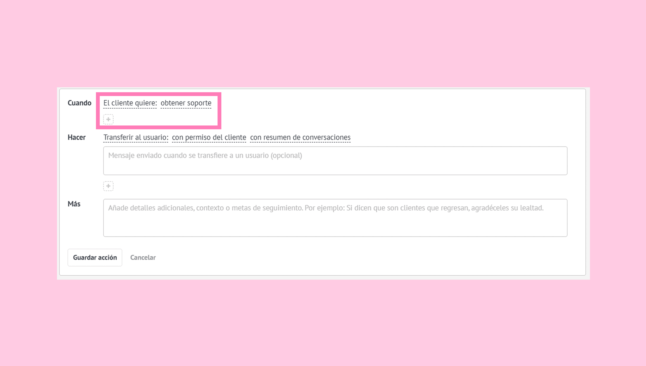 En CUANDO, elige la condición El cliente quiere: obtener soporte.