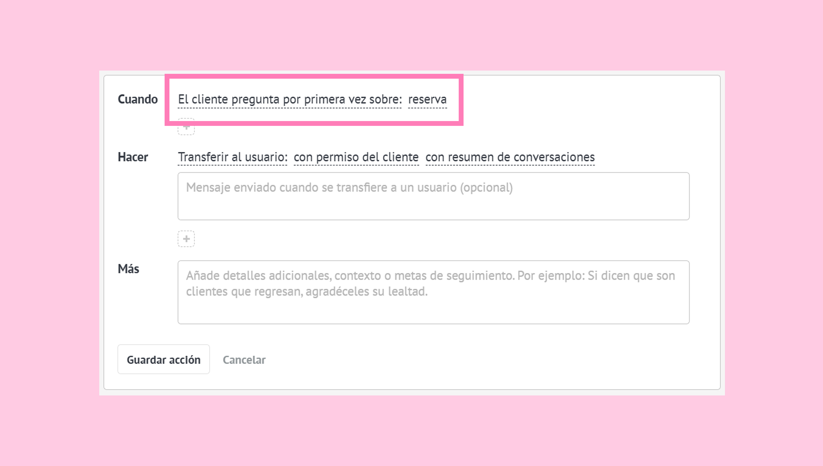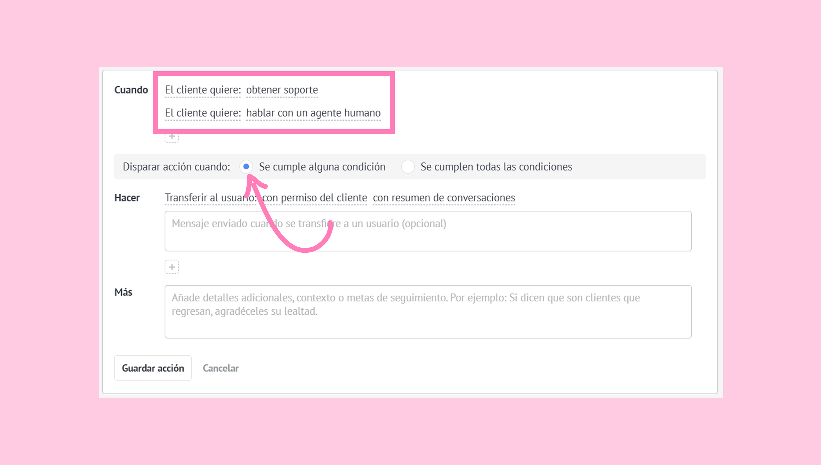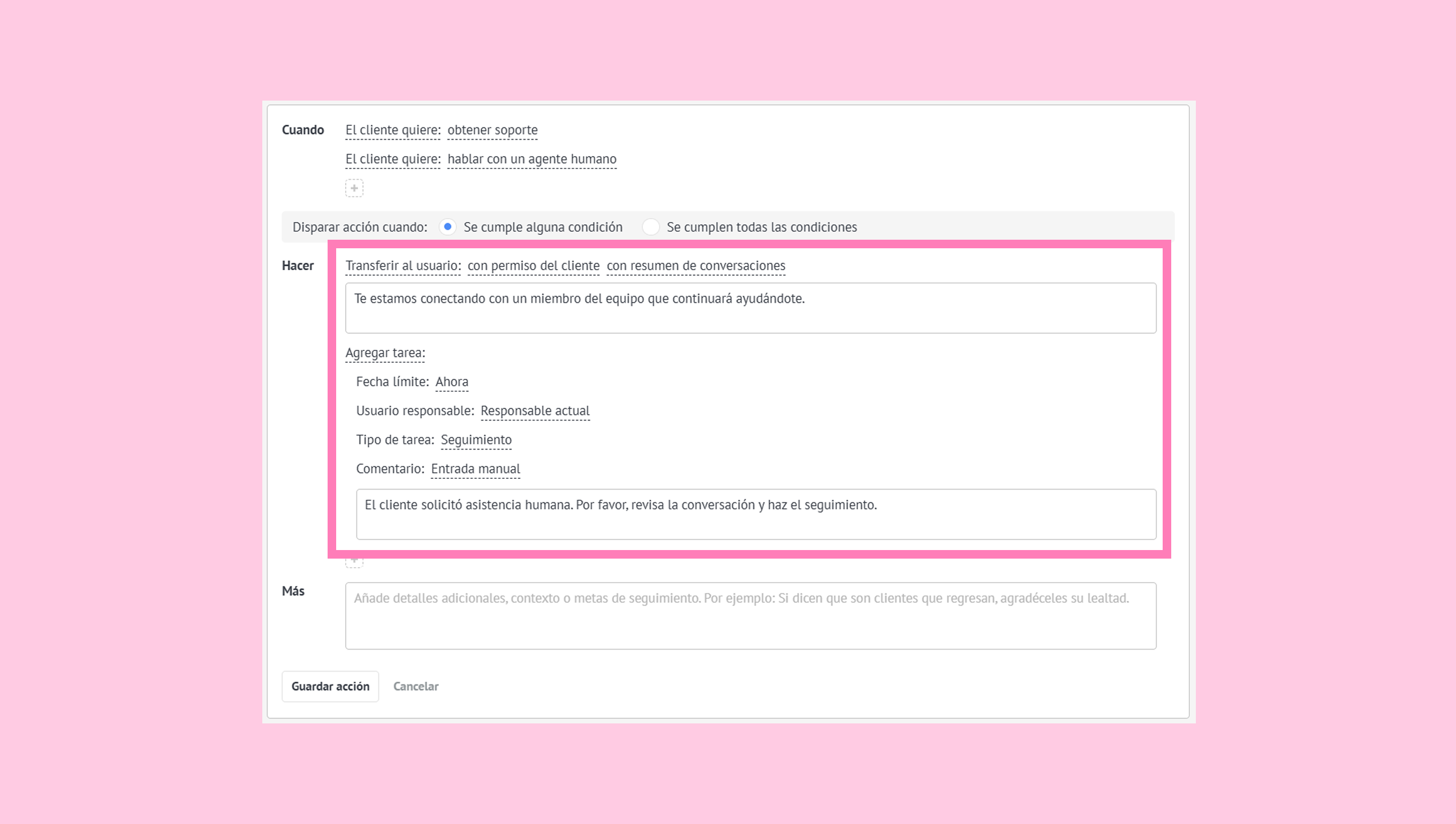 Configura la acción para que se dispare cuando se cumple alguna condición. Esto ayuda al agente de IA a reconocer las diferentes solicitudes que requieren asistencia humana.
