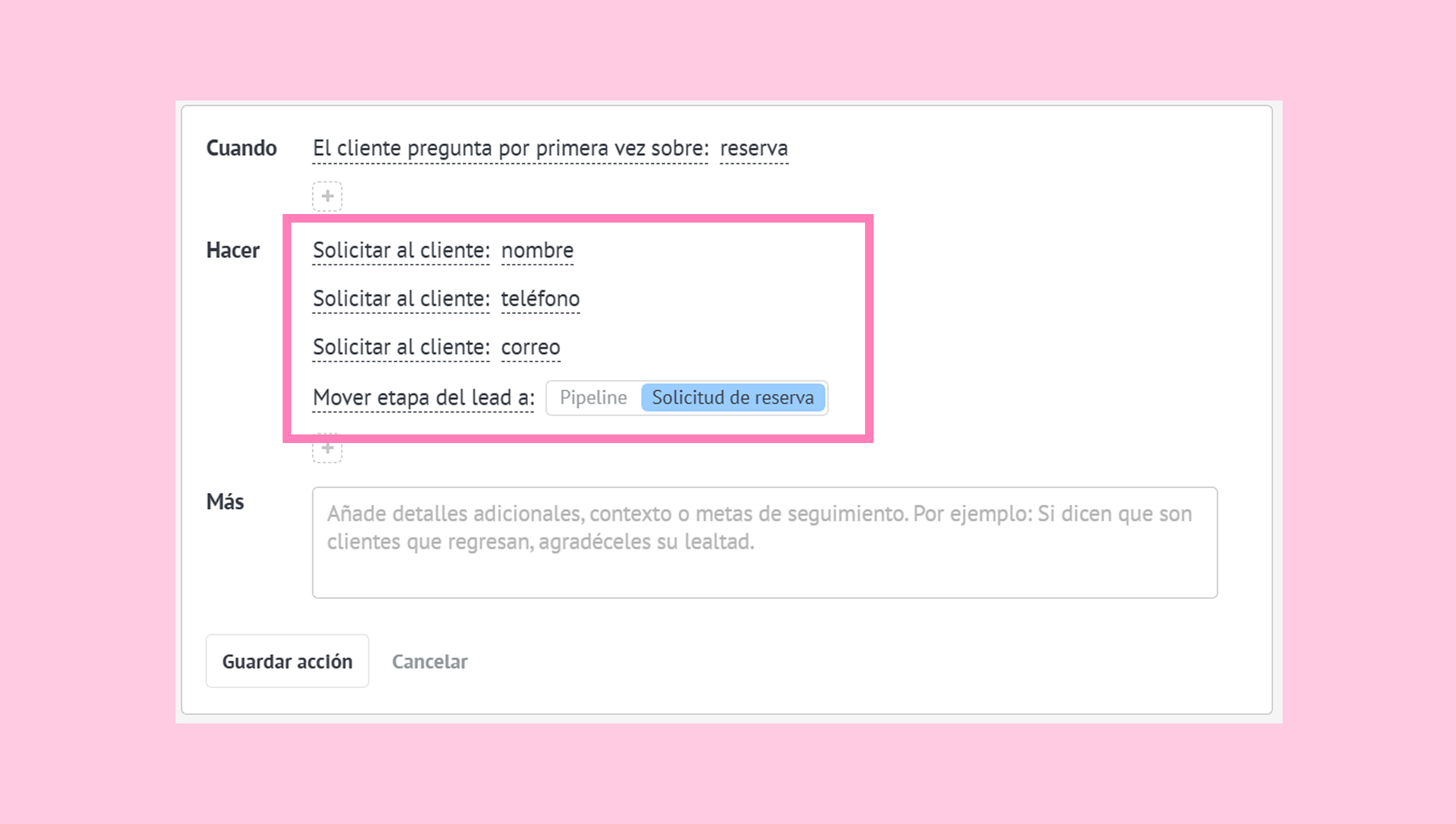 Mover etapa del lead a: solicitud de reserva en tu pipeline. De esta manera, el lead se mantiene organizado en la etapa correcta a medida que la conversación progresa.