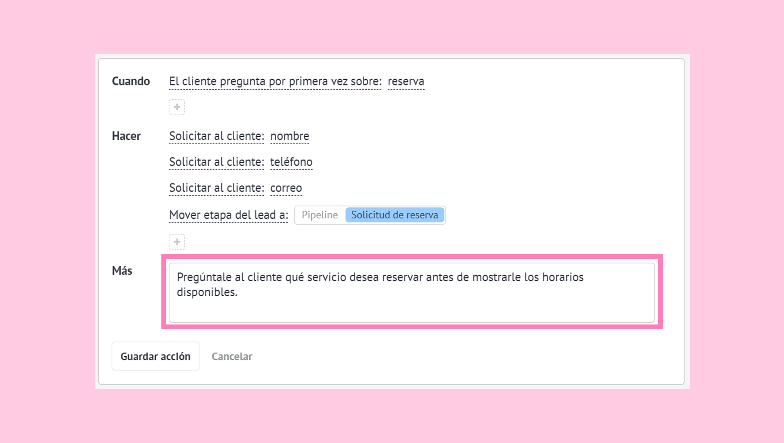 En el campo Más, agrega más instrucciones detalladas, como: “Pregúntale al cliente qué servicio desea reservar antes de mostrarle los horarios disponibles”.