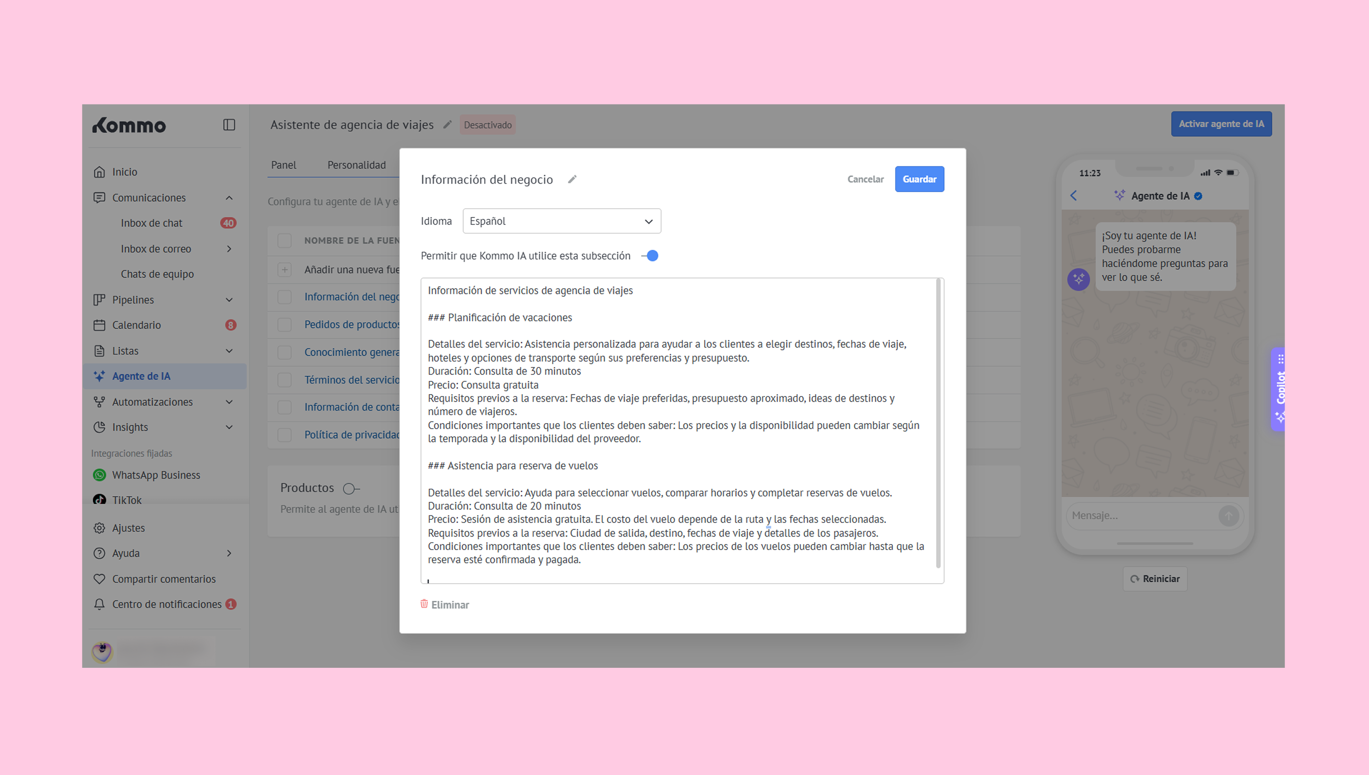 En el campo Más, agrega más instrucciones detalladas, como: “Siempre mantén informado al cliente sobre las condiciones especiales del servicio, y comunícale que los precios y la disponibilidad pueden variar dependiendo de la temporada o la disponibilidad del proveedor”.