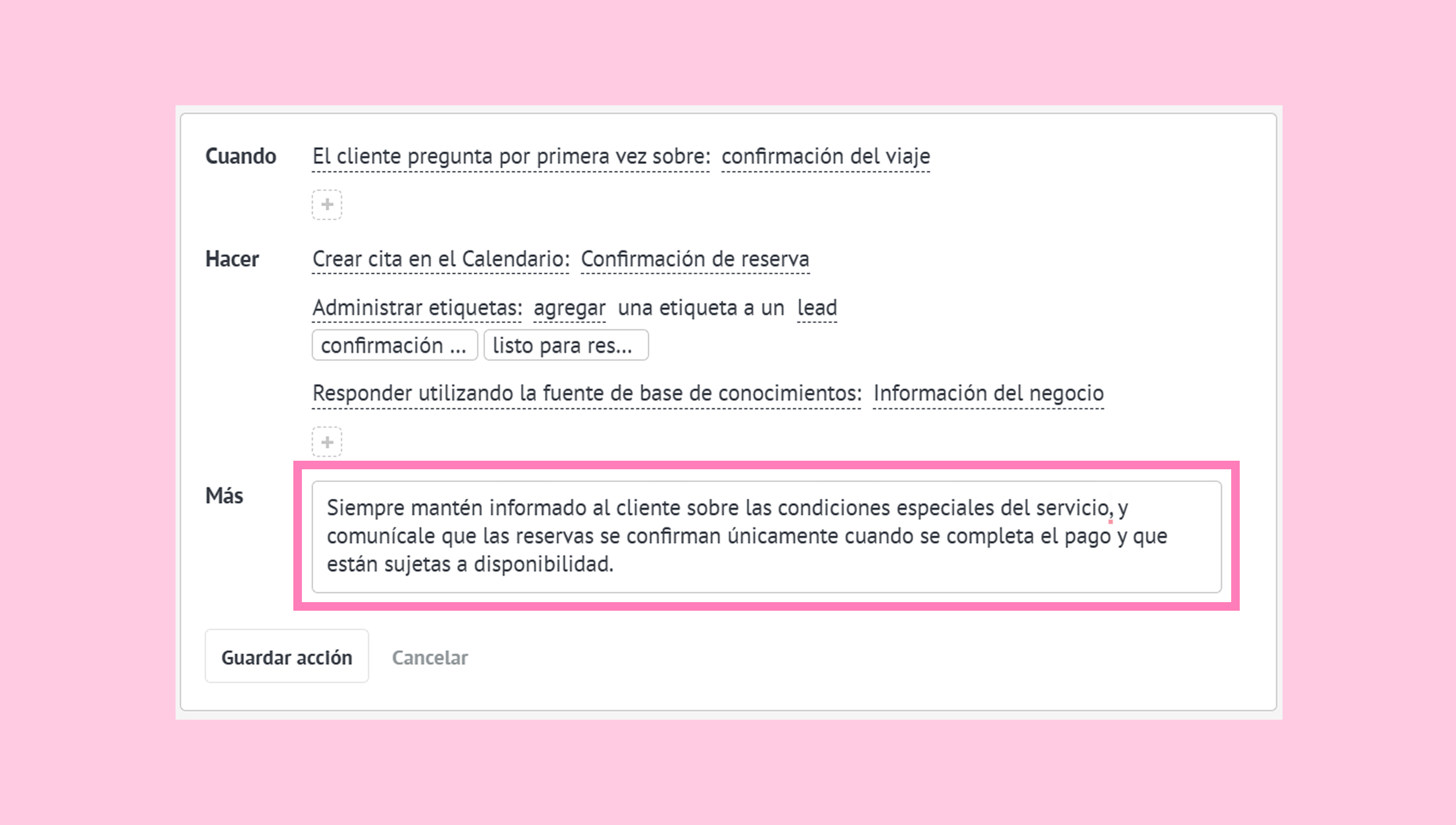 En el campo Más, agrega: “Siempre mantén informado al cliente sobre las condiciones especiales del servicio, y comunícale que las reservas se confirman únicamente cuando se completa el pago y que están sujetas a disponibilidad”.