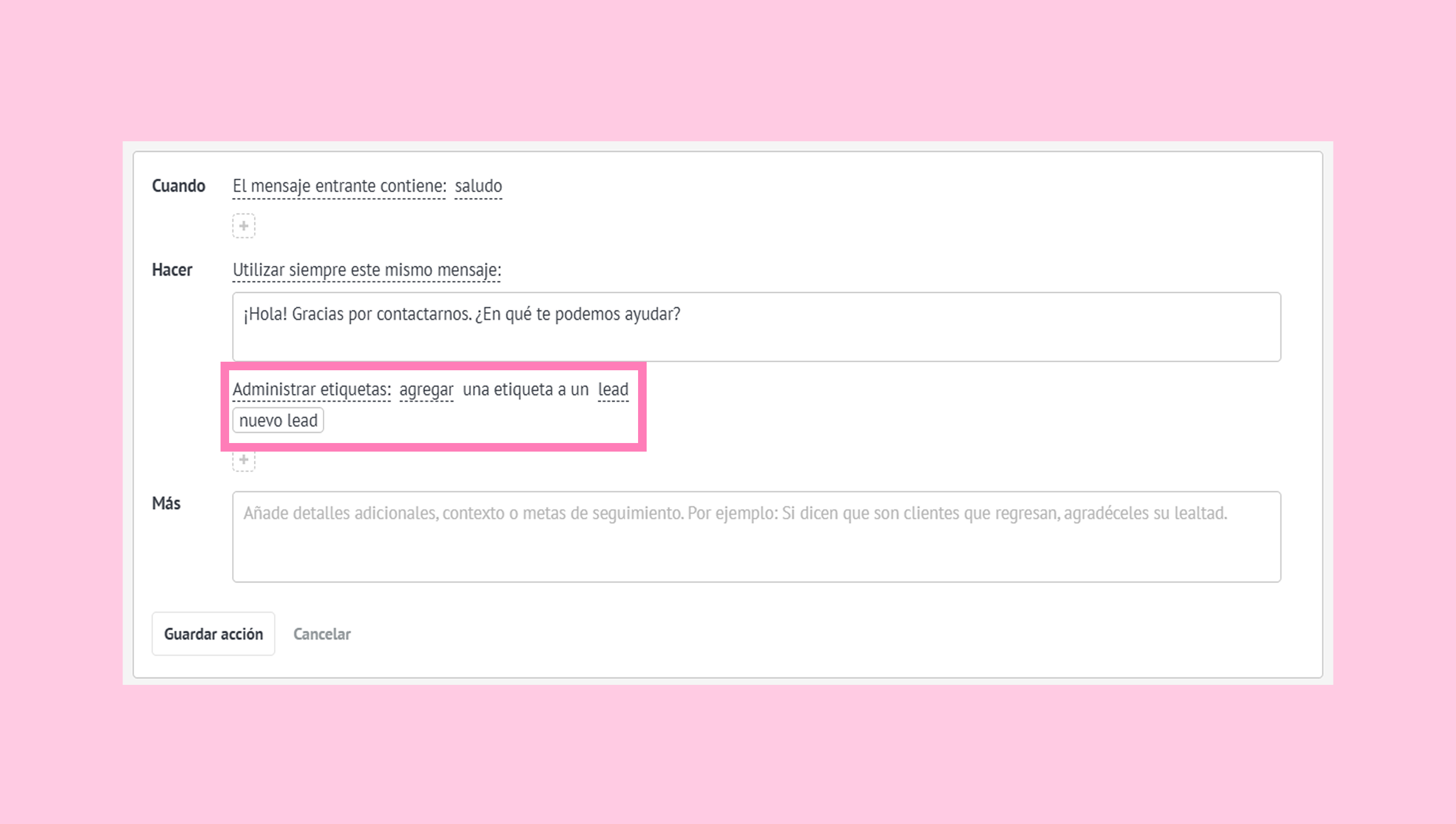 También puedes agregar otras acciones como Administrar etiquetas y agregar una etiqueta al lead entrante, como nuevo lead.
