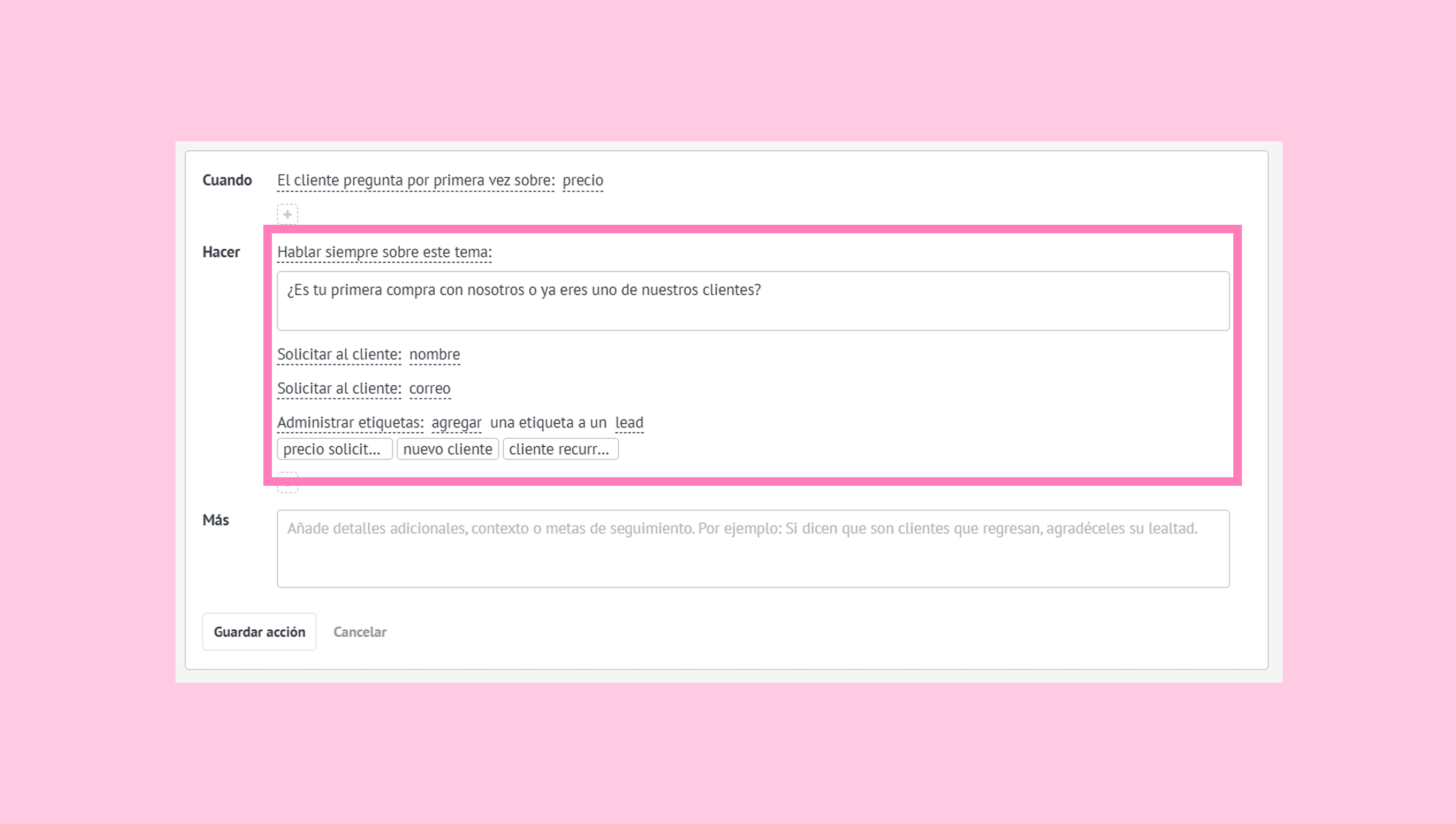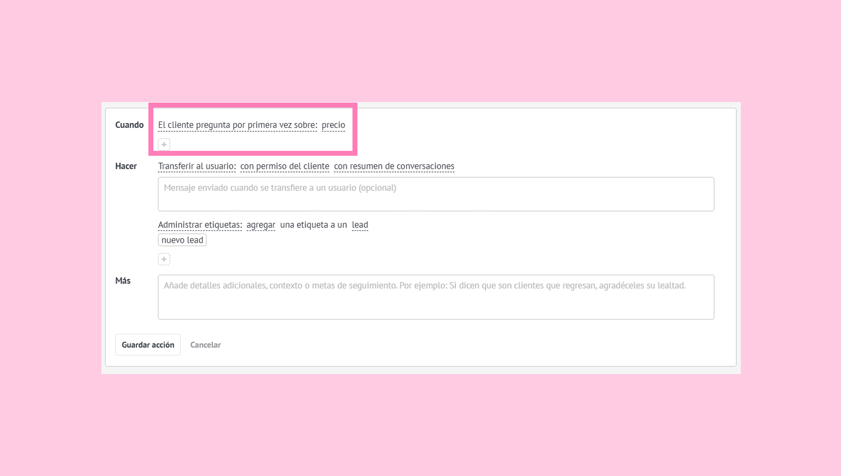 En el campo CUANDO, elige la condición El cliente pregunta por primera vez sobre: precio. Esto permite identificar nuevos leads con intención de compra.