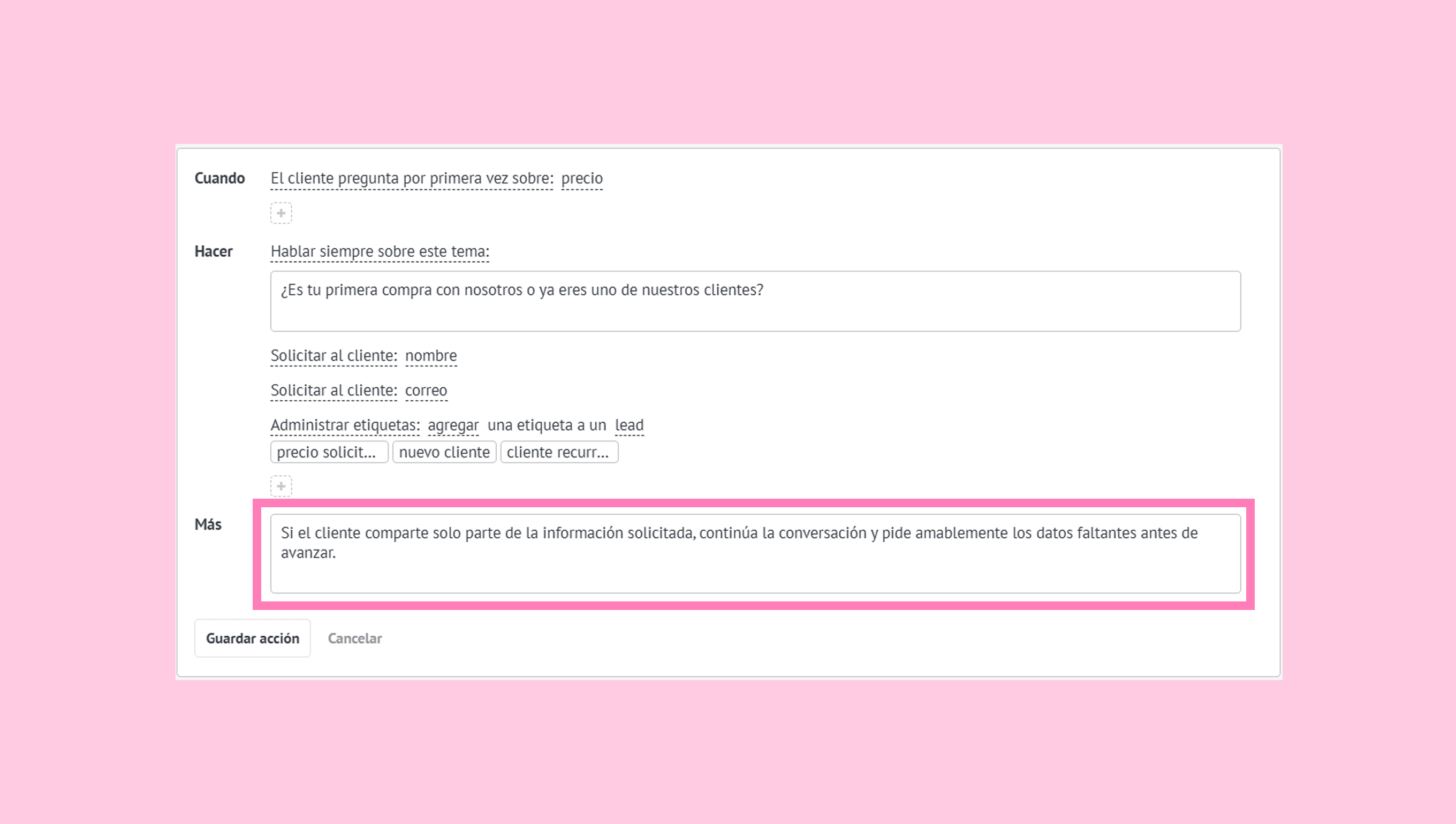 En el campo Más, agrega indicaciones adicionales que quieras que el agente de IA siga. Puedes incluir la siguiente instrucción: 'Si el cliente comparte solo parte de la información solicitada, continúa la conversación y pide amablemente los datos faltantes antes de avanzar'.