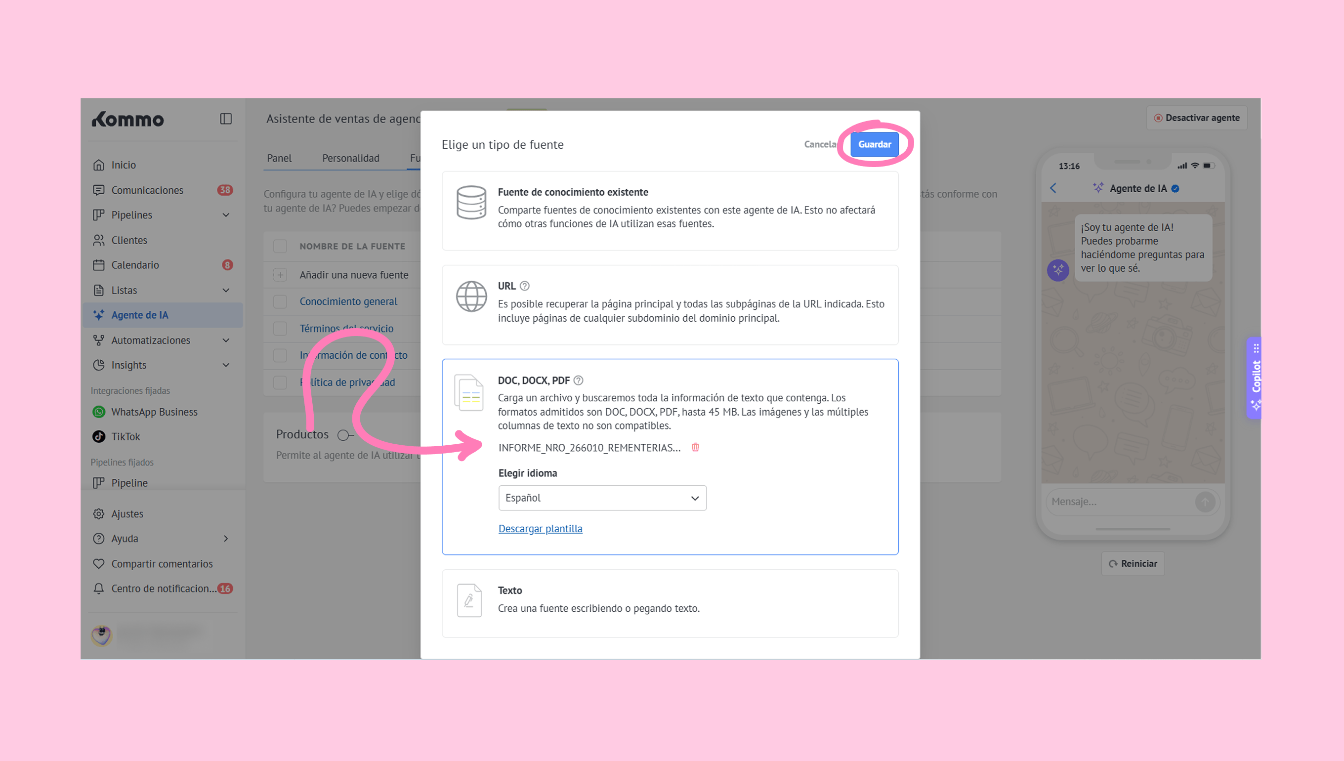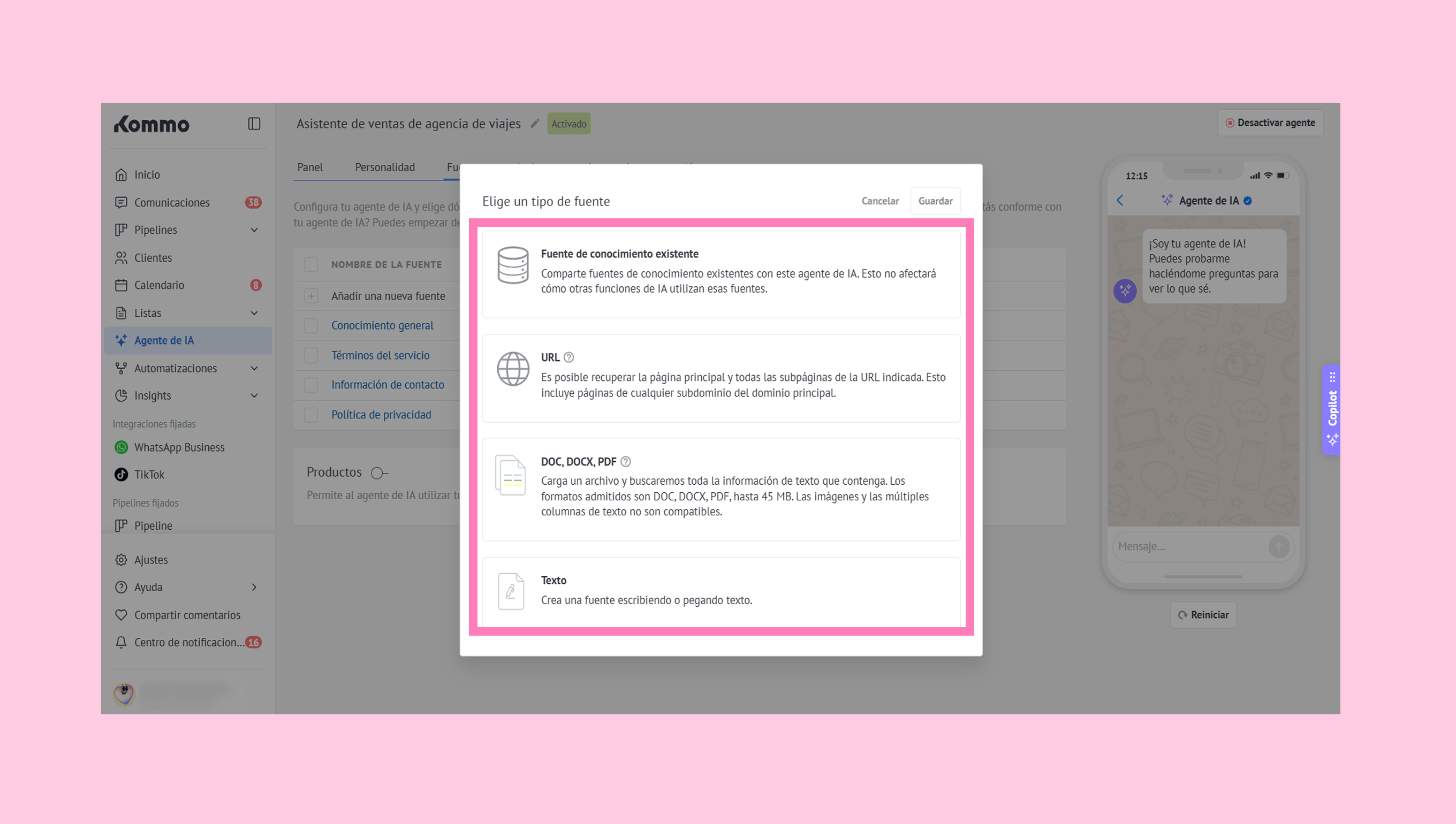 Elige un tipo de fuente para agregar información relevante sobre tu negocio. Esto permitirá que el agente de IA proporcione respuestas basadas en la información de tu empresa (por ejemplo, servicios que ofreces, precios, horarios de atención o preguntas frecuentes).