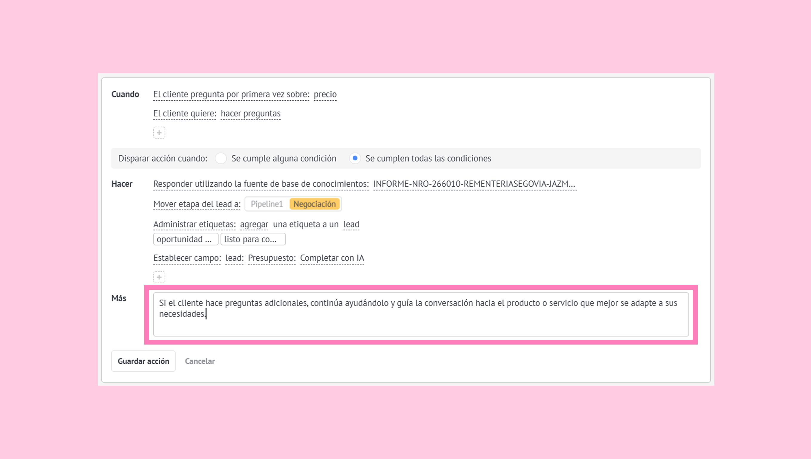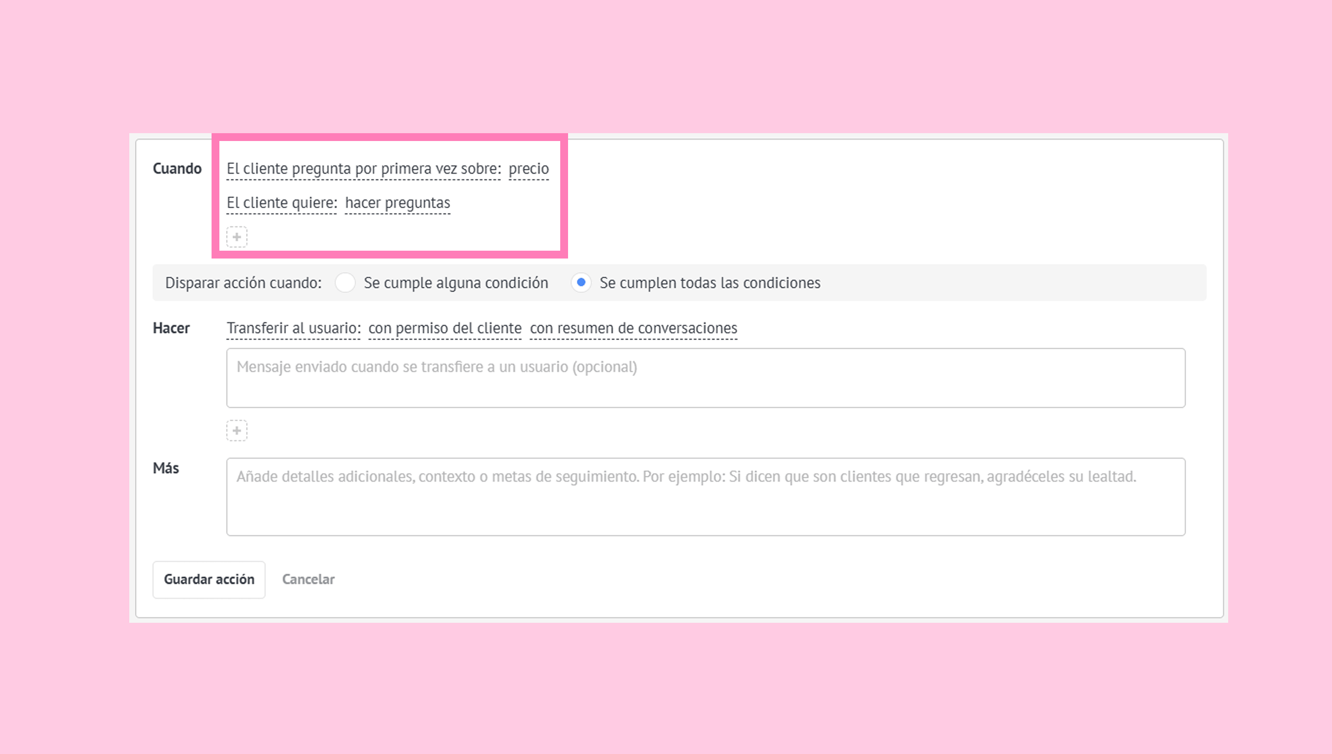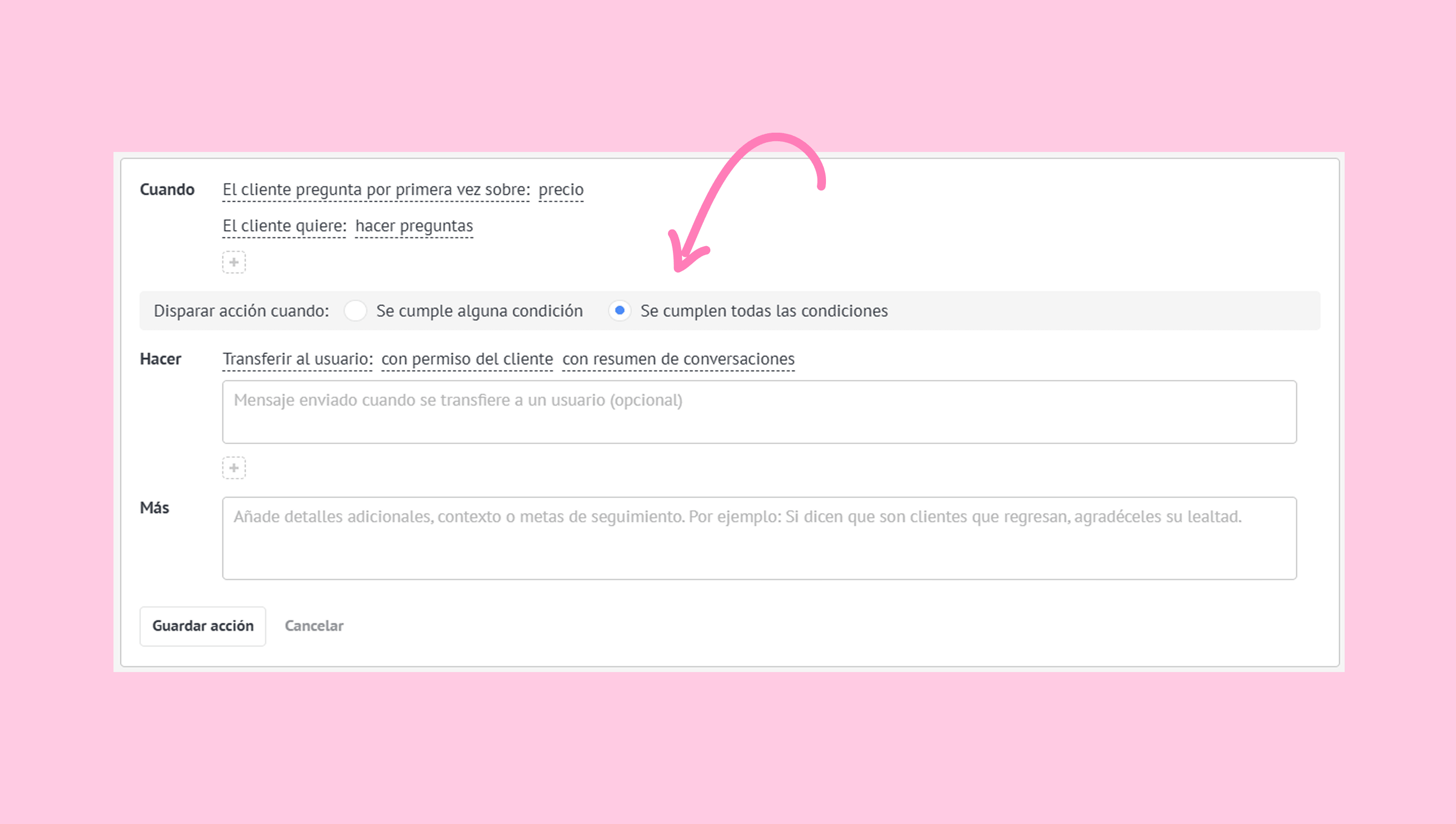Selecciona la opción para activar la acción cuando se cumplan todas las condiciones. Esto garantiza que la acción se ejecute cuando el cliente muestre intención de compra inicial y haga una pregunta previa a la compra.