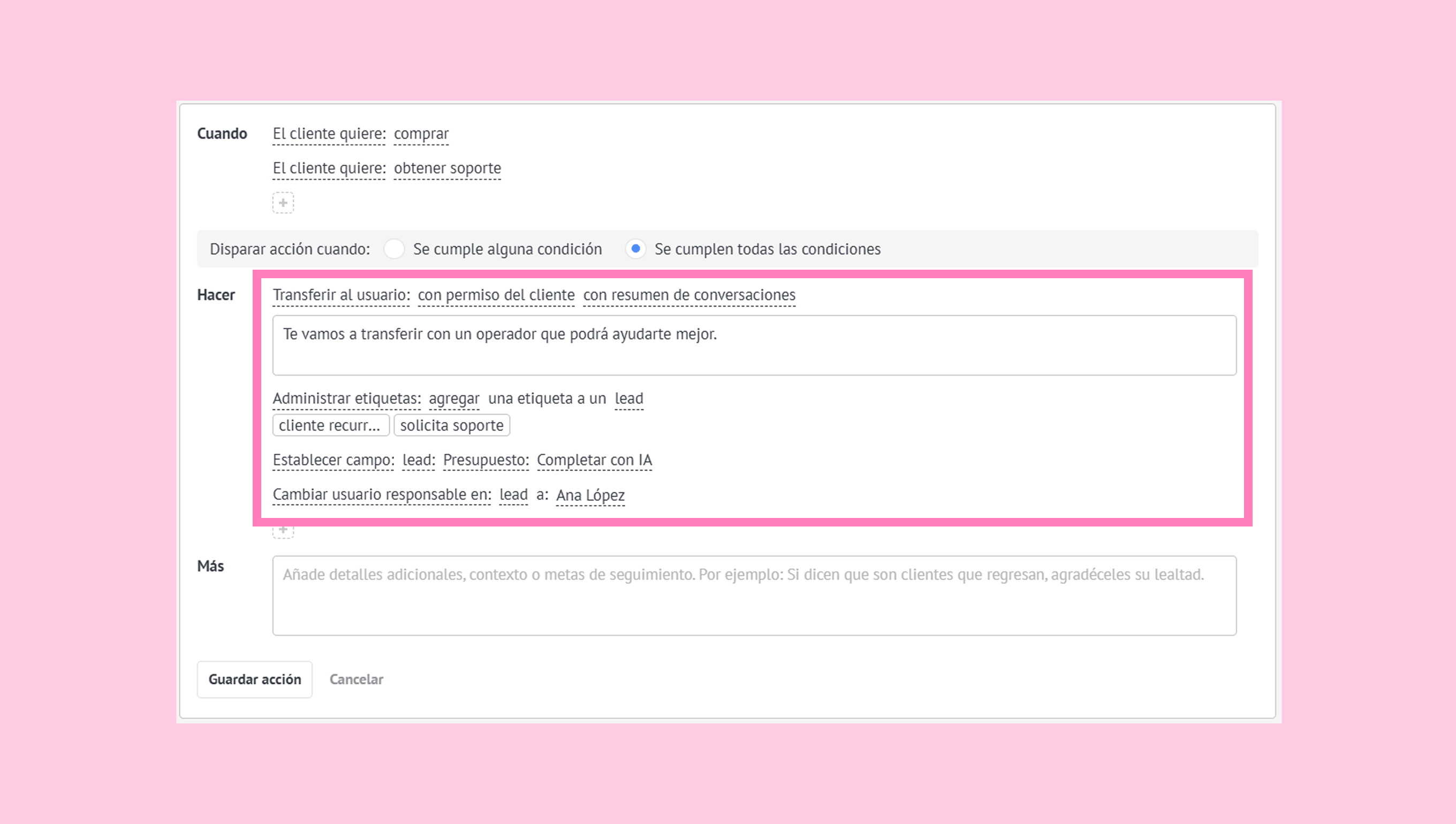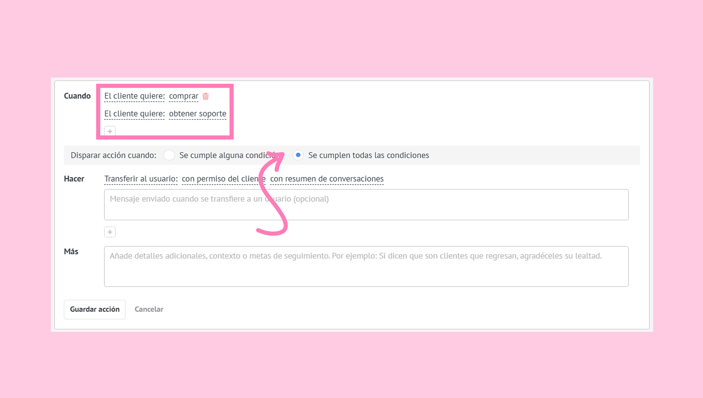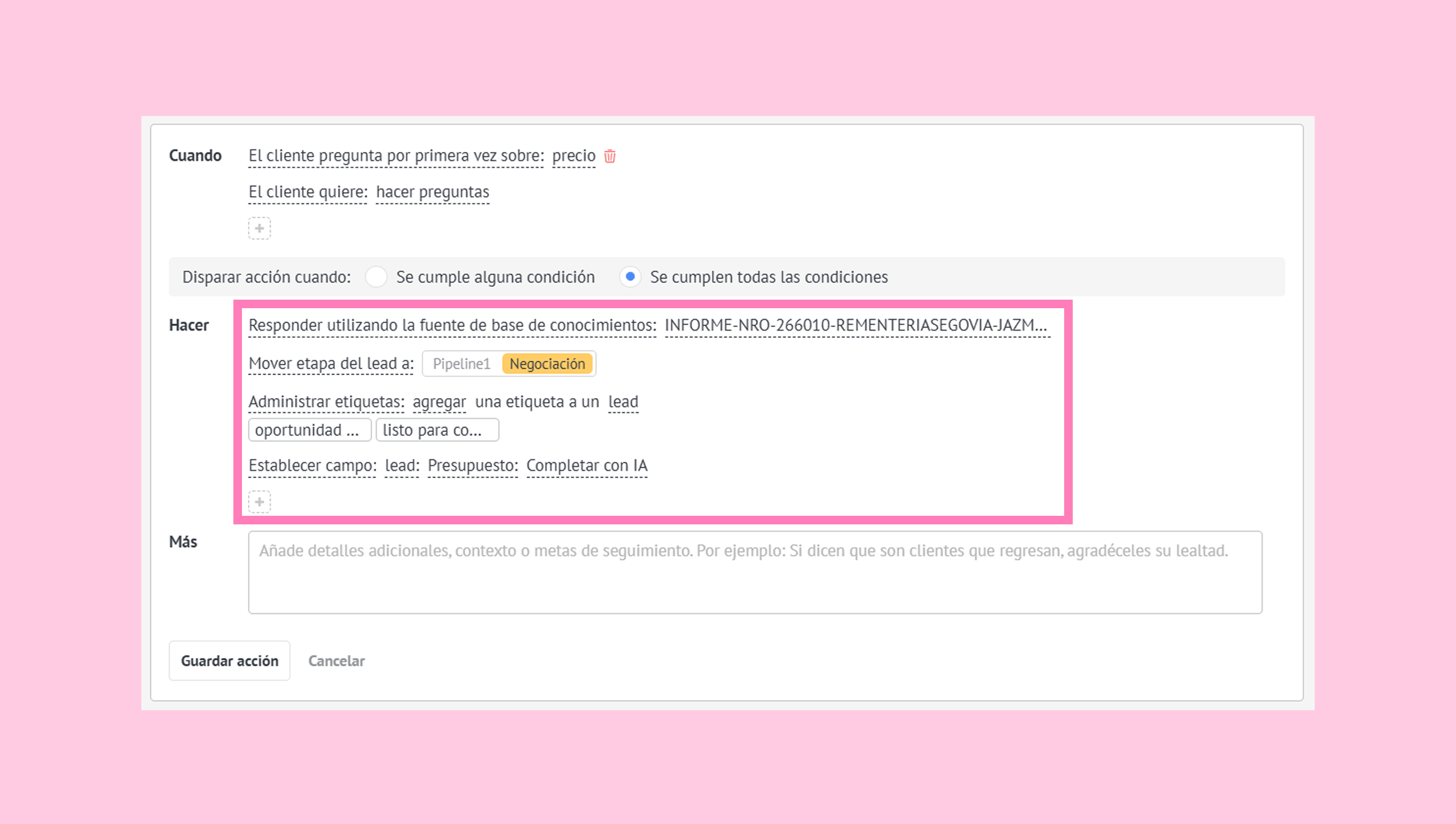 Selecciona la opción para activar la acción cuando se cumplan todas las condiciones. Esto garantiza que la acción se ejecute cuando el cliente muestre intención de compra inicial y haga una pregunta previa a la compra.