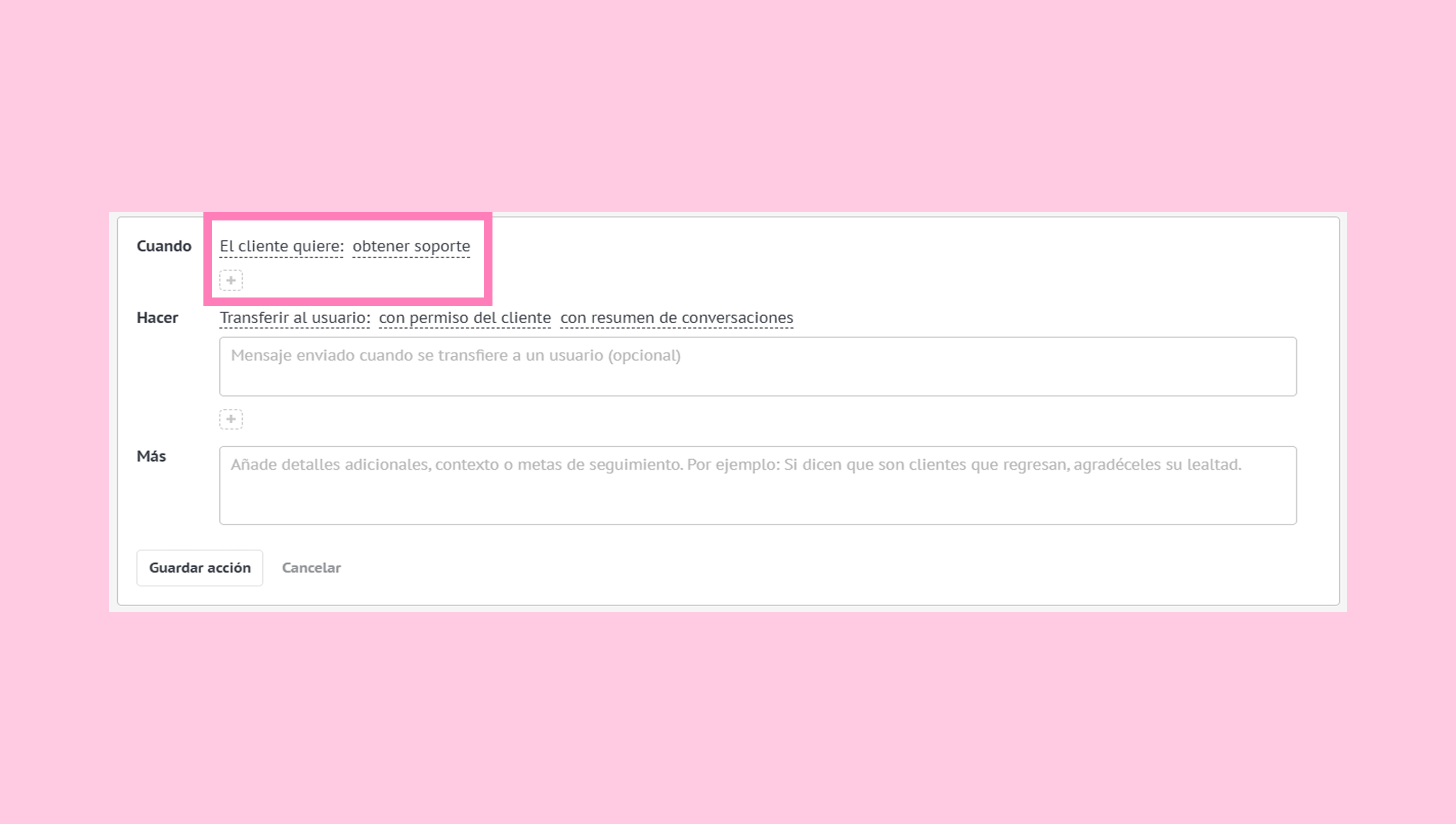 En el campo CUANDO, elige la condición El cliente quiere: obtener soporte.