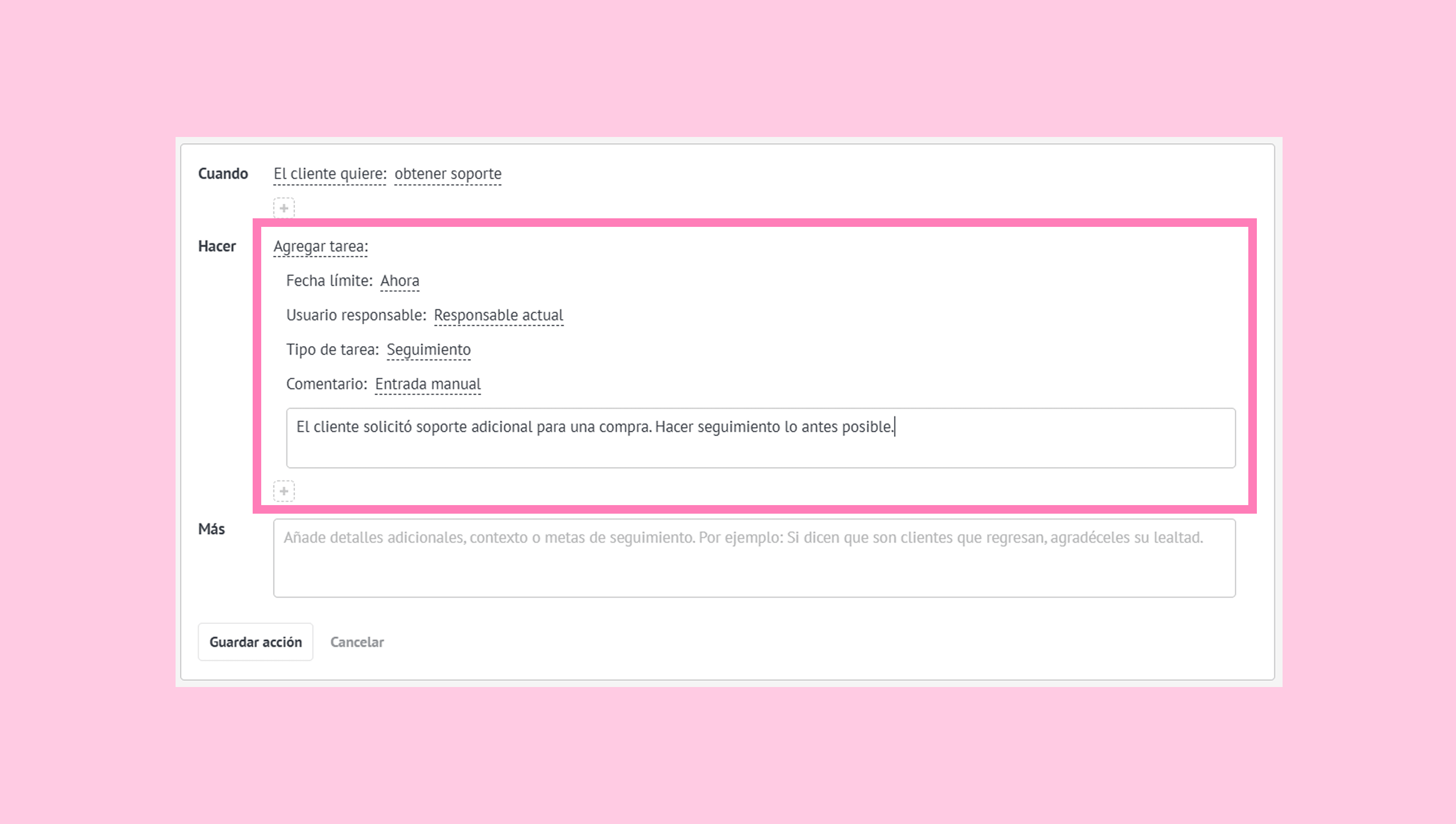 Para la acción HACER, selecciona Agregar tarea para crear una tarea para el usuario responsable del lead, así pueden hacer un seguimiento lo antes posible. Puedes incluir una nota breve en la tarea que explique en qué necesita ayuda el cliente, por ejemplo: 'El cliente solicitó soporte adicional para una compra. Hacer seguimiento lo antes posible'.
