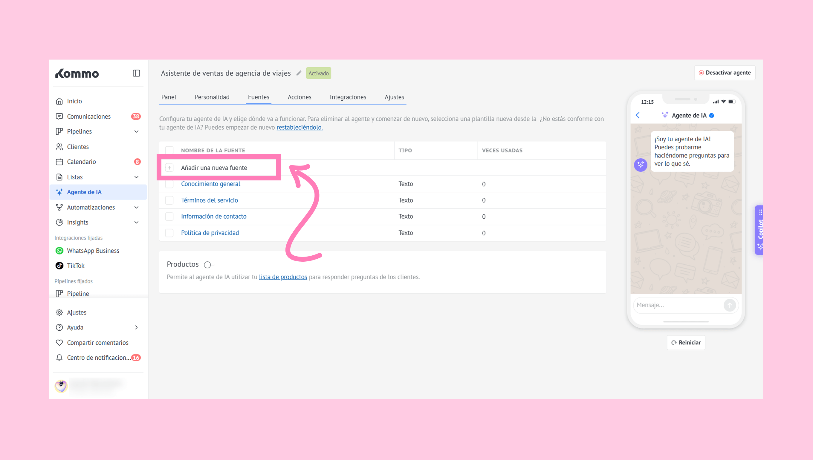 Ve a la pestaña Fuentes y agrega una fuente de conocimiento con las preguntas frecuentes de tu negocio. Esto puede incluir información como precios, tiempos de entrega, métodos de pago o preguntas comunes antes de la compra.