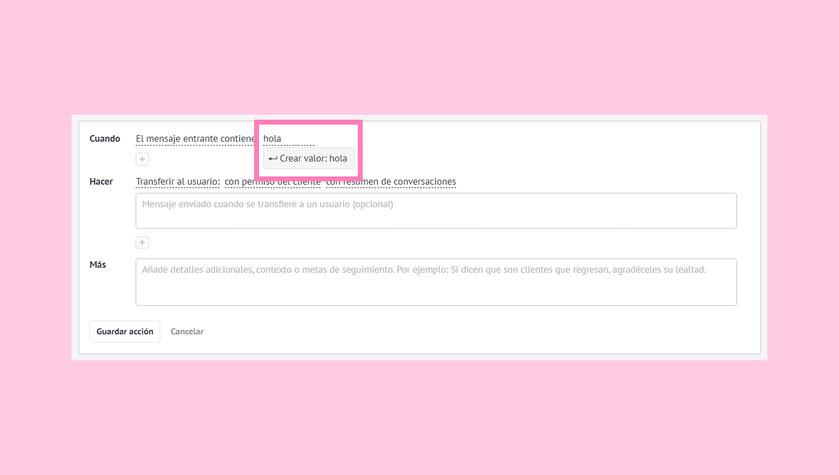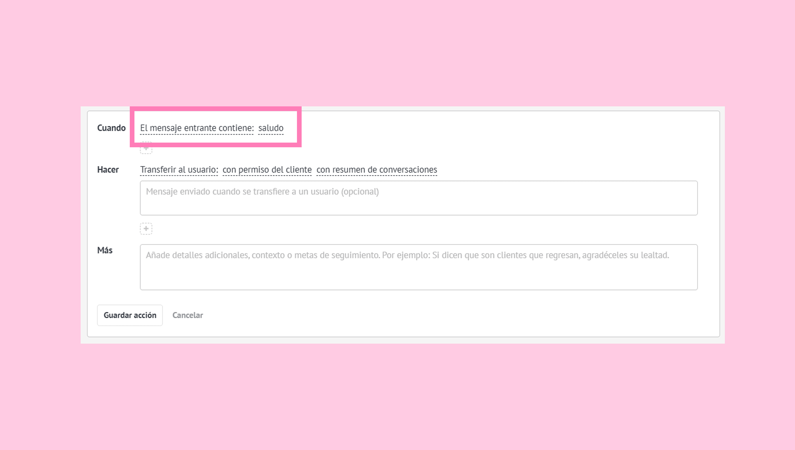 También puedes escribir tu propia condición CUANDO personalizada manualmente y presionar Enter para guardarla. Por ejemplo: agregar frases como hola o buenos días.