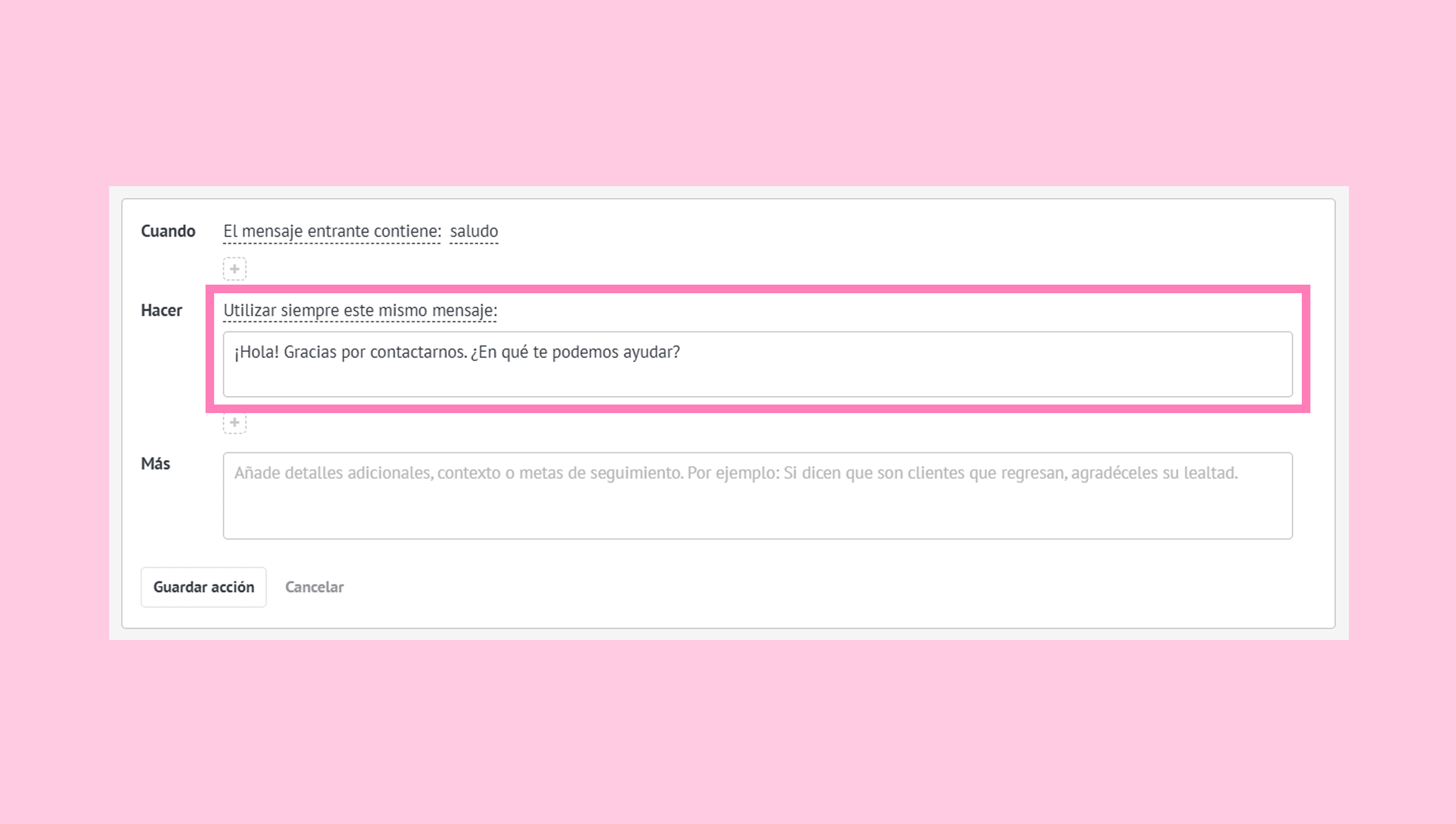En el campo HACER, selecciona la acción Utilizar siempre este mismo mensaje y añade un mensaje de bienvenida. Por ejemplo: '¡Hola! Gracias por contactarnos. ¿En qué te podemos ayudar?'.