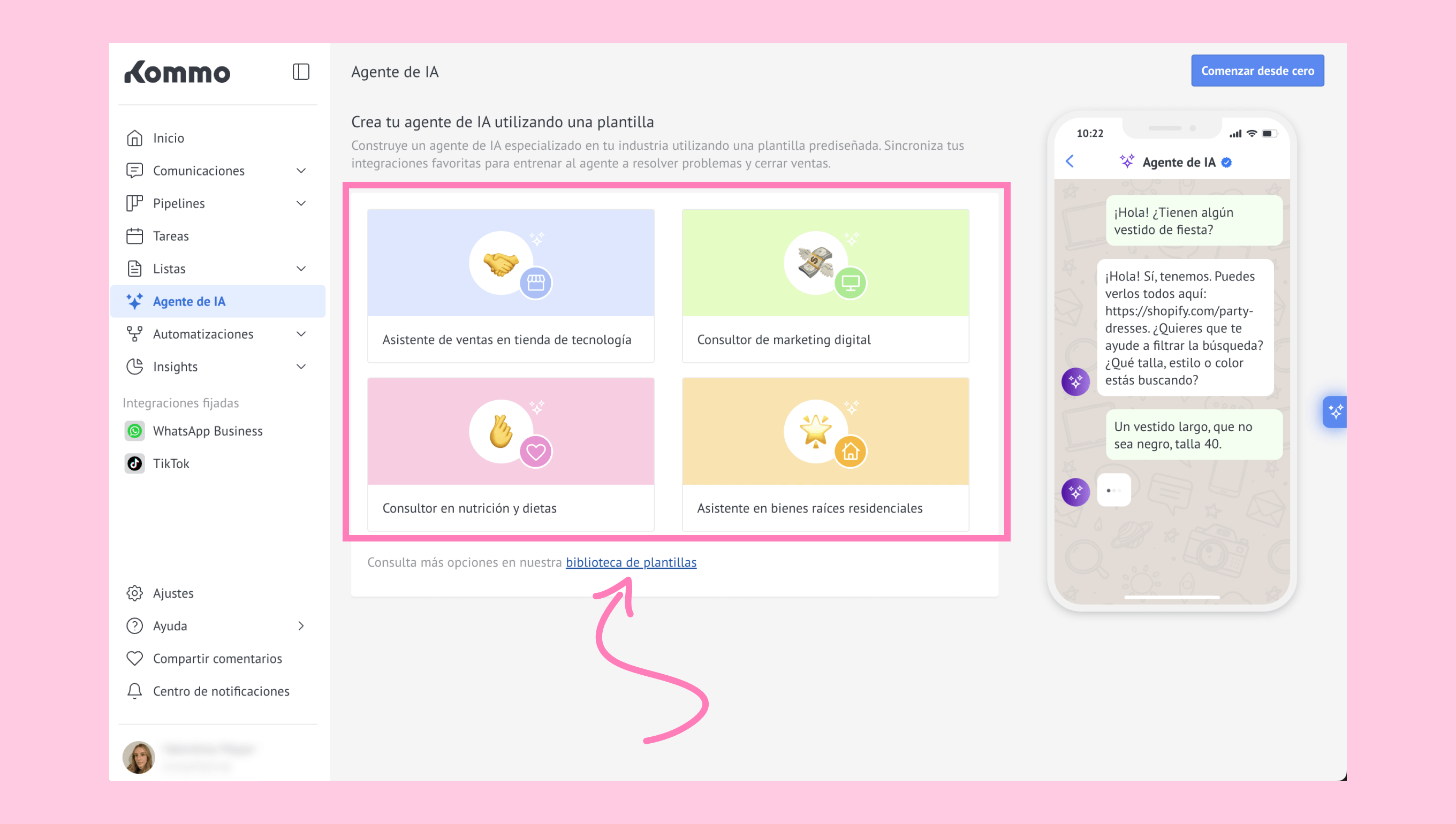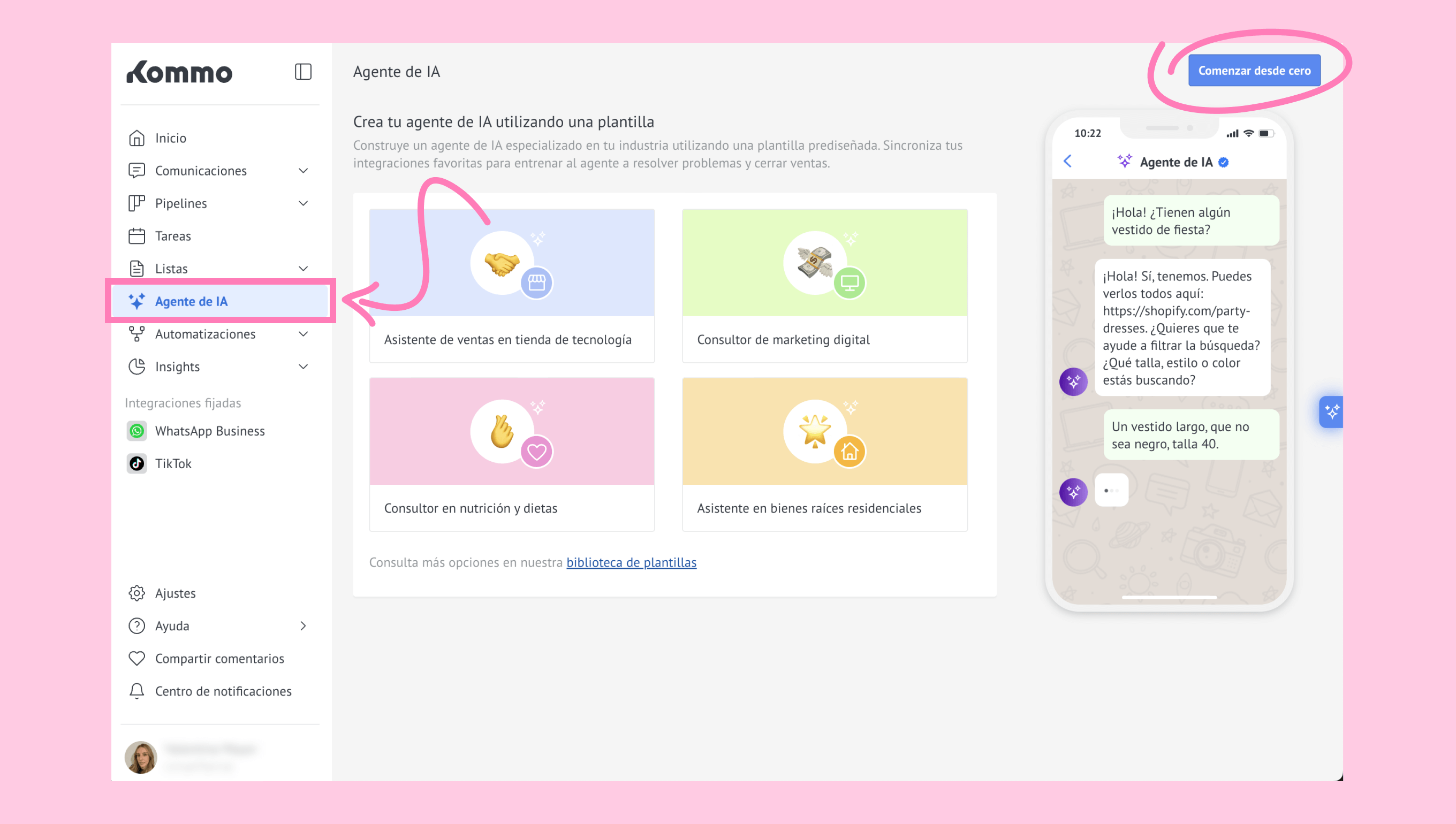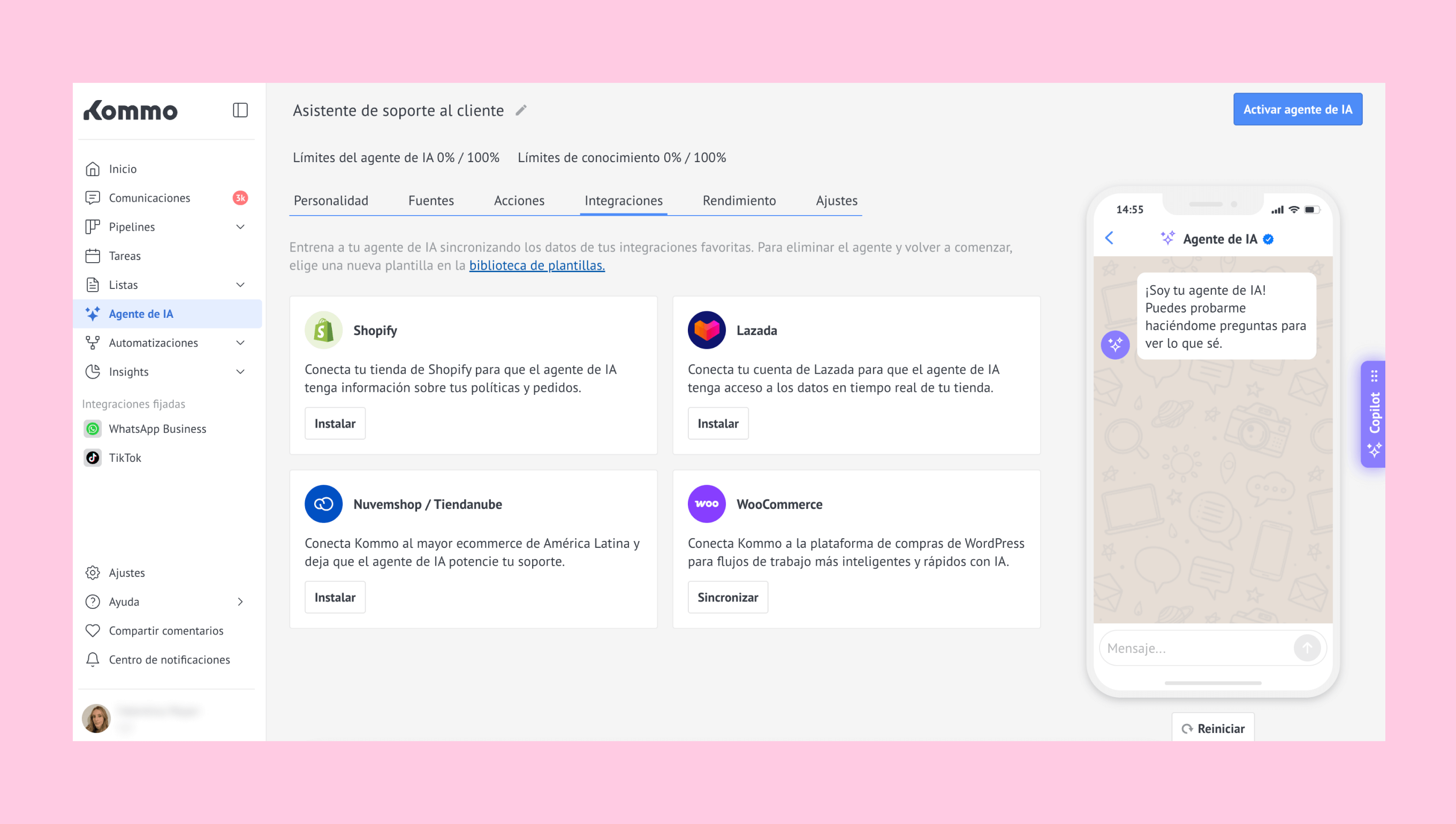 Los negocios de e-commerce pueden conectar varias plataformas a un solo agente de IA en Kommo para automatizar chats y gestionar consultas de la tienda.