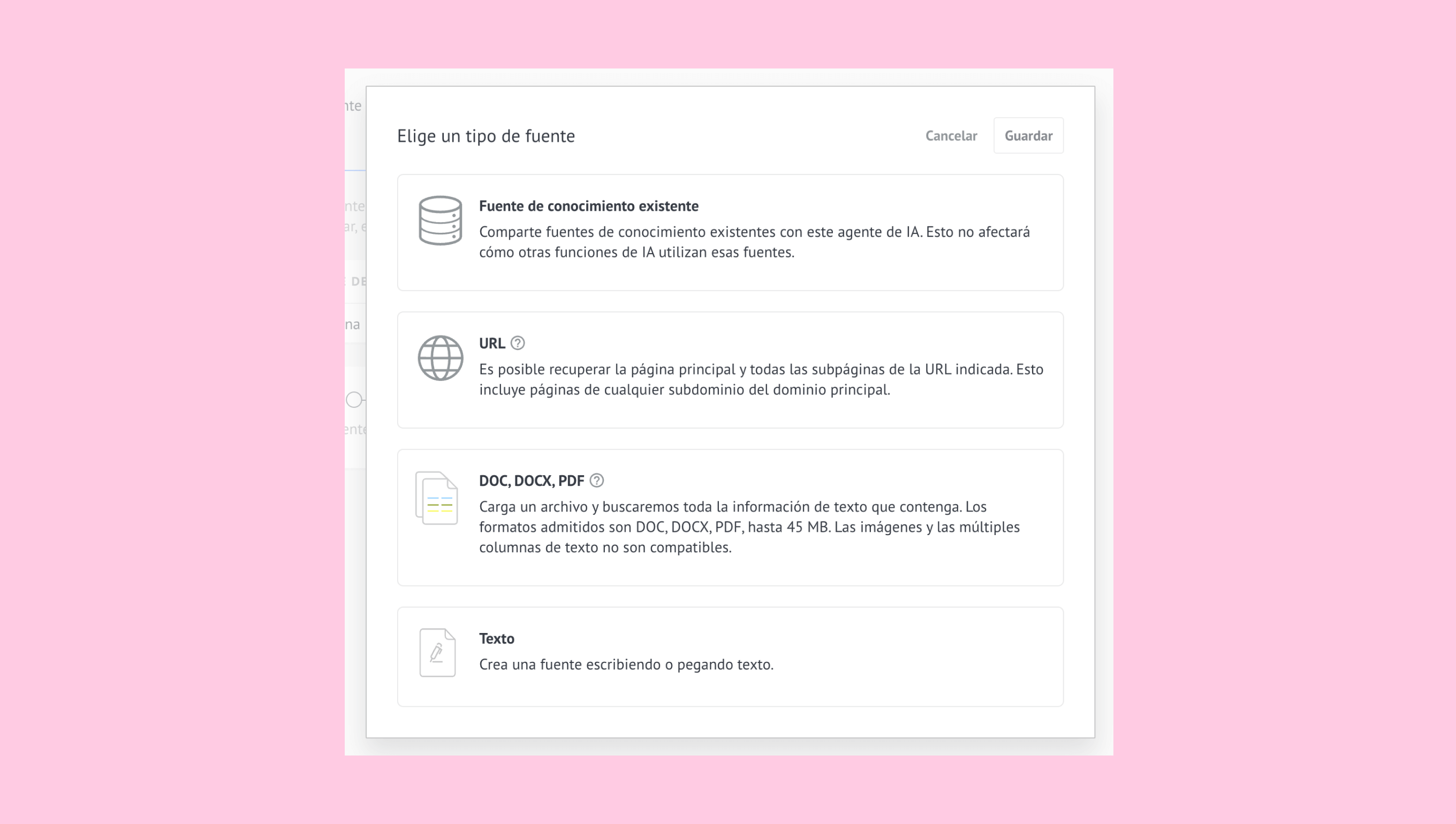 Nota: Para seleccionar una fuente que ya se subió anteriormente, haz clic en Fuente de conocimiento existente. No hay límite en la cantidad de fuentes cargadas que se pueden vincular al agente de IA.